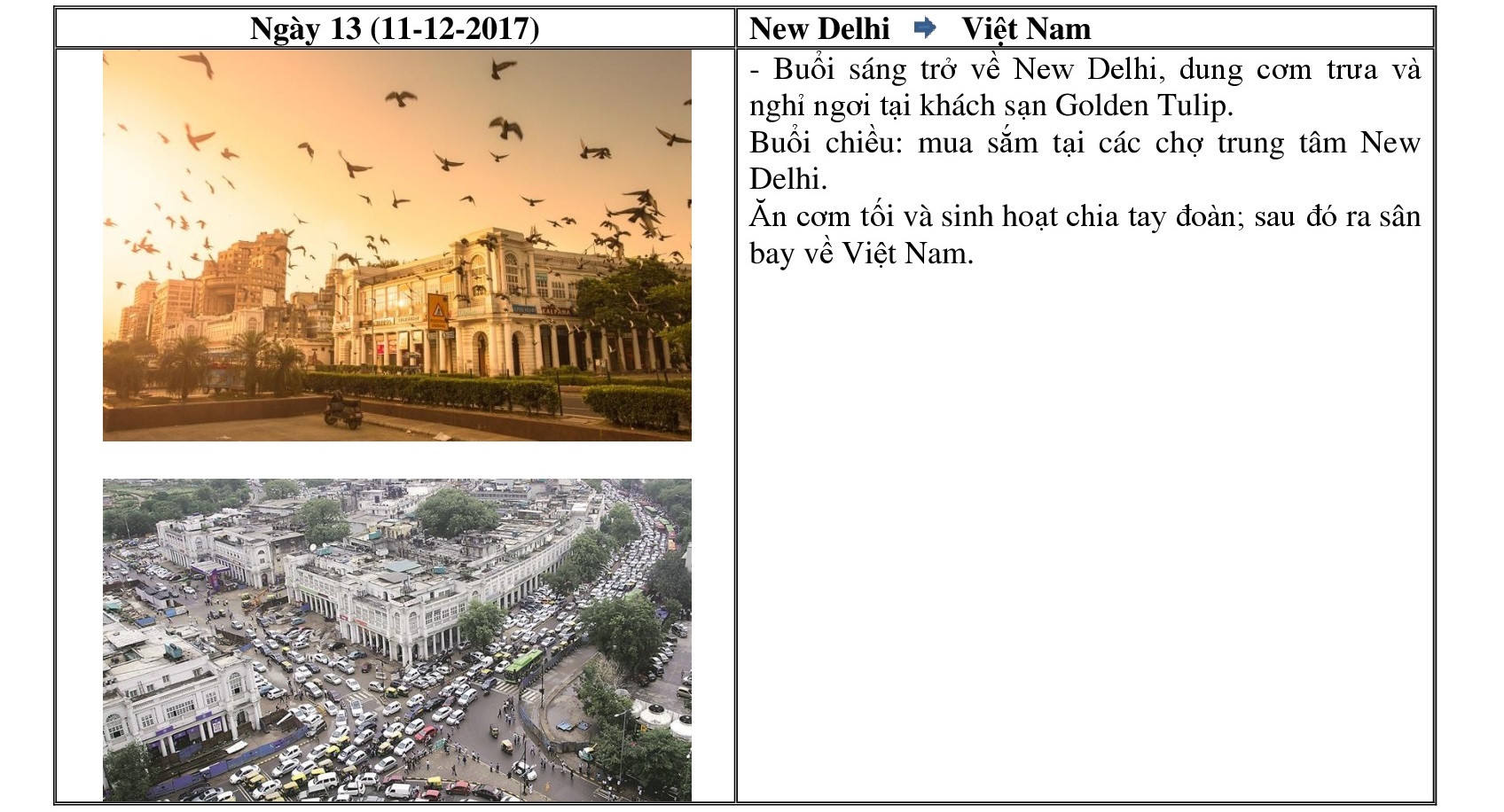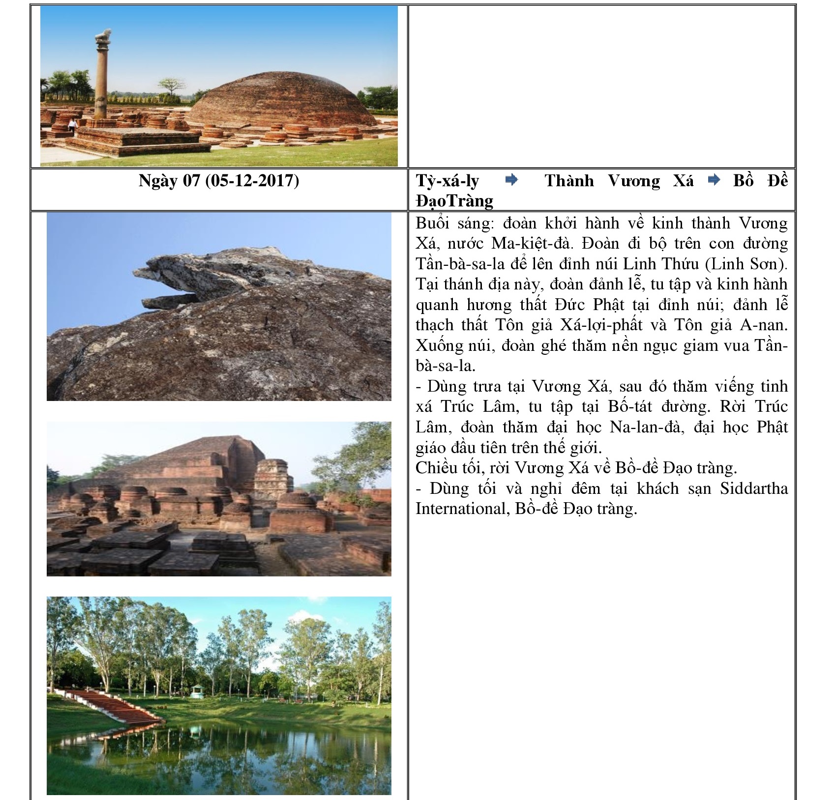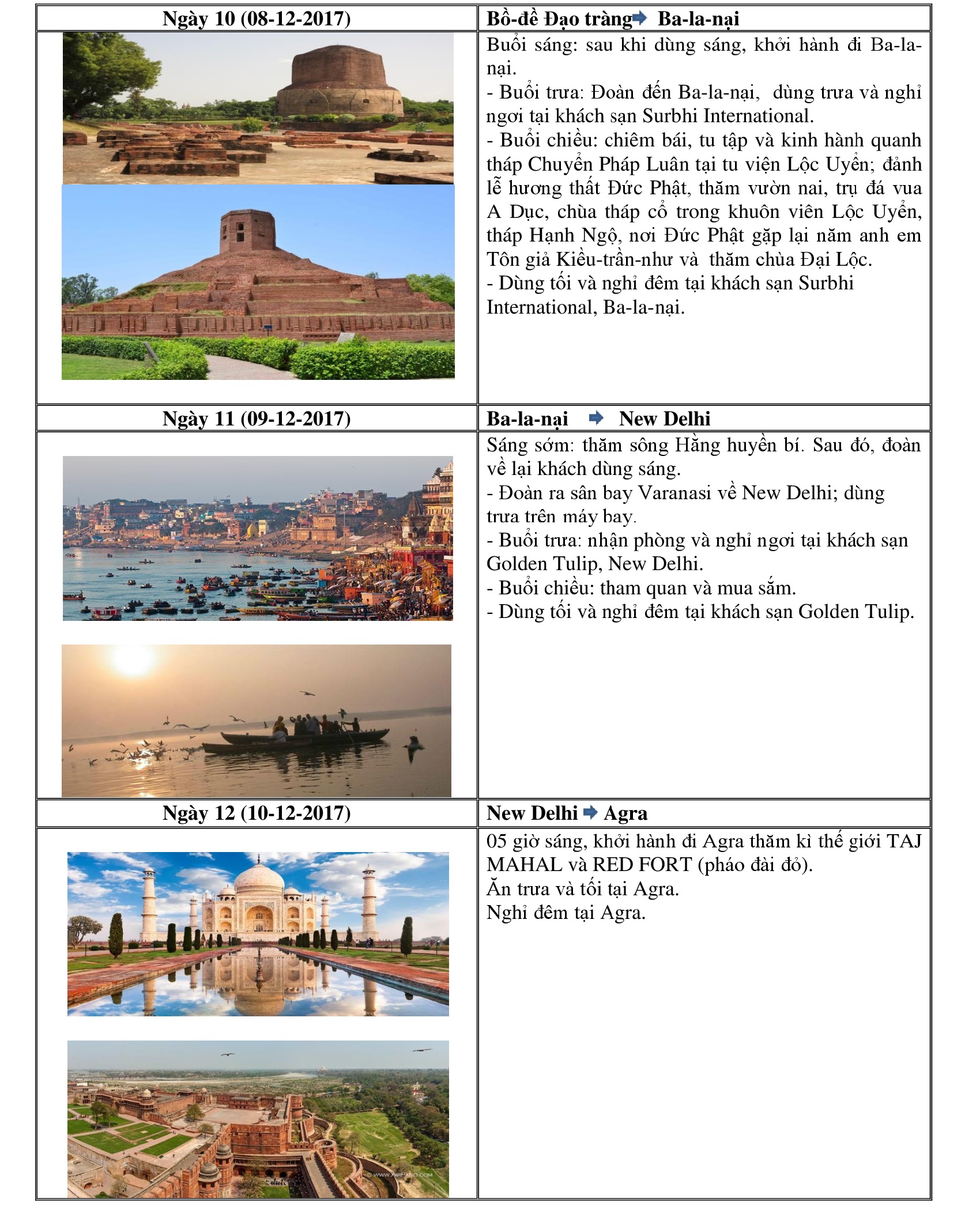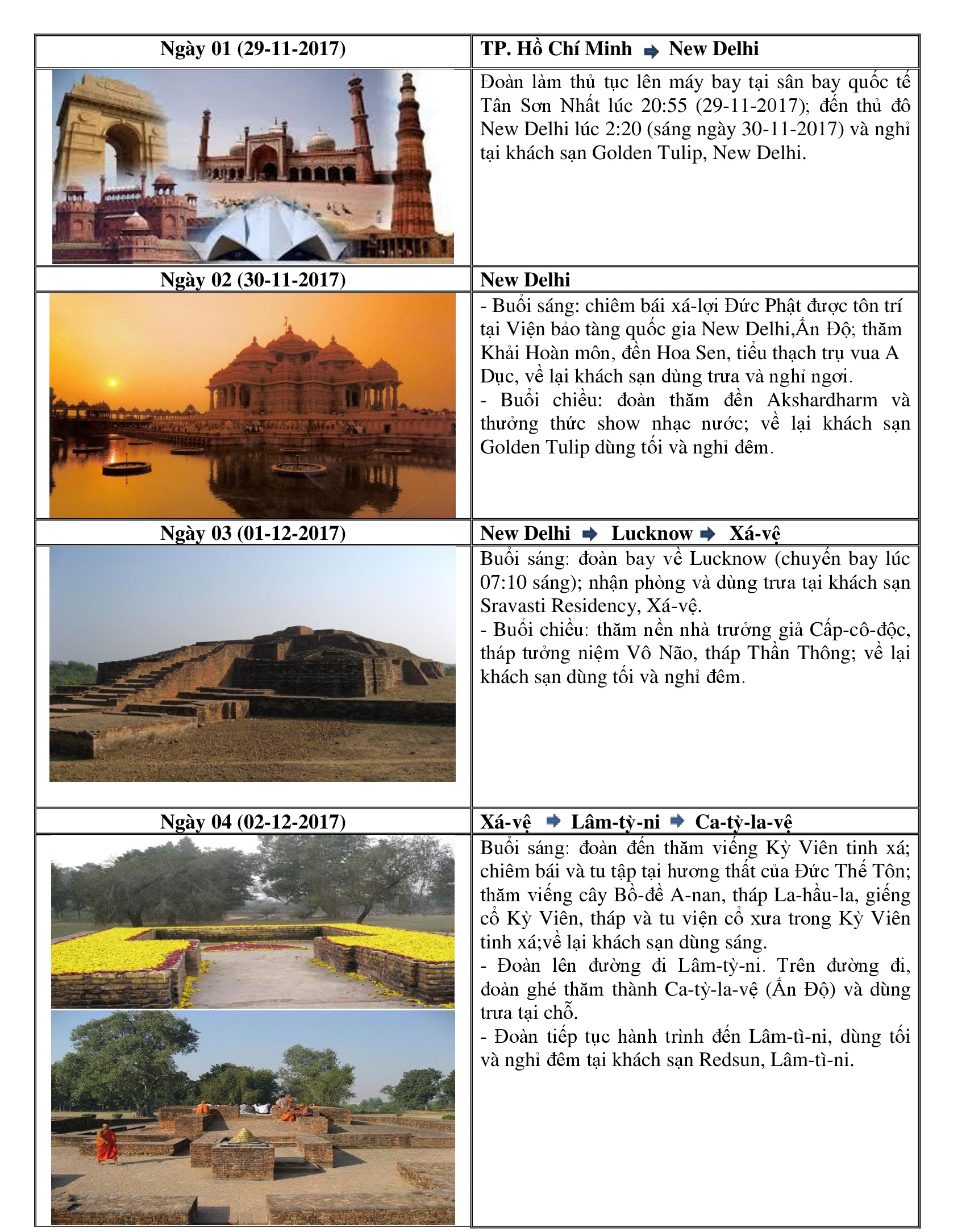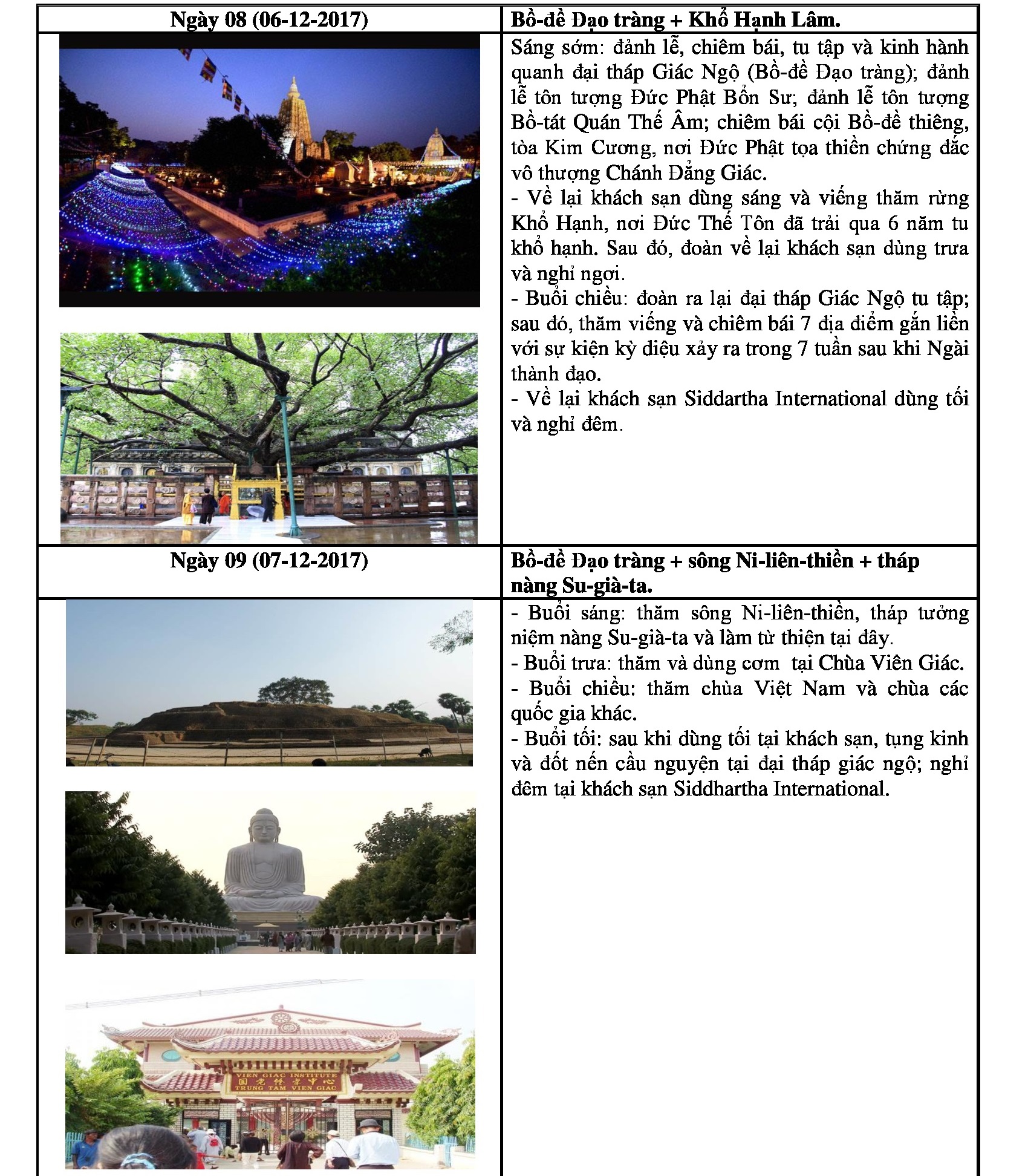 Lâm-tì-ni(Lumbini); Bồ-đề Đạo tràng(Bodhgaya); Ba-la-nại(Varanasi);Câu-thi-na(Kushinagar),Kỳ Viên Tinh xá (Xá-vệ Sravasti); Thành Ca-tỳ-la-vệ (Kapilavastu); Núi Linh Thứu (Gijjhakuta); Tinh xá Trúc Lâm (Venuvana); Đại học Na-lan-đà (Nalanda); Thành Tỳ-xá-ly (Vaishaly); Sông Hằng (Ganga); Xá-lợi Đức Phật tại Viện Bảo tàng Quốc gia New Delhi; Thành đỏ (Red Fort, gần Taj Mahal); Kì quan thế giới Taj Mahal.