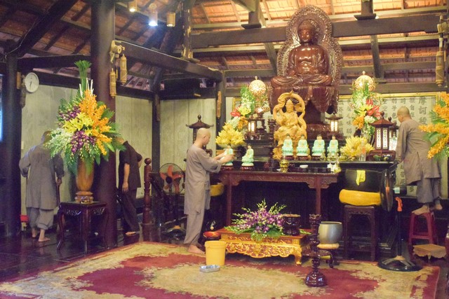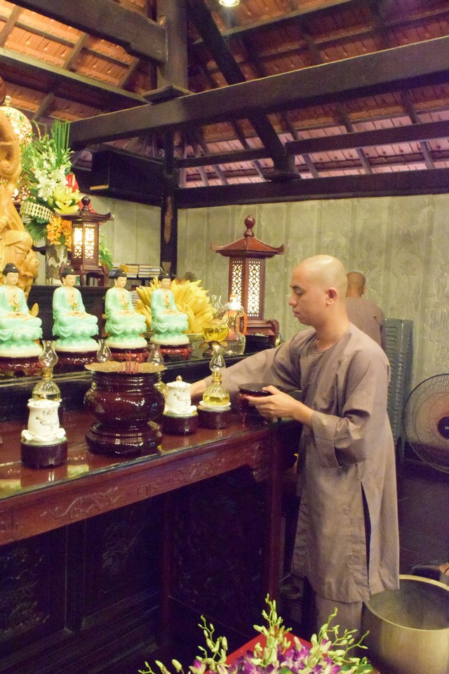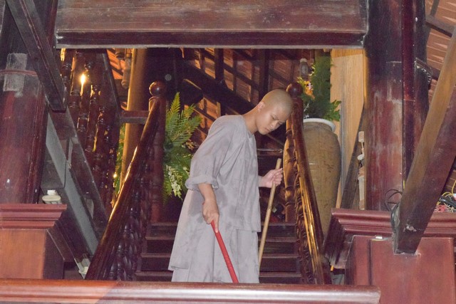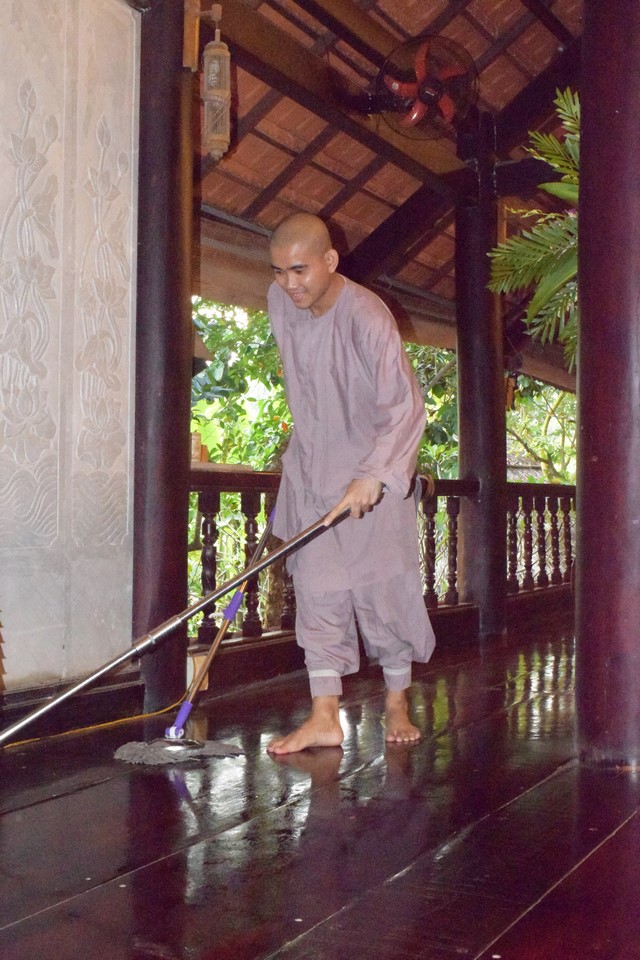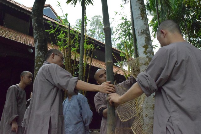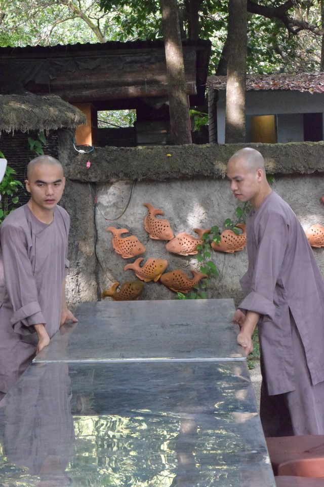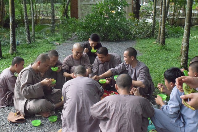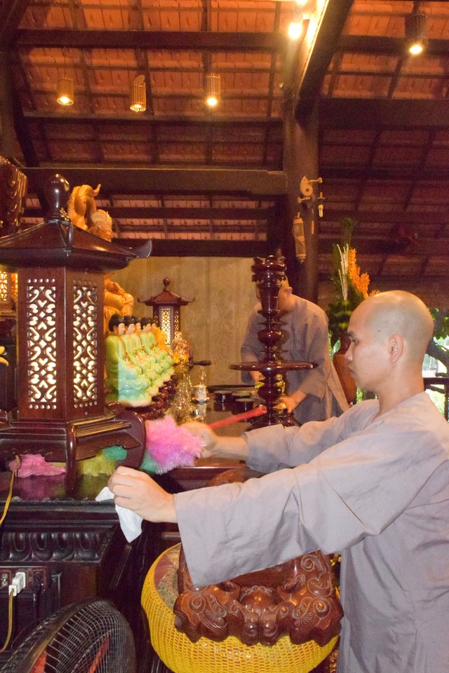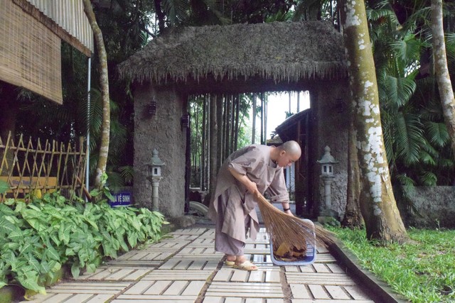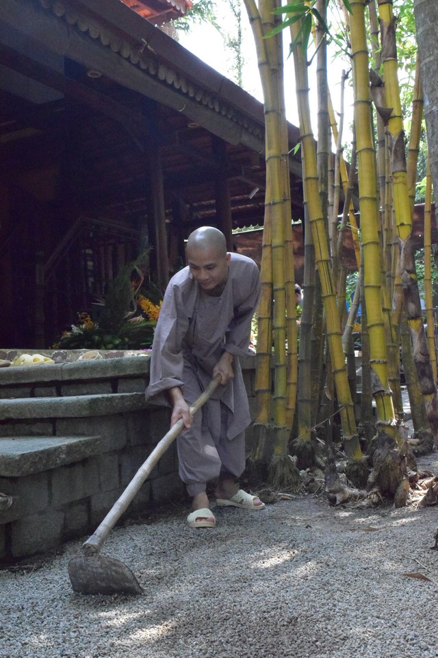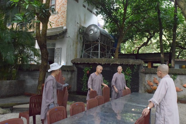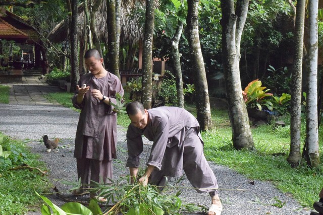 Mọi công tác chuẩn bị dần được hoàn thành và đã sẵn sàng cho lễ tự tứ. Trời đã xế chiều, ánh nắng nhạt dần càng làm cho không gian trầm lắng của Viện Chuyên Tu trở nên bình yên và tĩnh lặng hơn. Các thầy, các chú cùng nhau vui vẻ thu dọn cuốc, xẻng rồi trở về Tăng xá để vệ sinh cá nhân, dùng dược thạch và chuẩn bị cho khoá lễ tụng kinh Vu lan – Báo hiếu vào buổi tối.