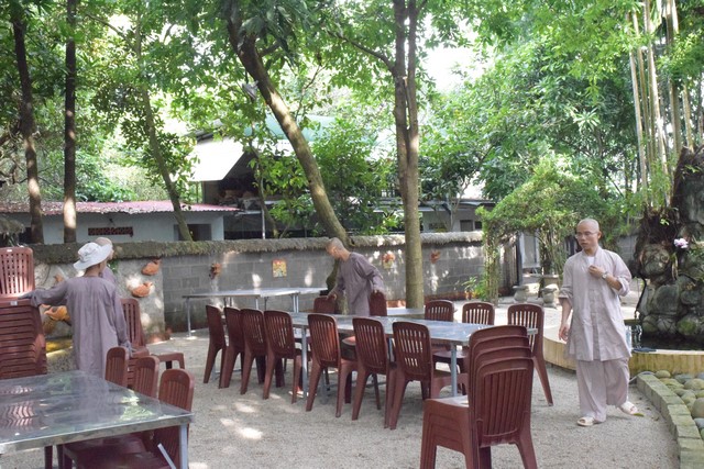 Công tác chuẩn bị cho lễ tự tứ năm nay có phần cẩn thận và kỹ lưỡng vì Phật tử đăng ký về tham dự đông hơn mọi năm. Suốt hơn một tuần qua, mọi công tác Phật sự của đại chúng Viện Chuyên Tu đều tập trung cho ngày lễ, người cắt cỏ, người cào đá, rồi ban đất, dựng rạp, kê bàn ghế… để có không gian cho Phật tử về tham dự mà không lo bị mưa ướt. Những nhánh cây khô, những tàng cây um tùm đều được tỉa lại cho gọn gàng để không gian khuôn viên chùa trở nên thoáng đãng. Các khu vực như Chánh điện, nhà khách, sân vườn.. đều được dọn dẹp tươm tất. Lễ phẩm cúng dường chư Tôn Đức cũng như thực phẩm cho khâu ẩm thực cũng đã được chuẩn bị đầy đủ, chu đáo. Các thầy, các chú mỗi người một việc, ai nấy đều bận rộn nhưng nụ cười vẫn luôn tỏa rạng trên từng gương mặt, mệt mà vui, mồ hôi nhễ nhại nhưng tinh thần tràn đầy hỷ lạc. Đến giờ giải lao, bên đồi cỏ thơm mới cắt, dưới tàng cây xanh mát và thoáng đãng trong vườn chùa, các thầy, các chú tranh thủ chia nhau từng ly nước, củ khoai, trái chôm chôm chín mọng, chén mỳ gói nấu vội… tất cả đều vui cười, cùng hòa nhịp bằng trái tim tương thân tương ái trong không gian yên bình của Viện Chuyên Tu.