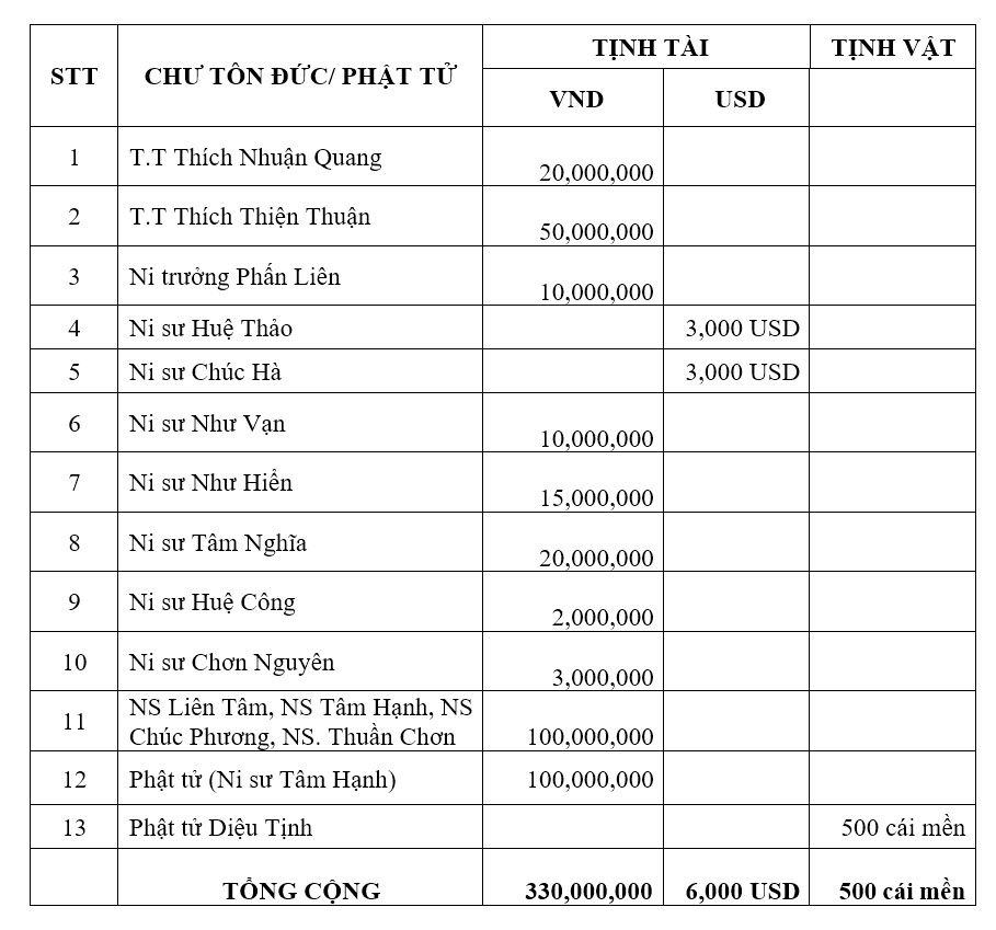 Hành trình 3 ngày tại miền Trung đã thành công viên mãn, với tổng giá trị hàng hóa và tiền mặt lên đến 520 triệu đồng. Đây là kết tinh của lòng từ bi được vun đắp bởi vô số công đức của chư Tôn đức và quý Phật tử.