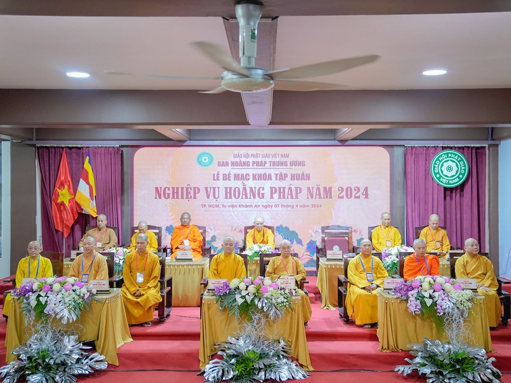 Sáng ngày 07/4/2024, nhằm ngày 29 tháng 2 năm Giáp Thìn, tại tu viện Khánh An, Quận 12, TP. Hồ Chí Minh, Ban Hoằng pháp Trung ương GHPGVN đã long trọng tổ chức lễ bế giảng Khóa Tập huấn Nghiệp vụ Hoằng pháp năm 2024 trong niềm hoan hỷ của chư Tôn đức Tăng Ni.