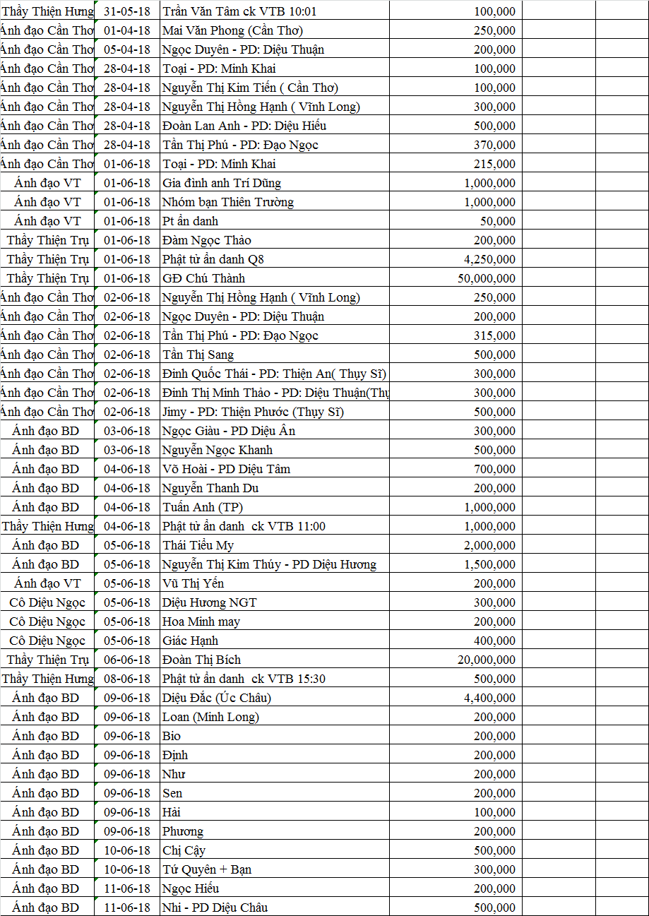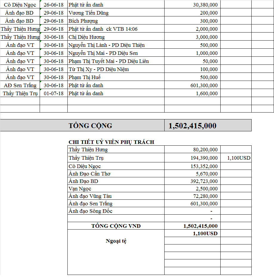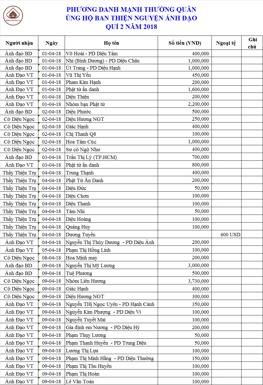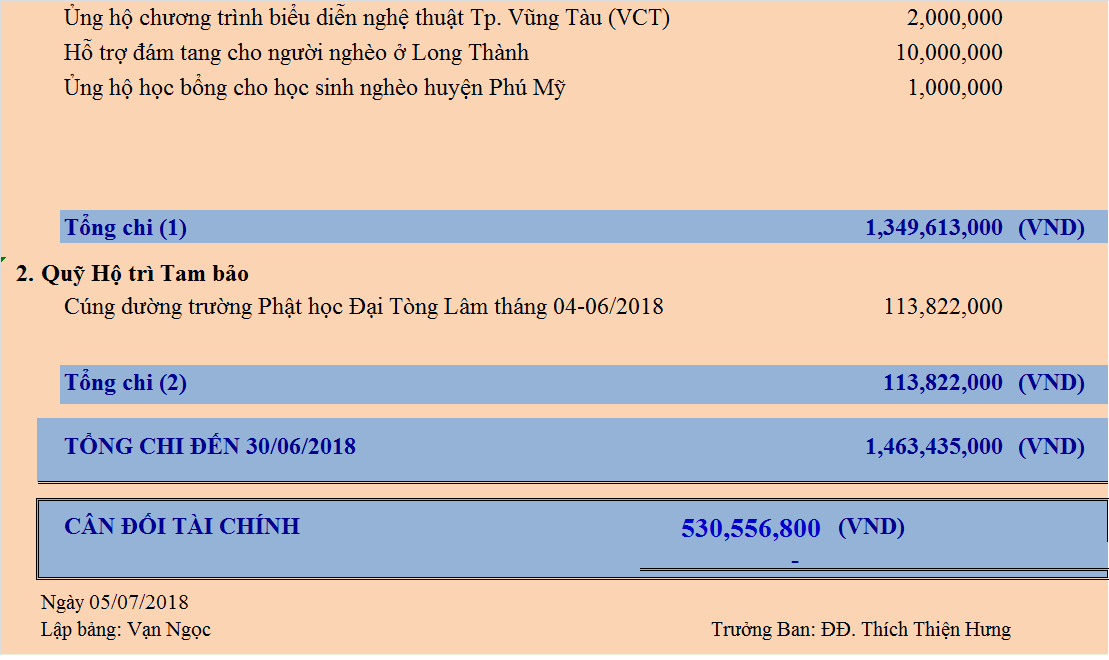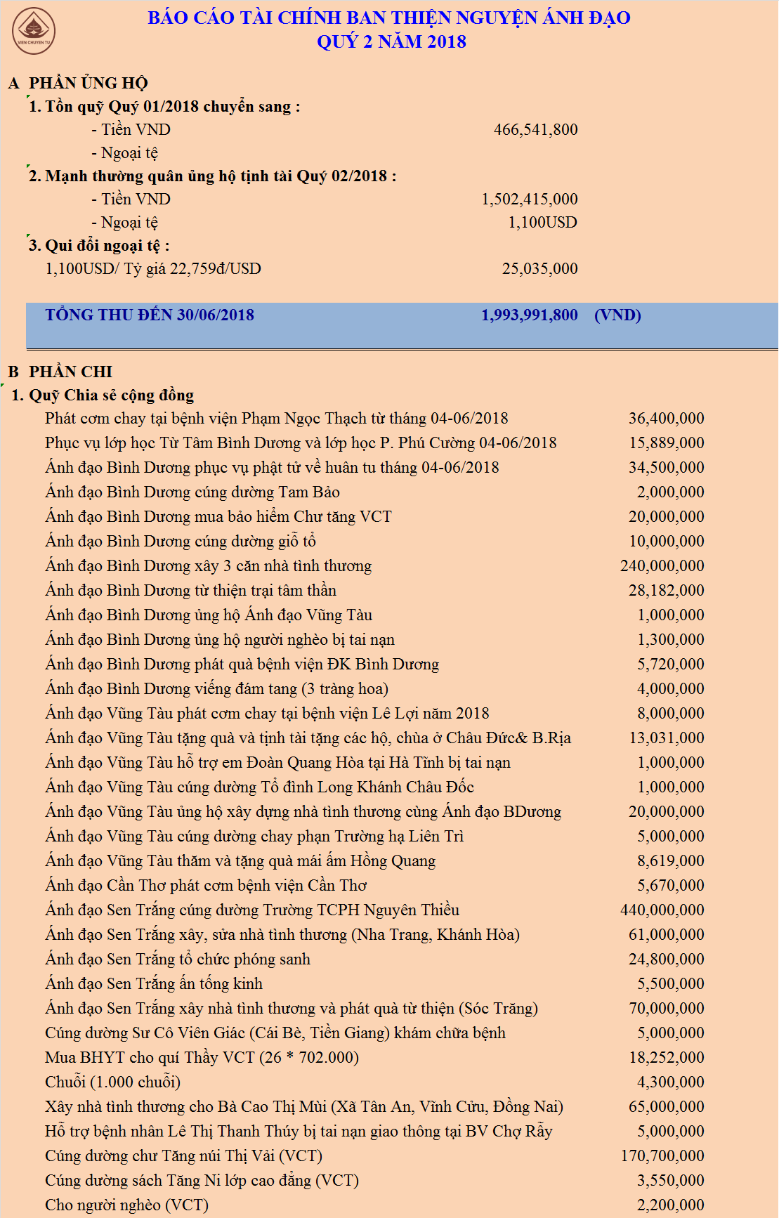 Ban Thiện nguyện Ánh Đạo Báo cáo Tài chánh Quý II – 2018