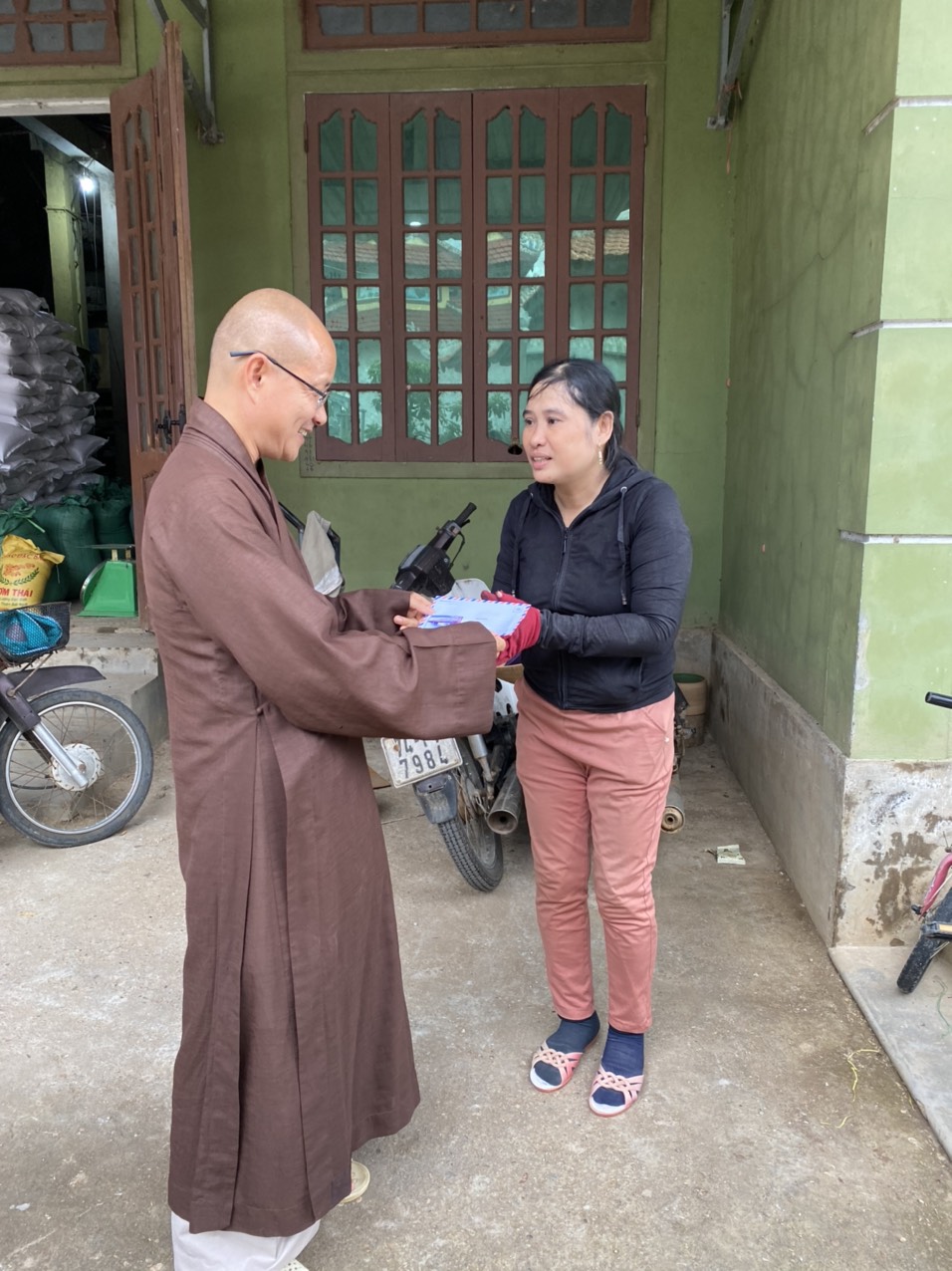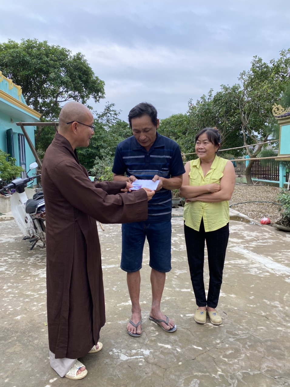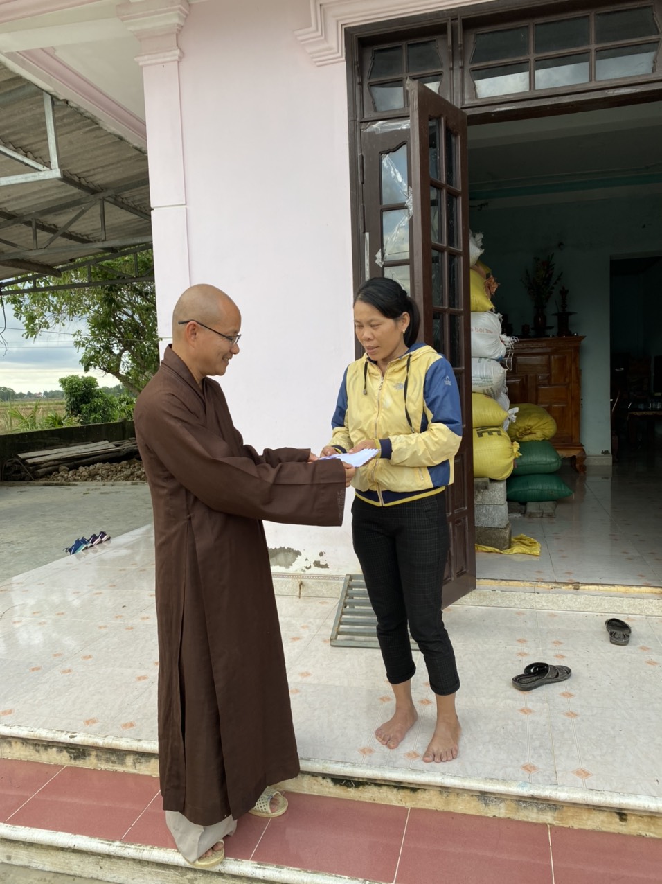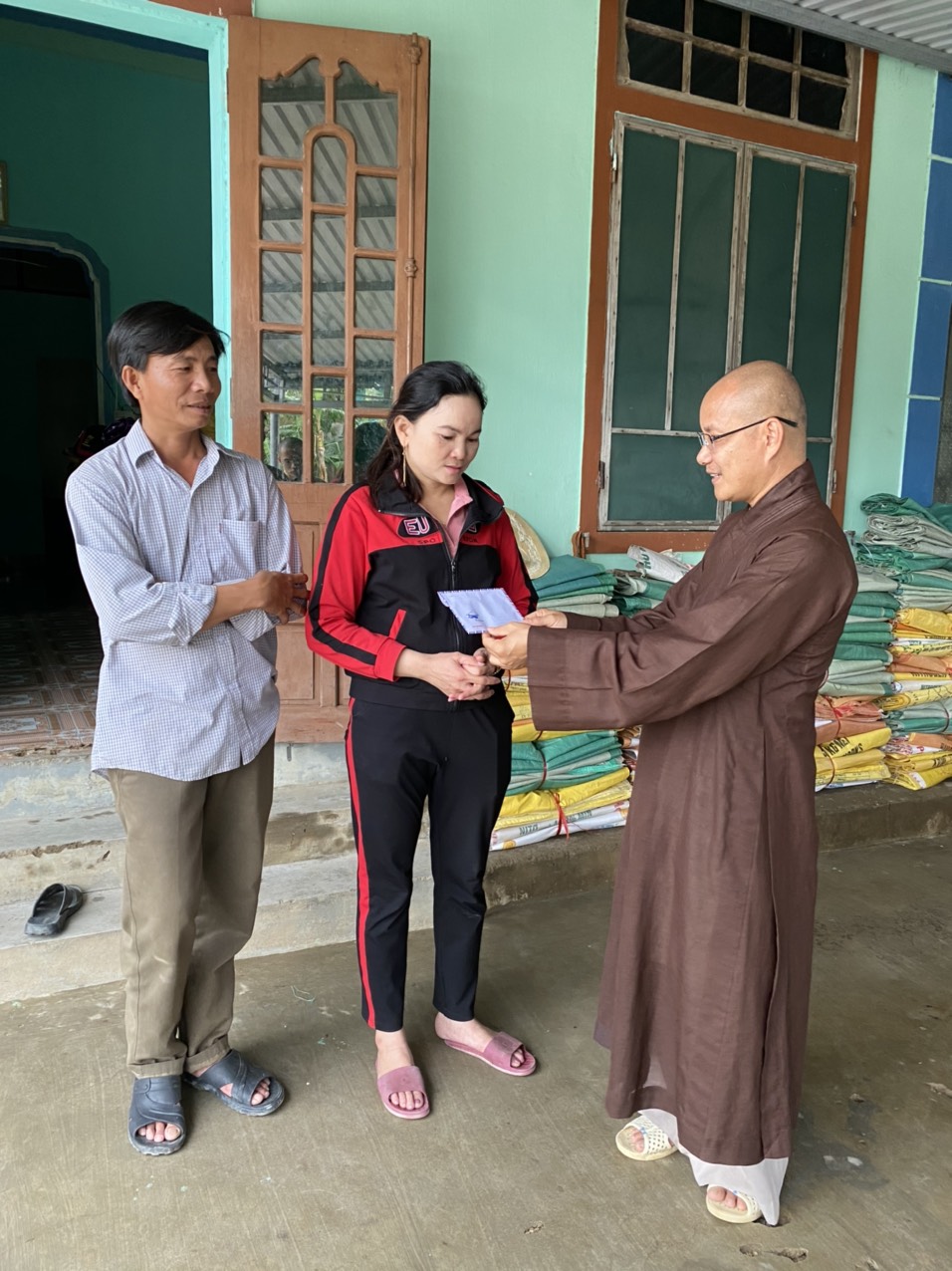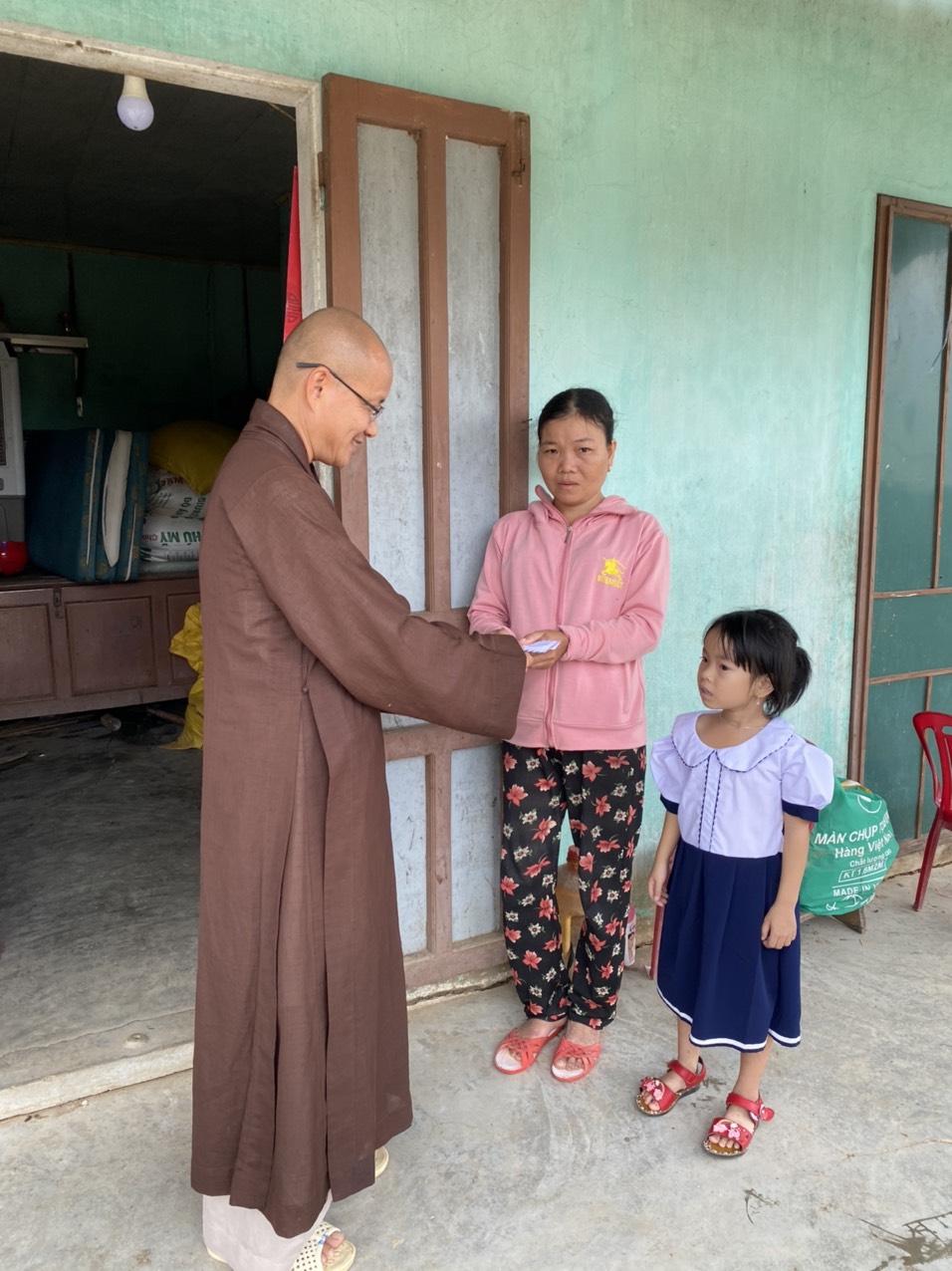 ĐĐ. Thích Thiện Hưng, Trưởng Ban Thiện Nguyện đại diện đoàn chia sẻ động viên bà con sớm ổn định cuộc sống. Đoàn đến thăm các cháu tại trường mầm non và trực tiếp đến 5 nhà có thiệt hại nặng nhất thôn, chia sẻ đến các hộ phần quà.