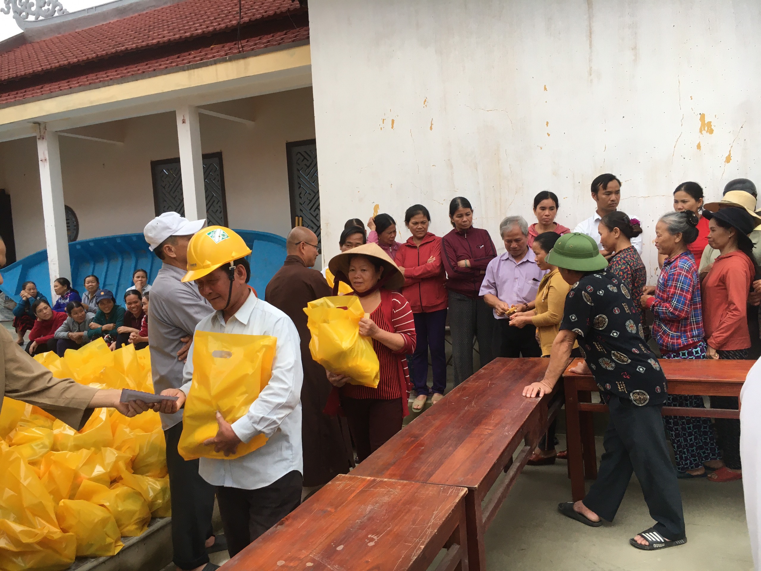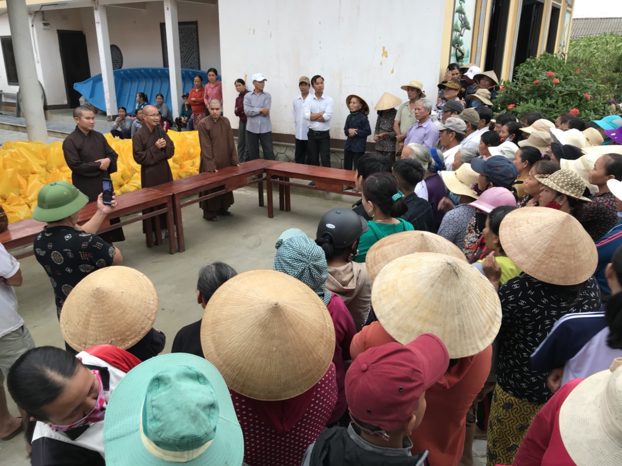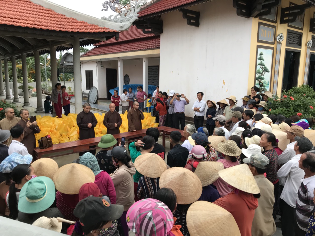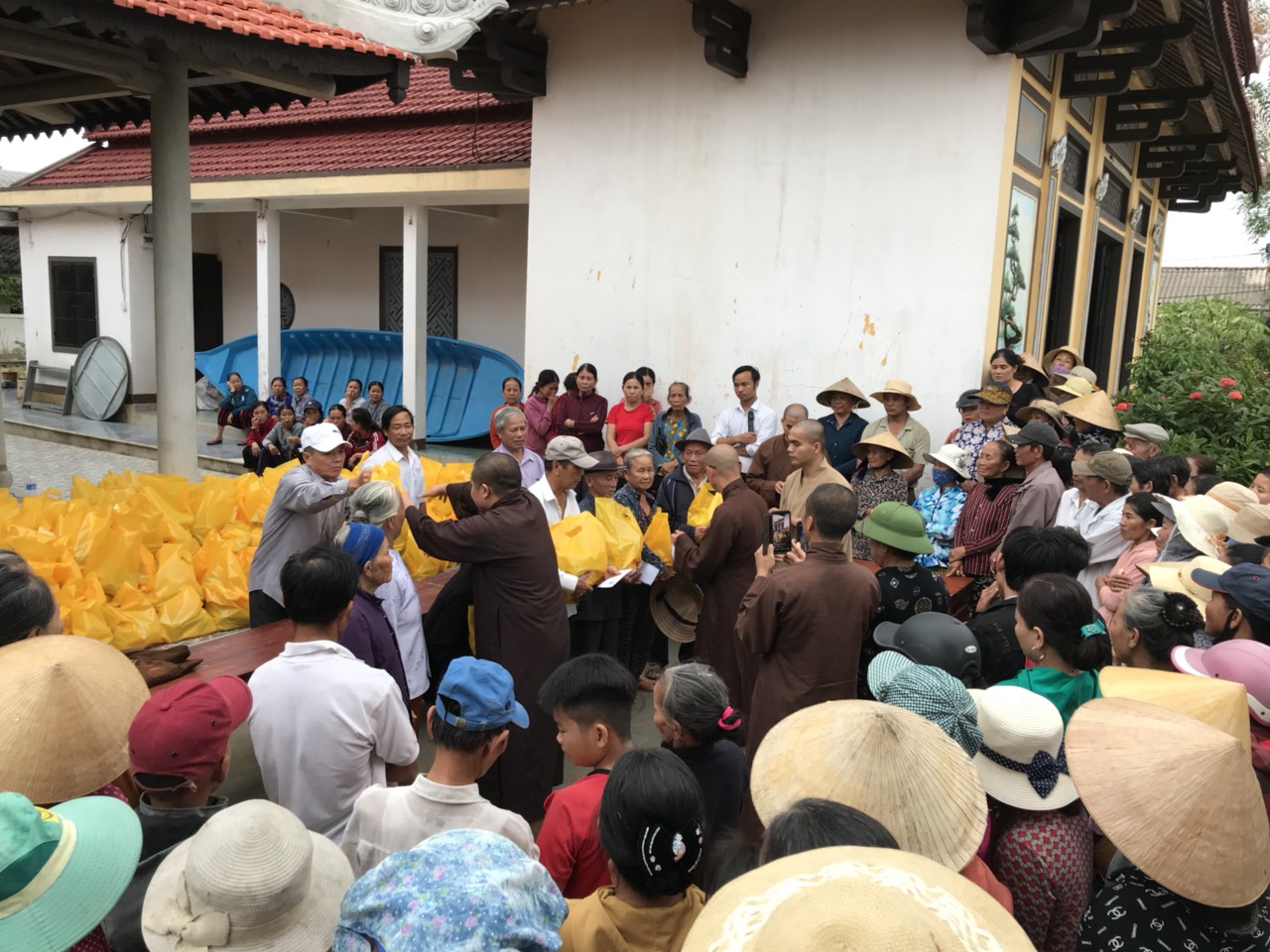 ĐĐ. Thích Thiện Hưng, Trưởng Ban Thiện Nguyện đại diện đoàn chia sẻ động viên bà con sớm ổn định cuộc sống. Đoàn đến thăm các cháu tại trường mầm non và trực tiếp đến 5 nhà có thiệt hại nặng nhất thôn, chia sẻ đến các hộ phần quà.