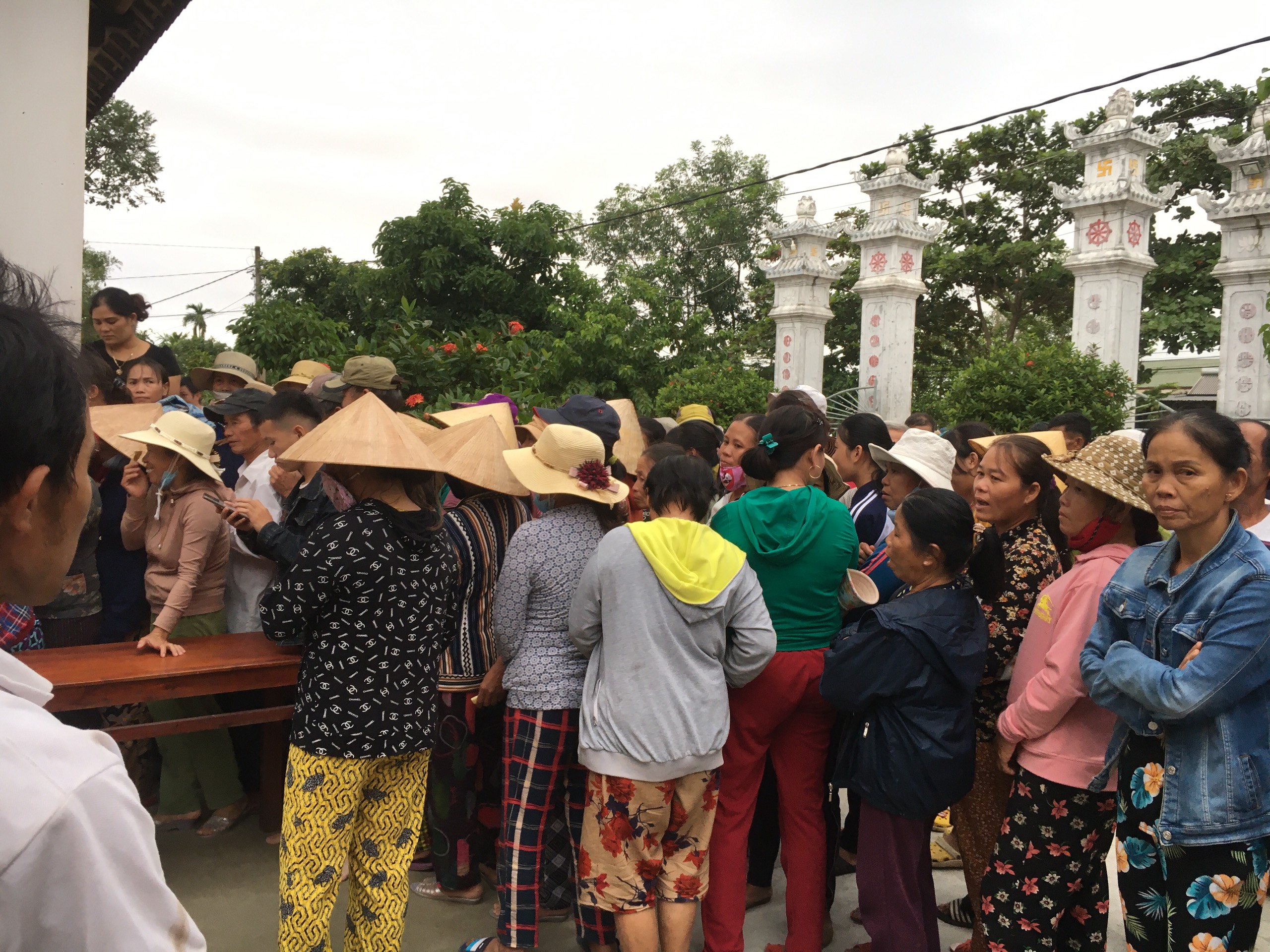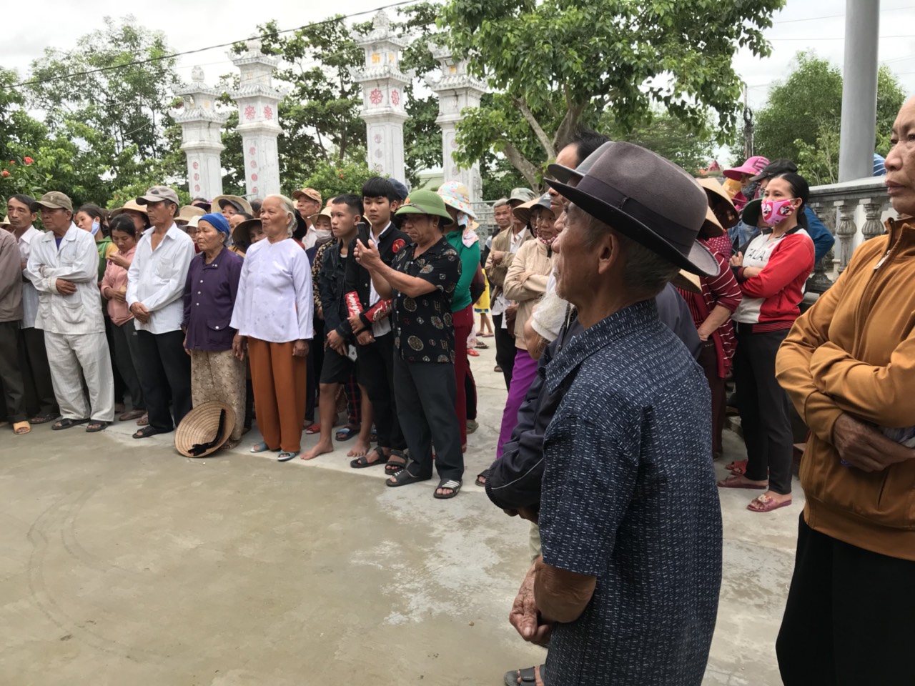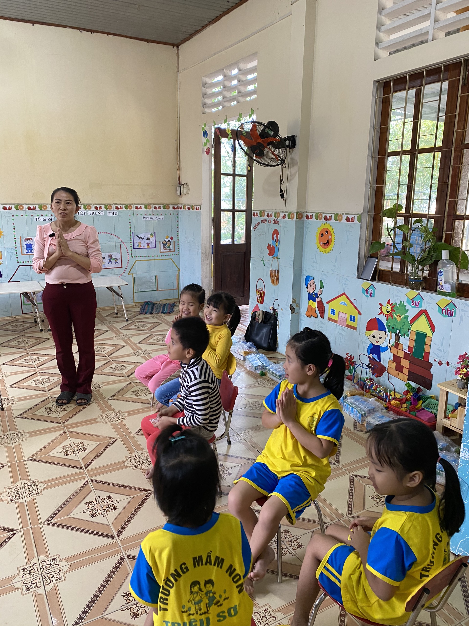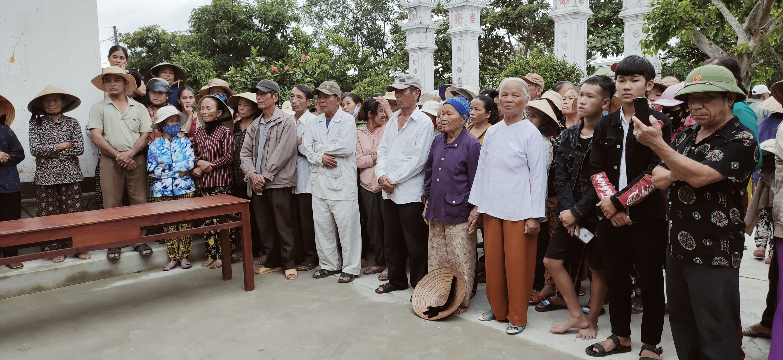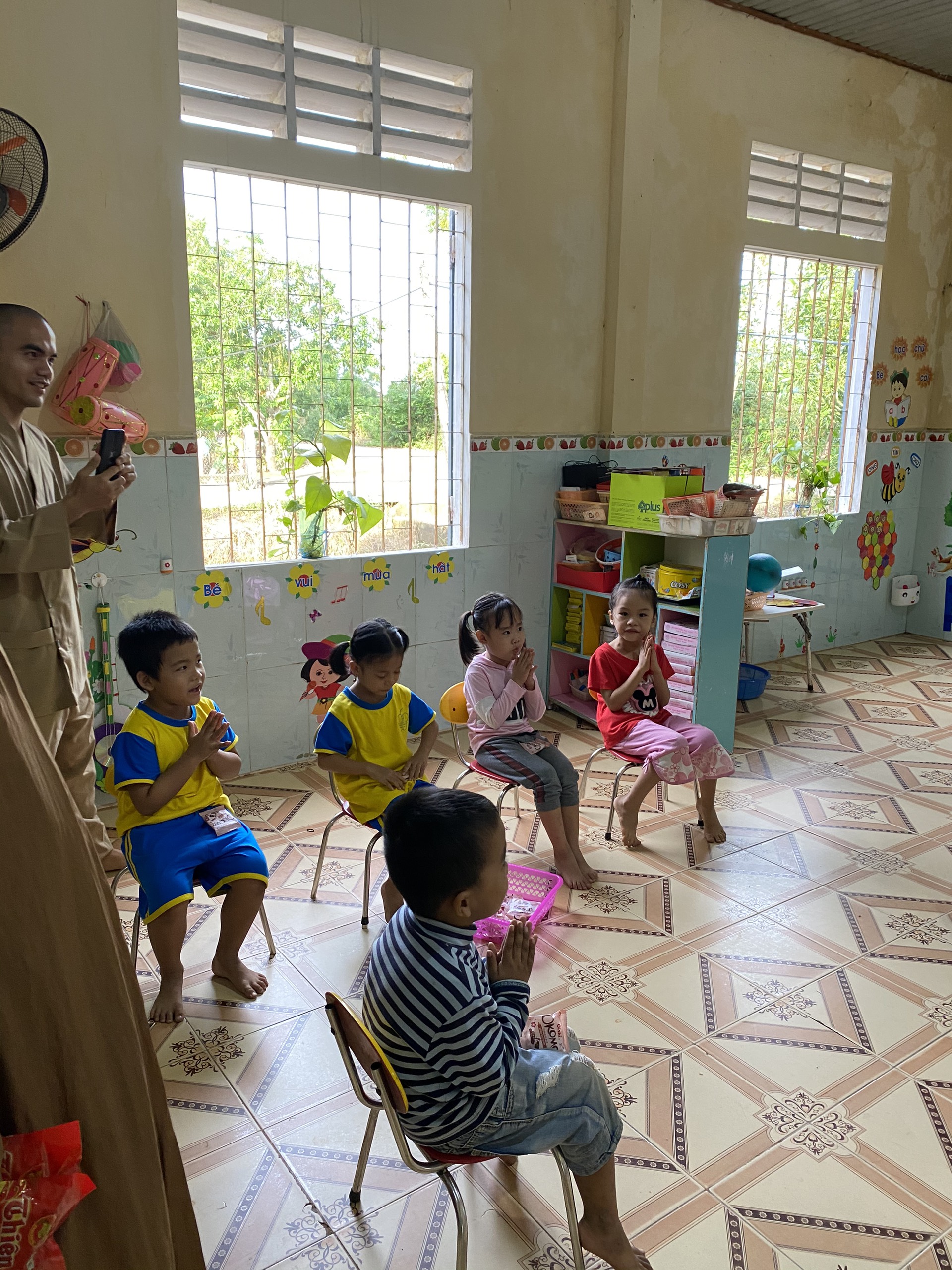 ĐĐ. Thích Thiện Hưng, Trưởng Ban Thiện Nguyện đại diện đoàn chia sẻ động viên bà con sớm ổn định cuộc sống. Đoàn đến thăm các cháu tại trường mầm non và trực tiếp đến 5 nhà có thiệt hại nặng nhất thôn, chia sẻ đến các hộ phần quà.