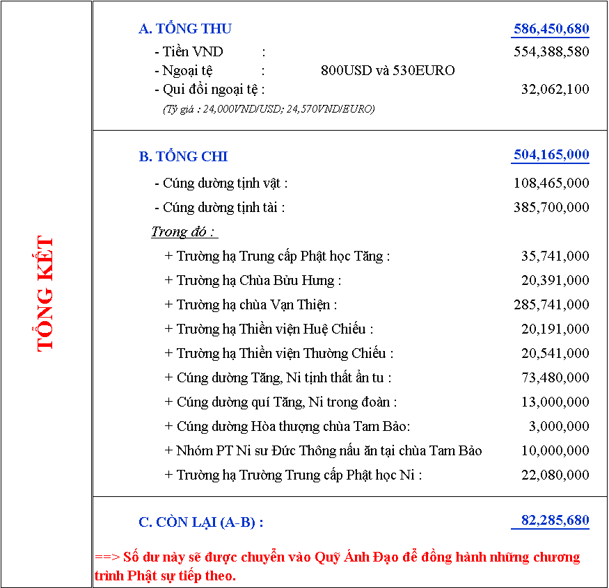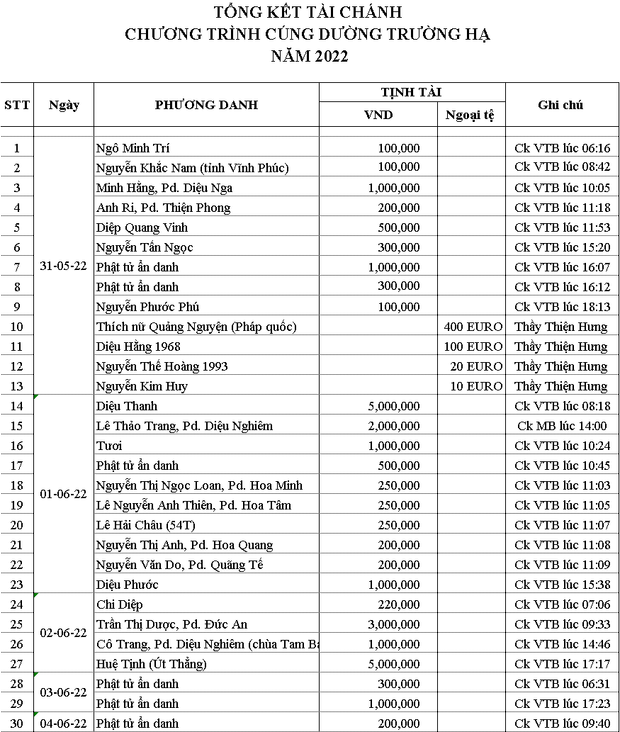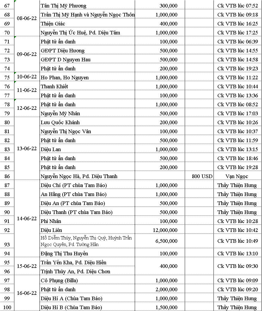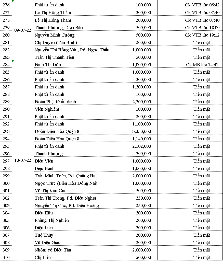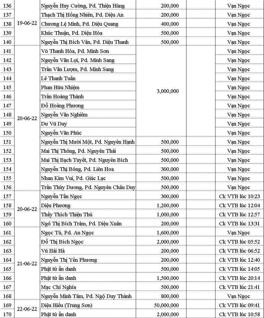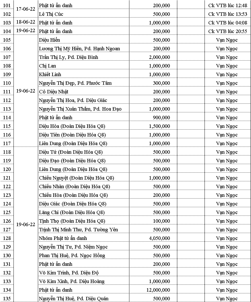 Ghi chú: Có những vị Phật tử phát tâm cúng dường nhưng không để tên nên BTC tạm ghi ẩn danh. Số lượng quý Phật tử gửi cúng dường thông qua tài khoản và trực tiếp đến các thành viên nên không sao tránh khỏi những sai sót, nếu quý vị nào chưa thấy tên và tịnh tài đã phát tâm vui lòng liên lạc Phật tử Vạn Ngọc Thư ký BTN để bổ sung.