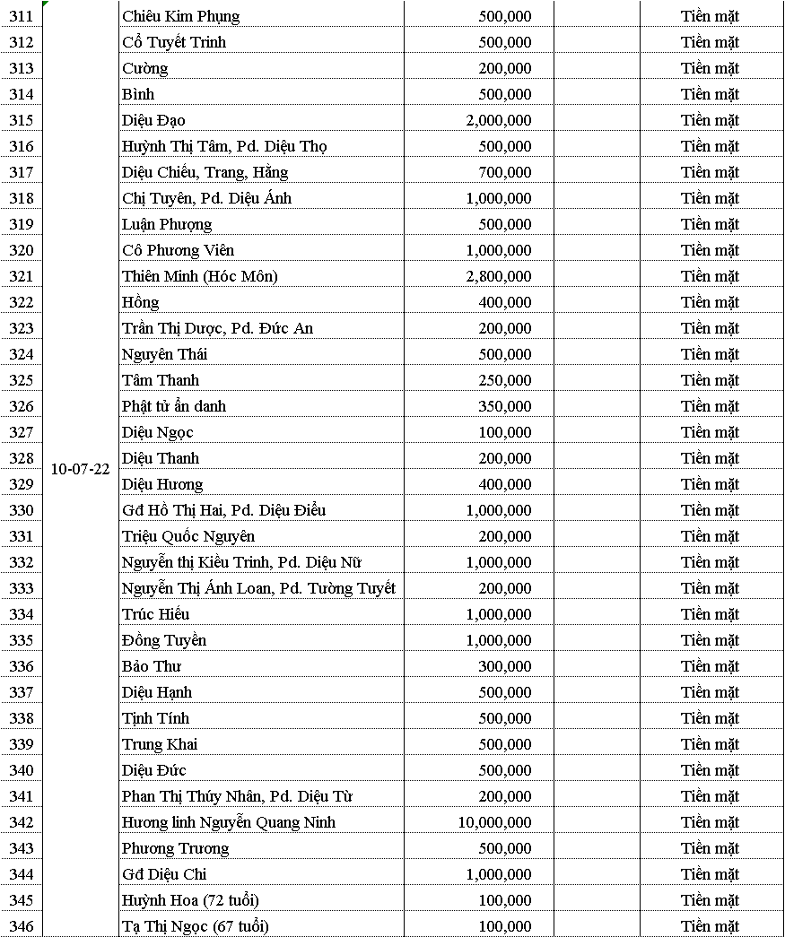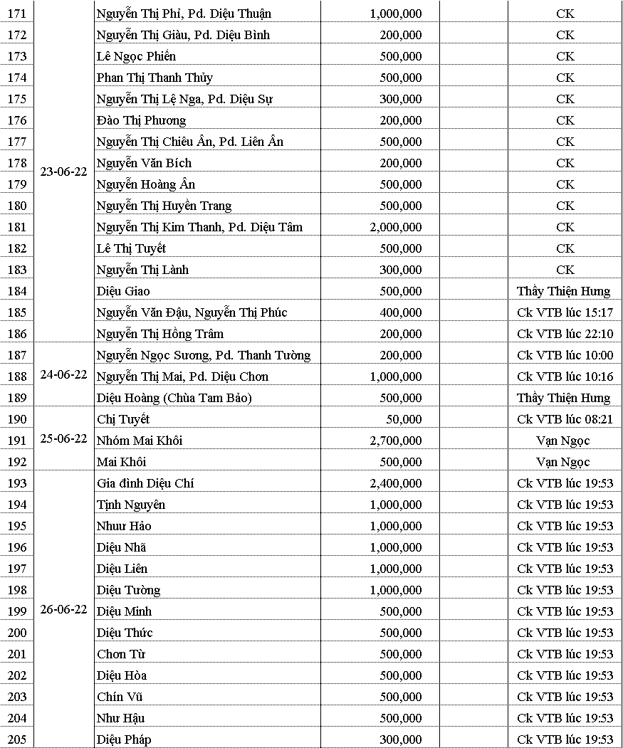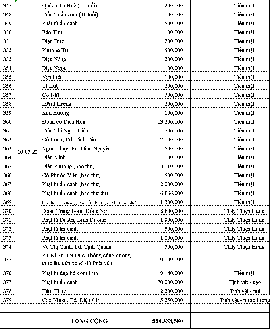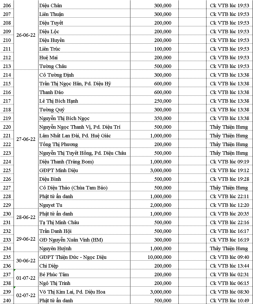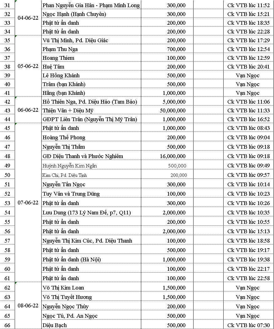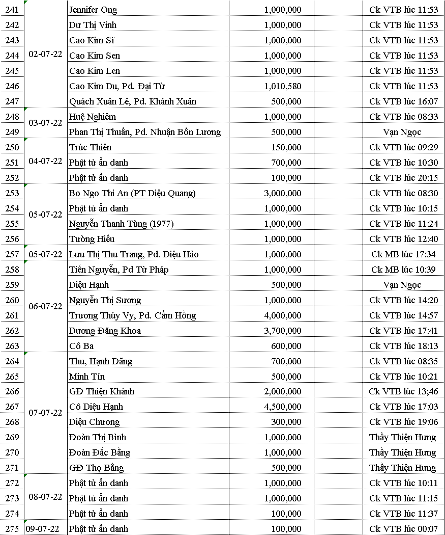 Ghi chú: Có những vị Phật tử phát tâm cúng dường nhưng không để tên nên BTC tạm ghi ẩn danh. Số lượng quý Phật tử gửi cúng dường thông qua tài khoản và trực tiếp đến các thành viên nên không sao tránh khỏi những sai sót, nếu quý vị nào chưa thấy tên và tịnh tài đã phát tâm vui lòng liên lạc Phật tử Vạn Ngọc Thư ký BTN để bổ sung.