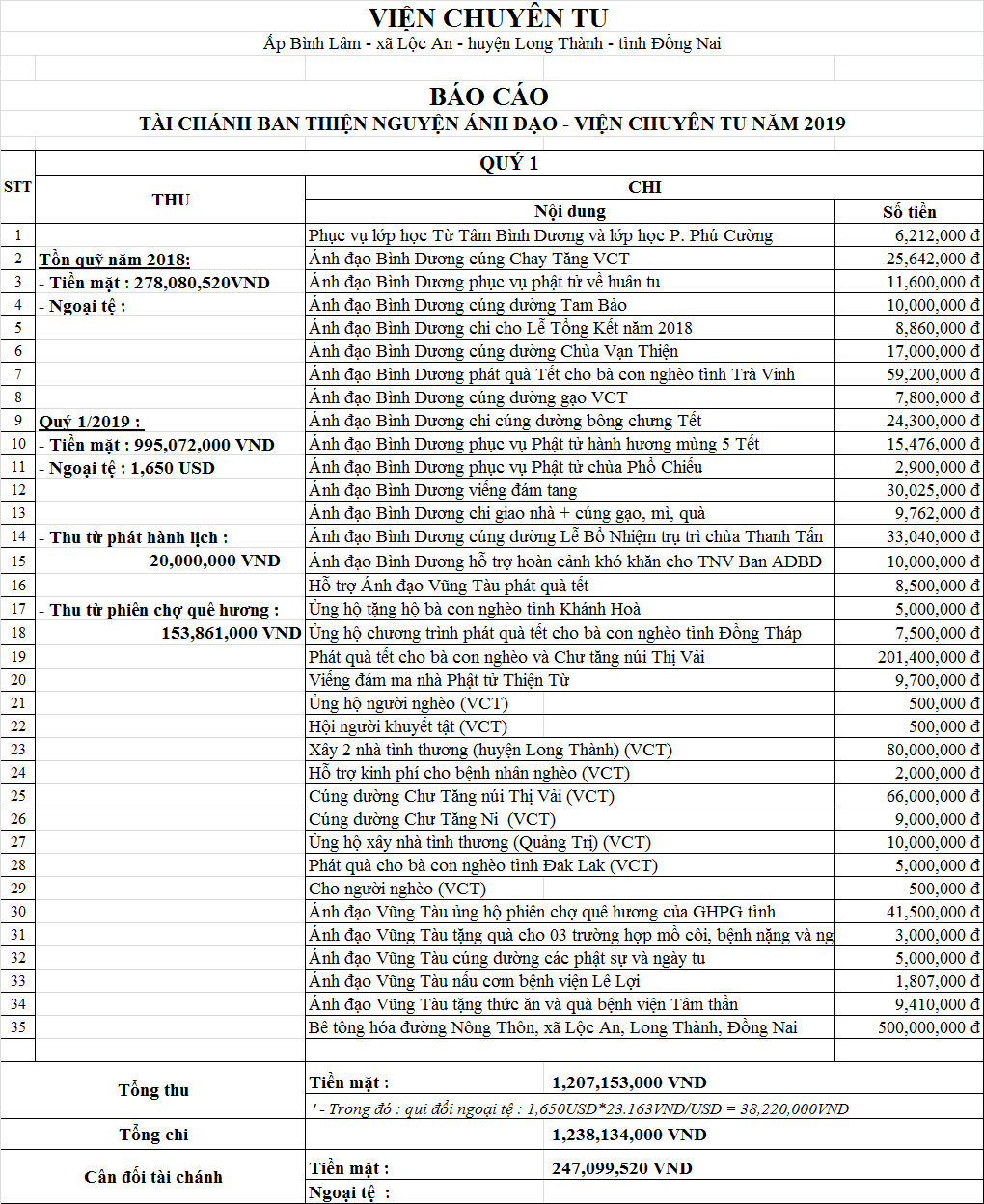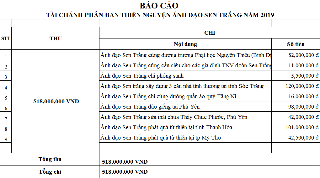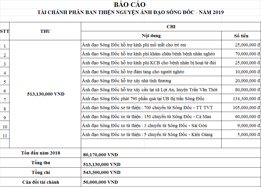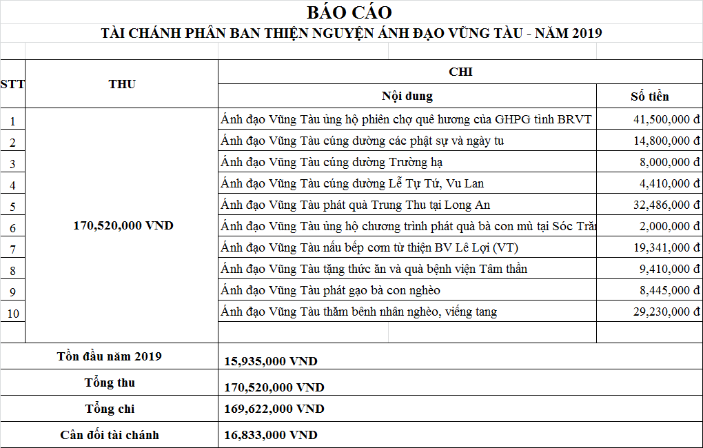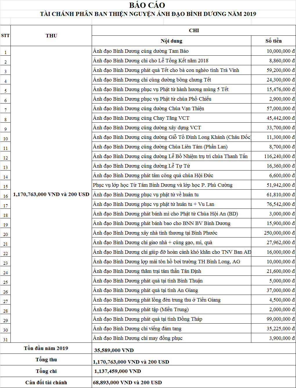 Báo cáo Tổng kết tài chính Ban Thiện nguyện Ánh Đạo năm 2019