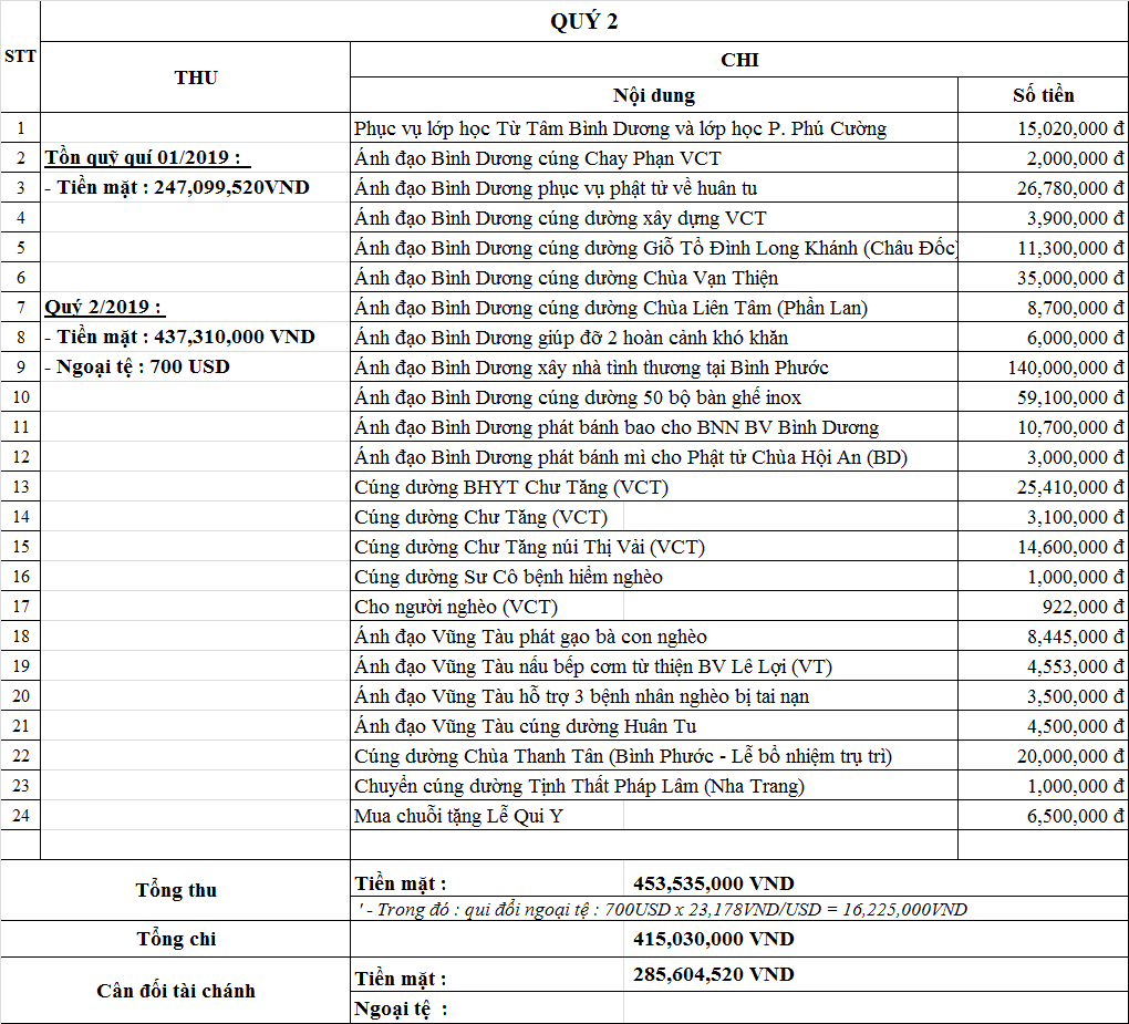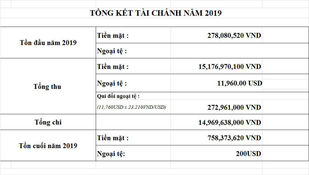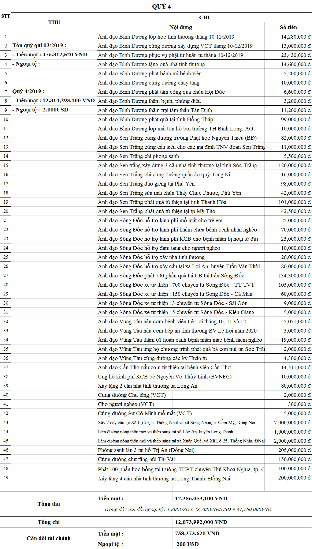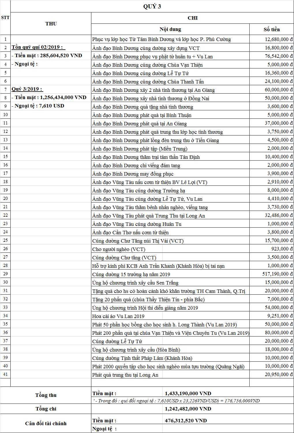 Báo cáo Tổng kết tài chính Ban Thiện nguyện Ánh Đạo năm 2019