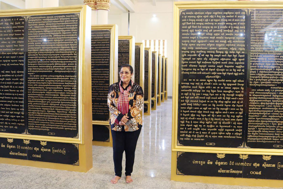 Bà Hun Sinat, em gái của cựu Thủ tướng Hun Sen bên những bia đá khắc lời Phật dạy