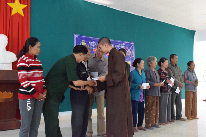 Tiếp đến, đại diện cho Thượng Tọa trụ trì Viện Chuyên Tu và BTN Ánh Đạo, Đại Đức Thích Thiện Trụ – Phó BTN Ánh Đạo đã gửi lời chúc sức khỏe và tri ân đến quý vị lãnh đạo UBND, quý vị cán bộ Ban Tôn giáo – Dân tộc, Thương binh xã hội, hội Chữ thập đỏ huyện Tân Thành và xã Sông Xoài đã tạo điều kiện để chư Tăng Viện Chuyên Tu cũng như BTN Ánh Đạo có cơ hội được tiếp xúc và chia sẻ một phần nhỏ những khó khăn của bà con dân tộc Ch’ro xã Sông Xoài. Trò chuyện với bà con nghèo, Đại Đức mong bà con hãy sống hòa thuận, giúp đỡ lẫn nhau để cùng vượt nghèo, vượt khó, và một chút quà của quý Thầy tuy giá trị không nhiều nhưng là tấm lòng chân thật của người con Phật xin được gửi đến bà con, mong bà con vui vẻ đón nhận và đón một mùa xuân mới đầy ấm áp, hạnh phúc bên gia đình, người thân.