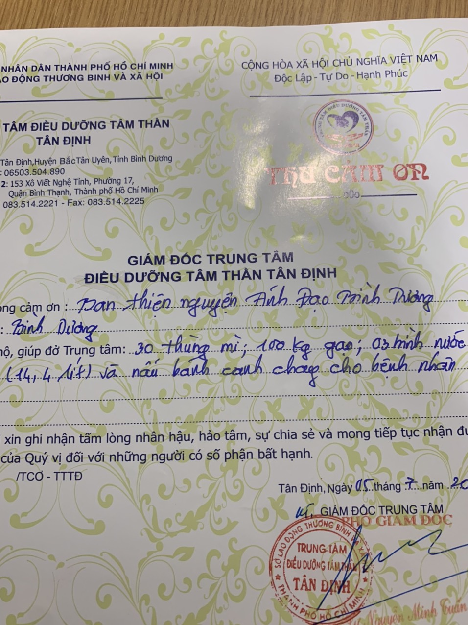 Chiều ngày 5/7/2020. Phân ban Ánh Đạo Bình Dương đã đi 1 quãng đường dài hơn 50 km, đến Trung tâm điều dưỡng Tâm thần Tân Định, Tân Uyên, Bình Dương. Theo định kỳ, hôm nay nhóm nấu tặng cho bệnh nhân món bánh canh chay. Ngoài ra còn tặng thêm 30 thùng mì gói, 100 ký gạo, 15 lít nước tương và mấy bao quần áo.
