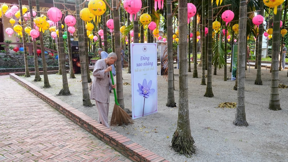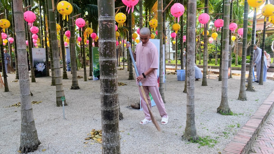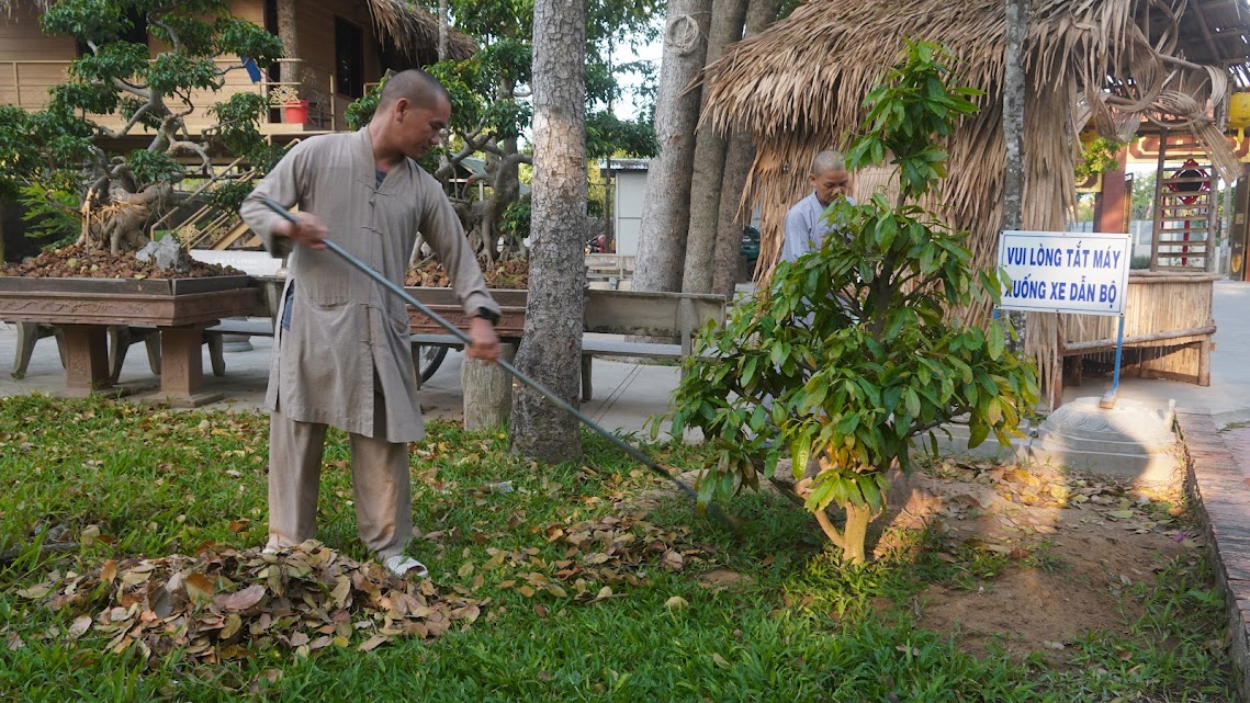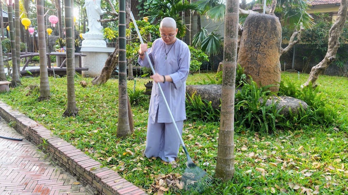 Quét lá vườn chùa như quét sạch trần lao trong tâm, sau những tháng ngày trôi lăn theo vòng đời khổ ải, nay các Giới tử về lại chốn thiền môn, cùng tu tập, sống chung với Tăng đoàn, với Đại chúng, phát khởi Bồ-đề tâm, gieo chủng tử xuất gia thanh tịnh trong hiện tại và vị lai.