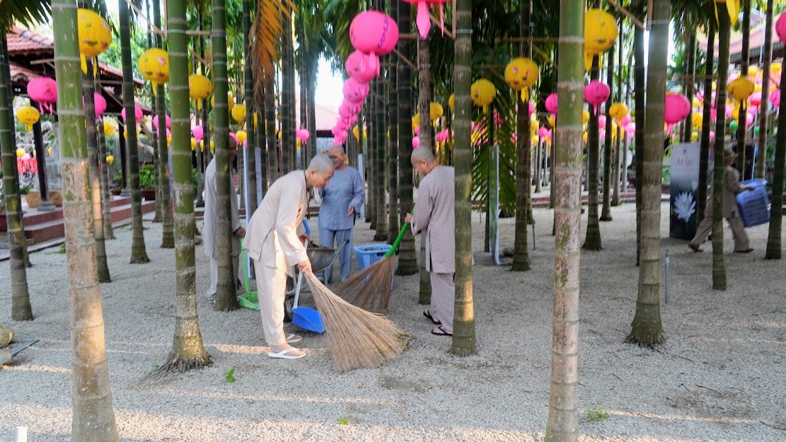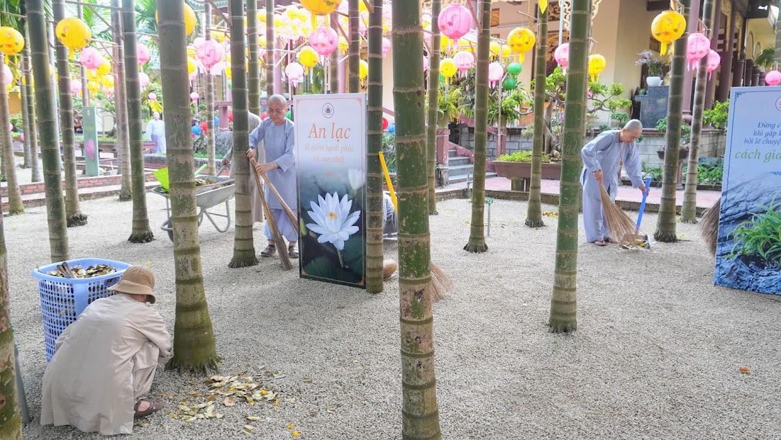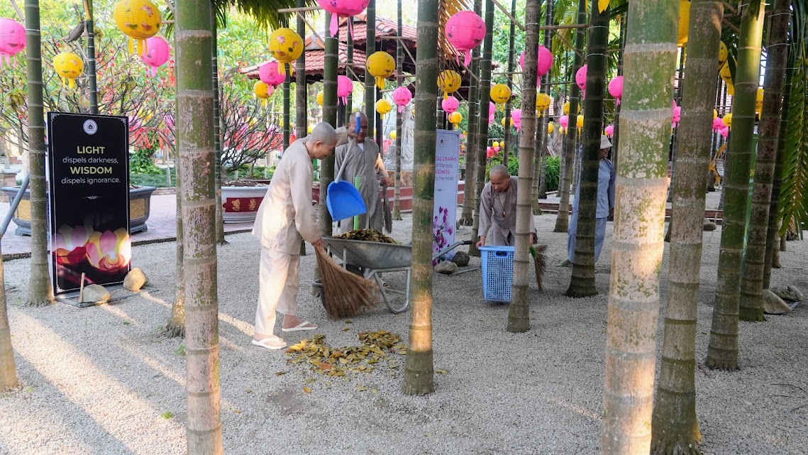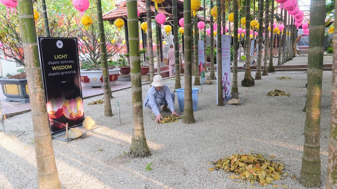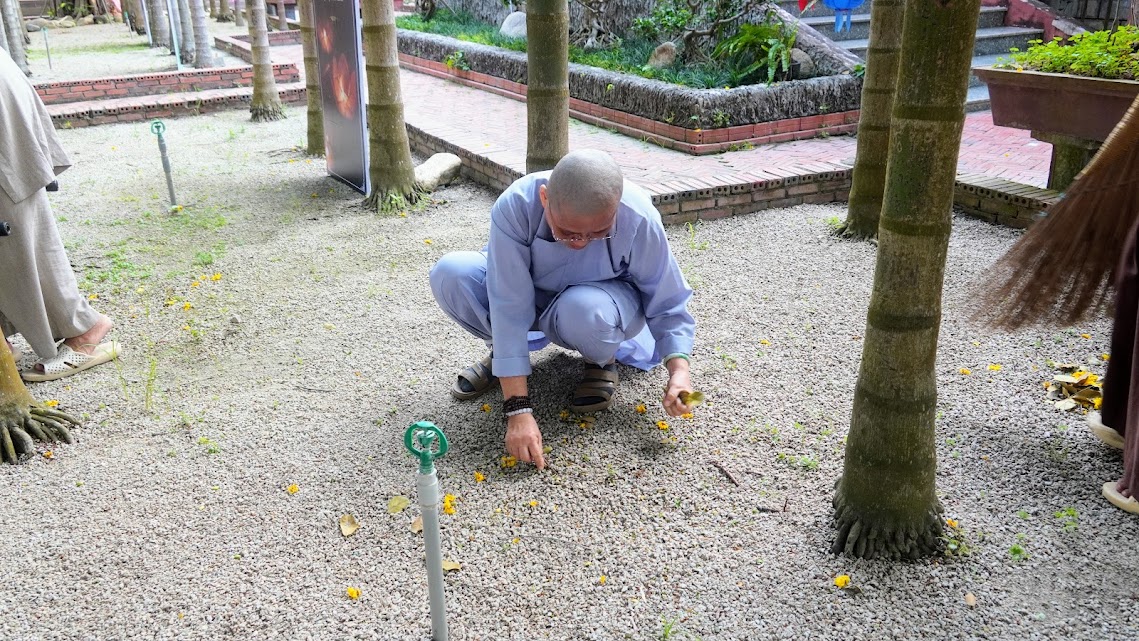 Quét lá vườn chùa như quét sạch trần lao trong tâm, sau những tháng ngày trôi lăn theo vòng đời khổ ải, nay các Giới tử về lại chốn thiền môn, cùng tu tập, sống chung với Tăng đoàn, với Đại chúng, phát khởi Bồ-đề tâm, gieo chủng tử xuất gia thanh tịnh trong hiện tại và vị lai.