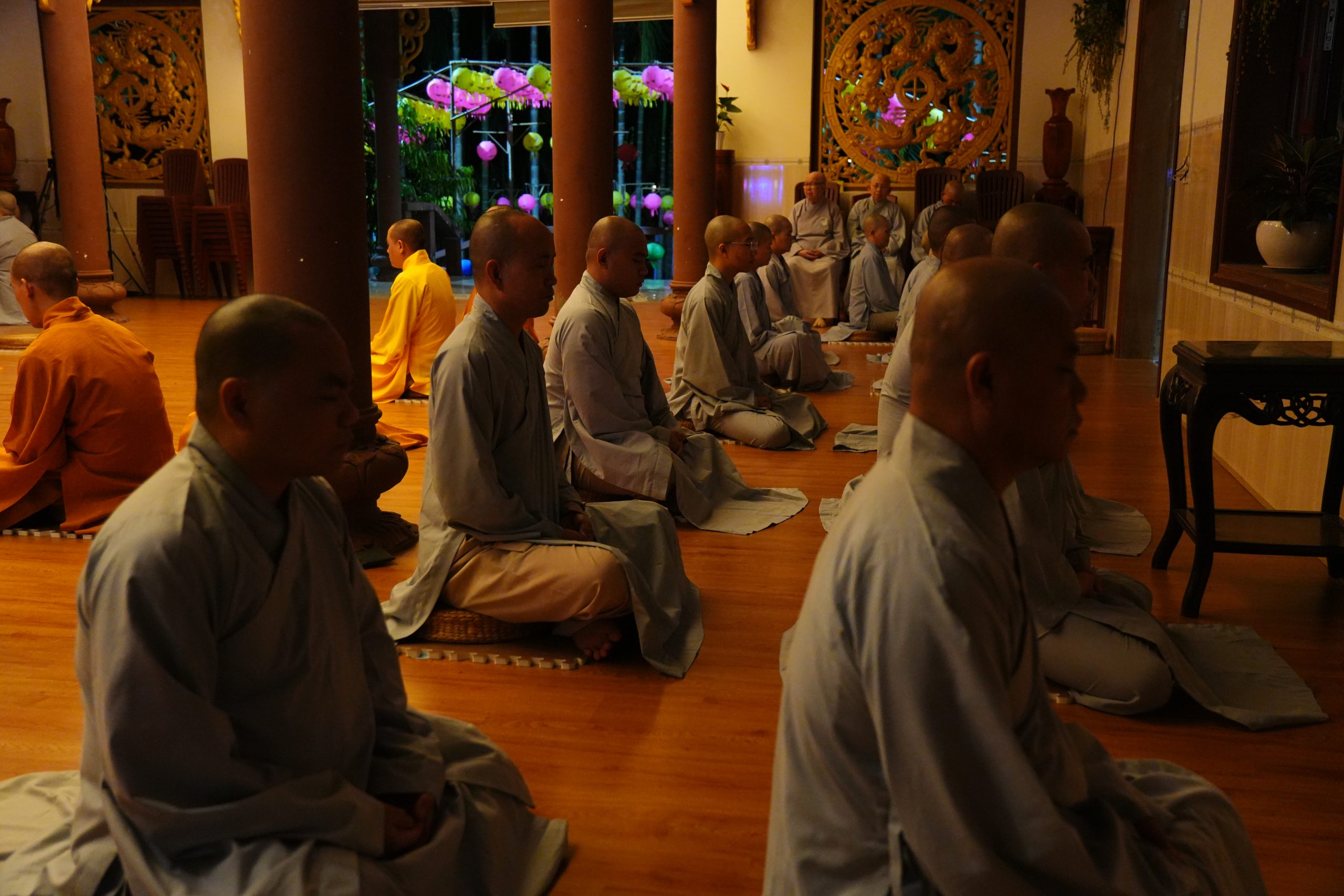Kết thúc một ngày tu tập trong Khóa tu Xuất gia Gieo duyên là thời tọa thiền. Các Giới tử ngồi ngay ngắn trong tư thế Thiền tọa, vị sám chủ bắt đầu xướng đọc bài Hoàng hôn Vô thường kệ, nhắc nhở Đại chúng về một ngày đã trôi qua, phải tinh tấn tu hành, chớ có buông lung: