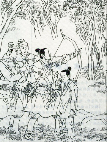 Nhìn thấy bả vai con bị thú dữ cào bị thương, người cha tức giận vô cùng, liền cầm cung tên đi thẳng vào rừng. Ông không thấy loài thú dữ nào mà gặp tiên nhân tu đạo, râu tóc dài trắng xóa. Ông ta không hỏi rõ đầu đuôi, liền lắp tên vào cung, chuẩn bị bắn tiên nhân. Chú bé chạy theo sau, liền ngăn lại nói: