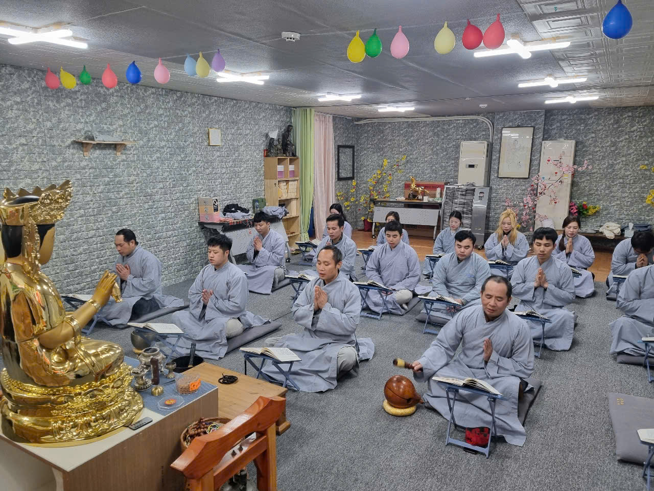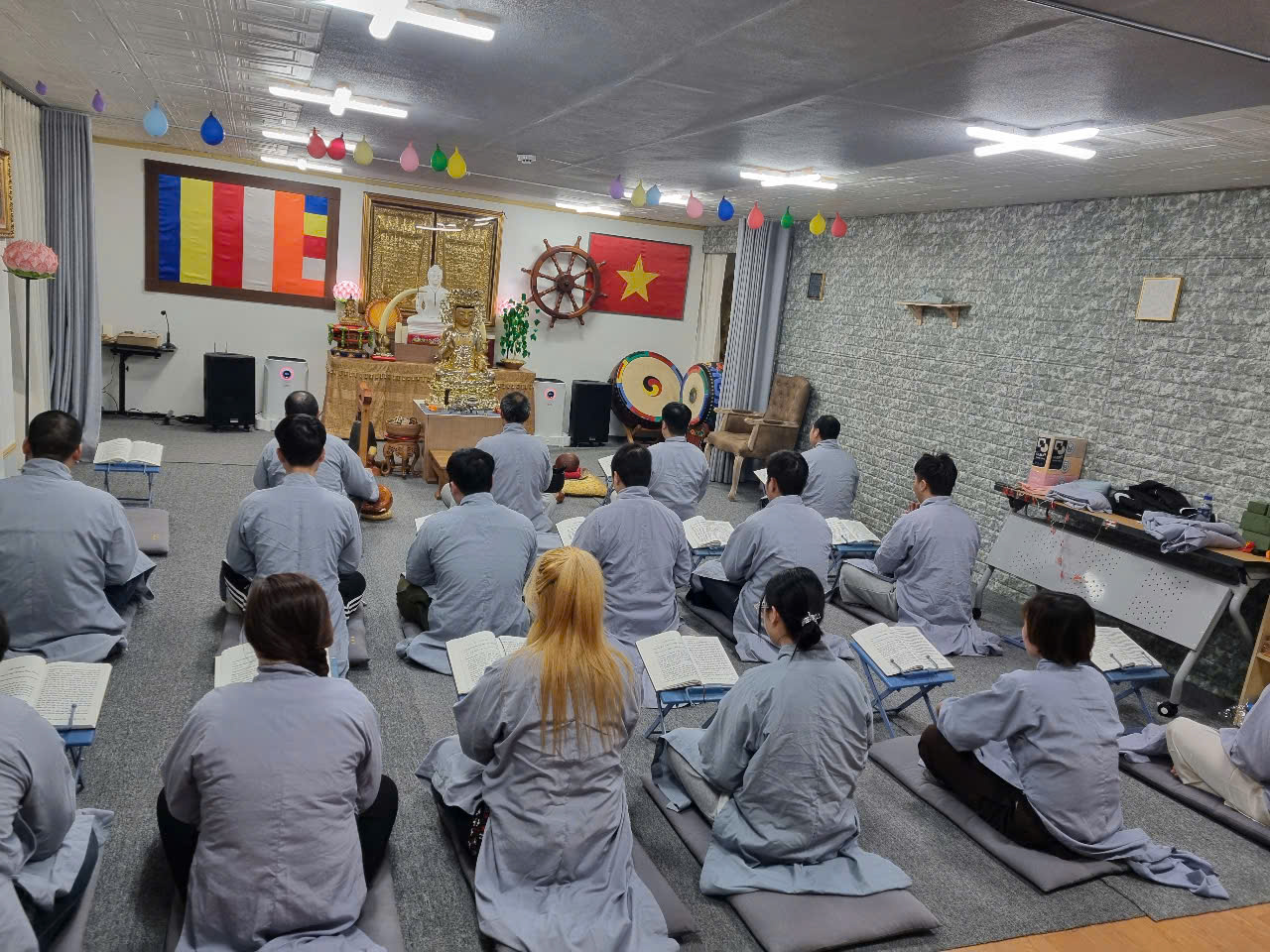 Trong không khí trang nghiêm, quý Phật tử cùng trì tụng Kinh A Di Đà tại Chánh điện. Sau thời khoá tụng kinh, huynh đệ tham gia buổi trà đạo nhằm kết nối, chia sẻ, động viên tinh tấn tu học trong cuộc sống.