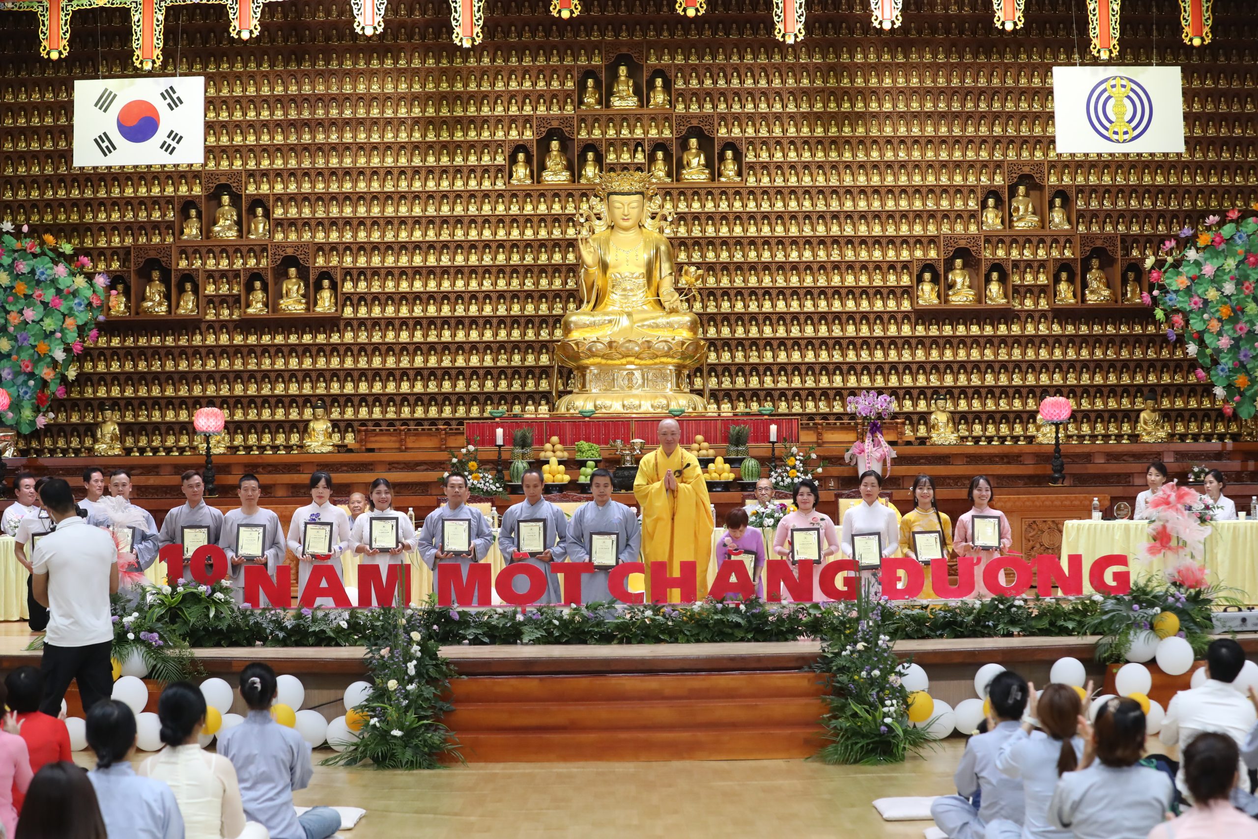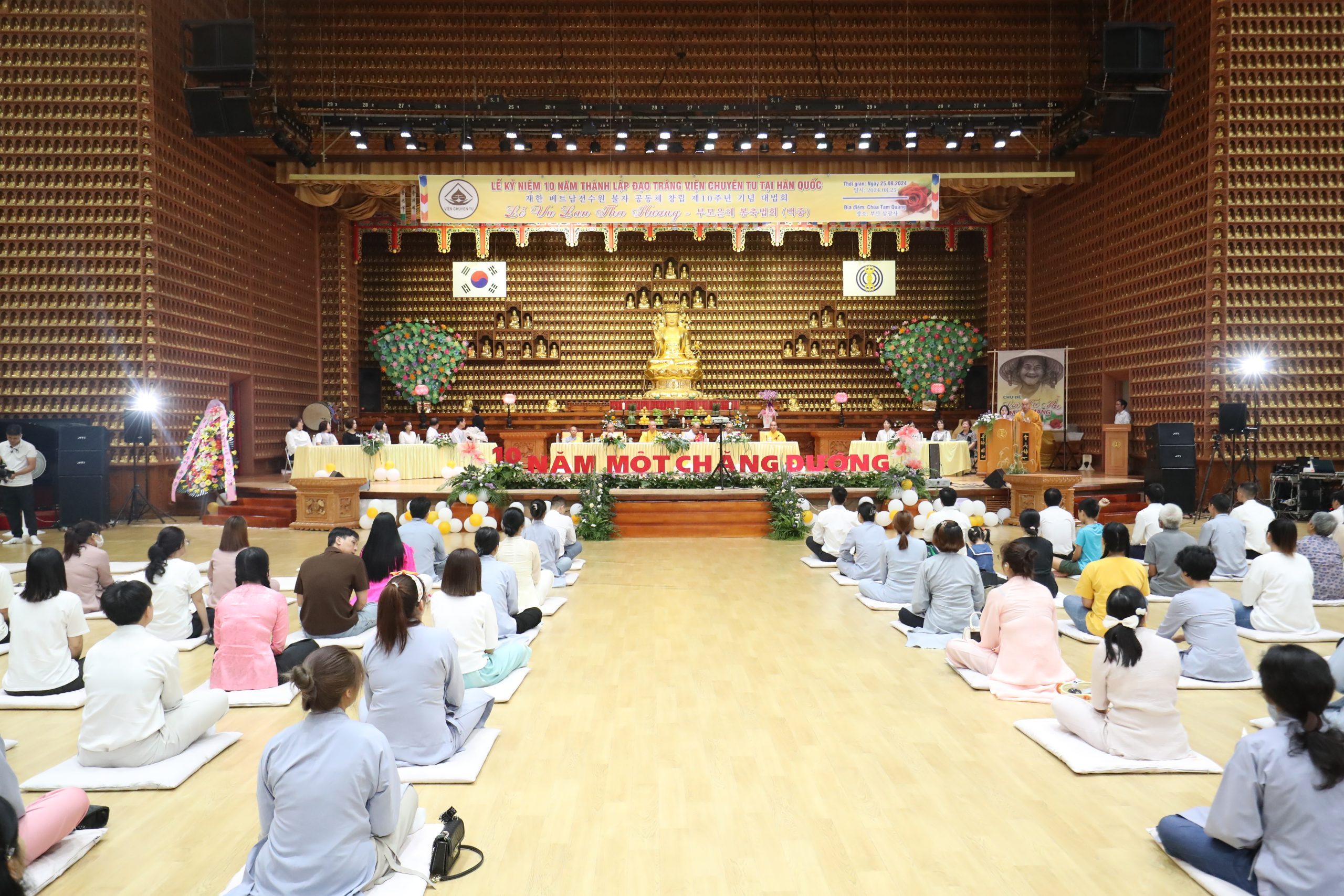 Sáng ngày 25/8/2024, tại Hội trường lớn chùa Tam Quang (TP. Busan, Hàn Quốc), Lễ Kỷ niệm chủ đề “10 năm một chặng đường” được long trọng tổ chức với sự chứng minh của HT. Kim Yeong Je – Trụ trì chùa Tam Quang; HT. Min Hae – Trụ trì chùa Ngoạ Long (TP. Daegu, Hàn Quốc); TT. Thích Thiện Thuận – Trụ trì Viện Chuyên Tu, Trưởng BTC; ĐĐ. Thích Thiện Hưng – Tổng Điều phối Đạo tràng, Trụ trì chùa Tam Bảo; ĐĐ. Thích Thiện Quán – Trụ trì Tu viện Lăng Nghiêm, ĐĐ. Thích Thiện Long – Trú xứ chùa Bình Quang, NS. Thích Nữ Diệu Lành – Trụ trì chùa Bửu Lâm; cùng sự tham gia của các thành viên Ban Quản trị chùa Tam Quang, chùa Ngoạ Long và hơn 500 hành giả tham dự buổi lễ.