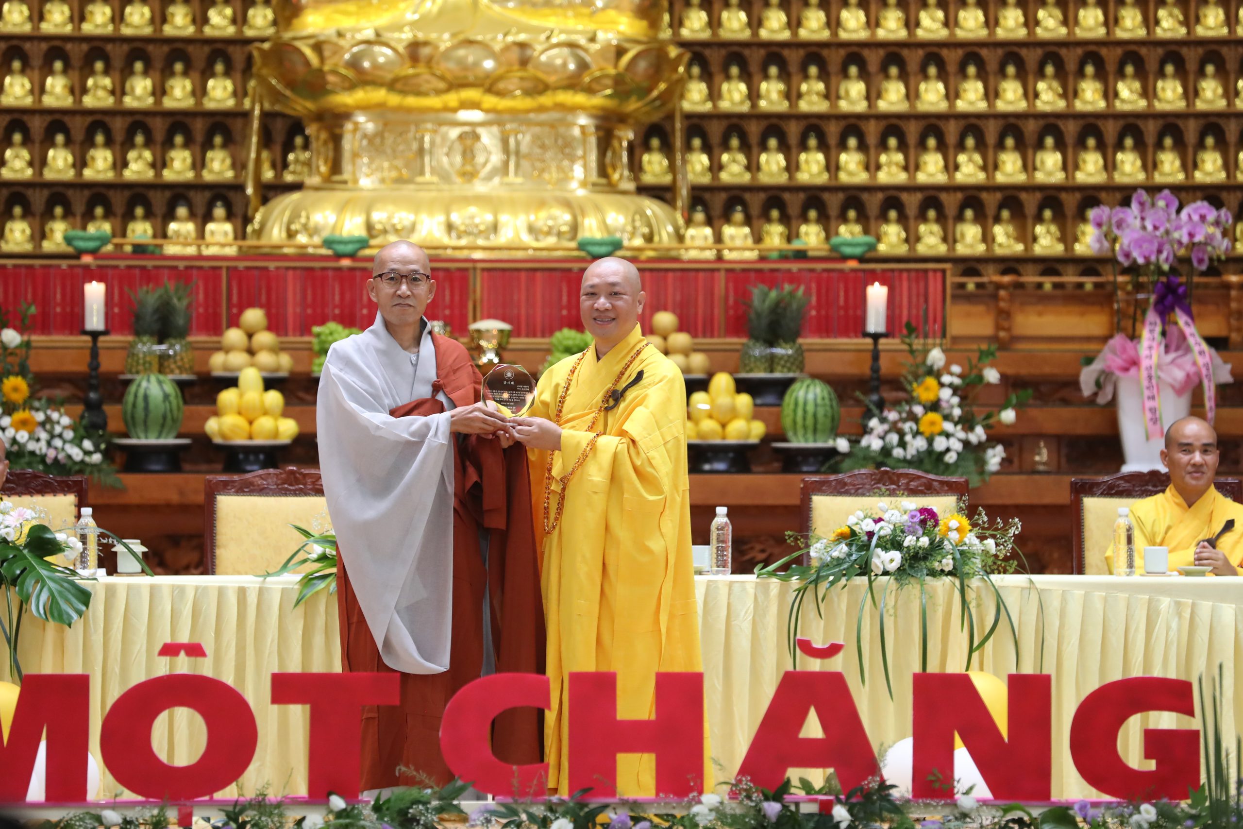 Trong không khí hân hoan của buổi lễ, ĐĐ. Thích Thiện Hưng – Tổng Điều phối Đạo tràng đã thay mặt BTC có đôi lời tri ân đến quý Phật tử đã đồng hành gắn bó, xây dựng và phát triển Đạo tràng trong thời gian qua. Lời tri ân đầy cảm xúc của ĐĐ. Thích Thiện Hưng là động lực để quý Phật tử luôn cố gắng và nỗ lực tu tập hơn nữa. Tiếp đến, TT. Thích Thiện Thuận đã trao kỷ niệm chương cùng các phần quà thay cho lời cảm tạ sâu sắc đến các vị Hoà thượng và quý vị trong Ban Quản trị chùa đã tạo điều kiện giúp đỡ Đạo tràng tu học. Dịp này, BTC cũng đã vinh danh những vị Phật tử đã gắn bó và đóng góp tích cực cho Đạo tràng.