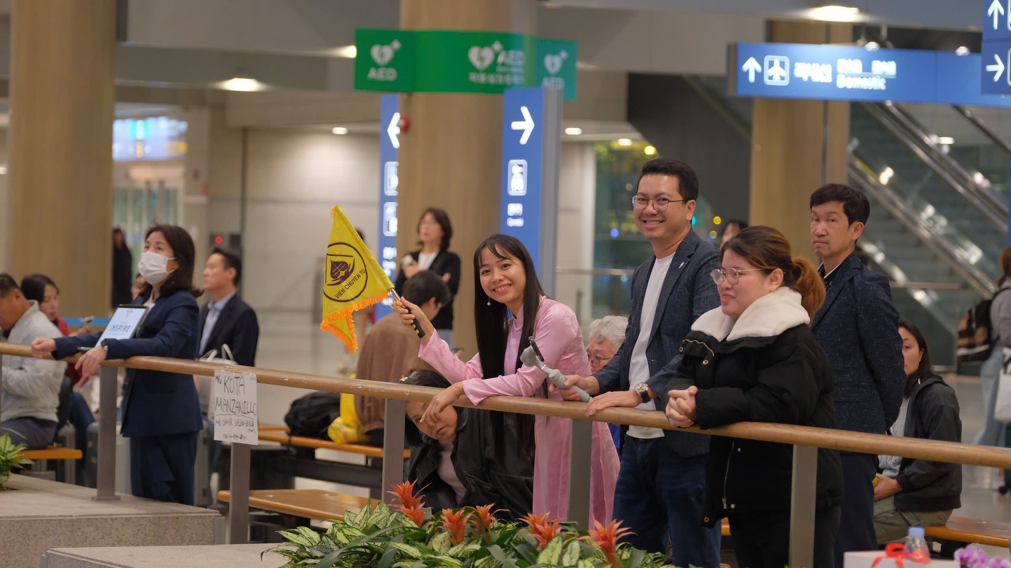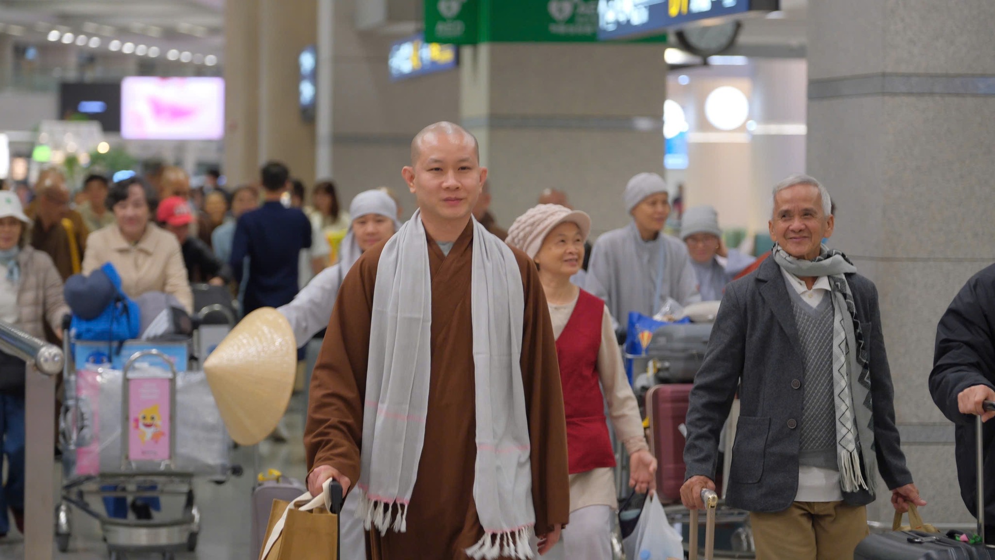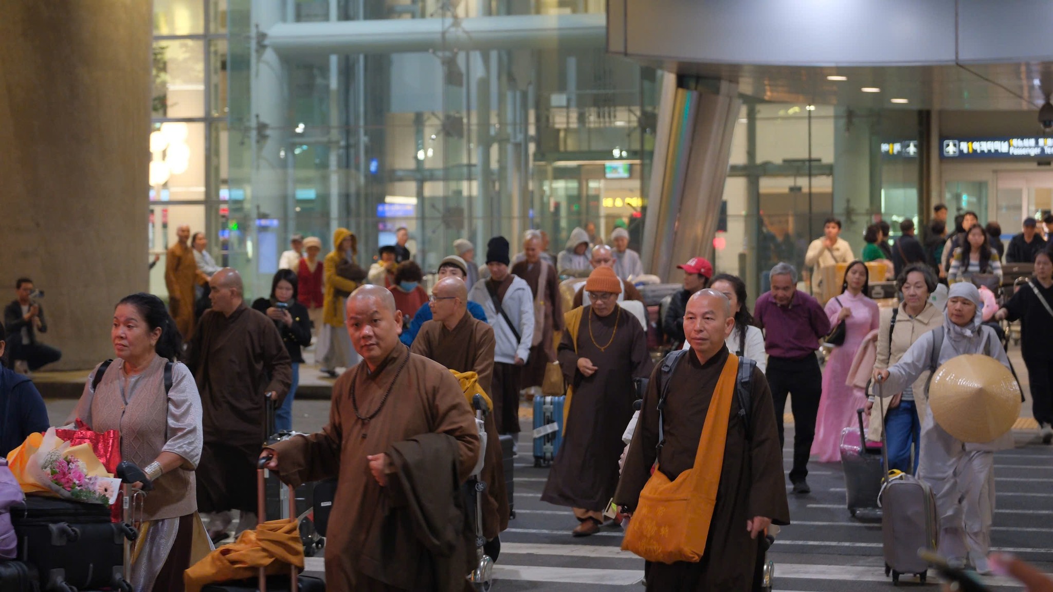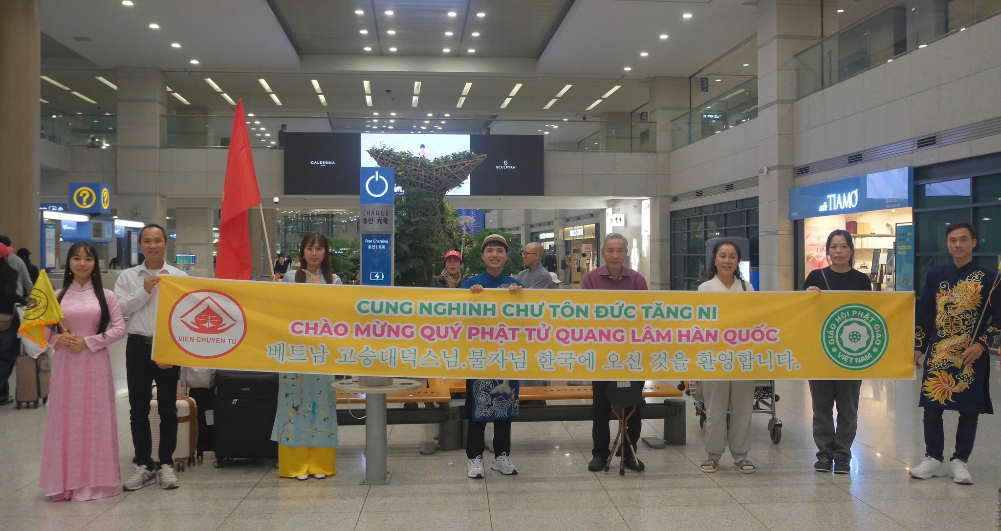 Anh chị em Cộng đồng Phật tử Viện Chuyên Tu tại Hàn Quốc từ rất sớm đã đến sân bay Incheon, tất cả đều háo hức, trông chờ được diện kiến Chư Tôn Đức và Đoàn Phật tử từ Việt Nam. Lúc 20 giờ 00, Đoàn Hoằng pháp đã đáp chuyến bay ASIANA số hiệu OZ732 tại Incheon Hàn Quốc. Đạo tràng được cung đón sự hiện diện của TT. Thích Thường Tín – Trụ trì Tổ đình Long Sơn (Nha Trang), TT. Thích Trúc Thái Thường – Trú xứ chùa Tam Bảo (Đồng Nai) cùng Chư Tôn Đức Tăng Ni – Trụ trì các Tự viện và Quý Phật tử tại Việt Nam, tại Mỹ Quốc, tại Canada. Đoàn đã khởi hành về chùa Minh Trang (Myeongjangsa: 2-13, Yongdam-ro 31 beon-gil, Sangdang-gu, Cheongju-si, Chunbuk-do, Korea) – Nơi sẽ tổ chức khóa tu học Phật pháp lần thứ 15 chủ đề: “Tìm về bên Phật”.