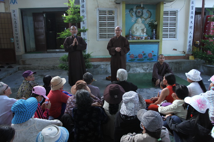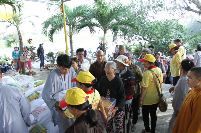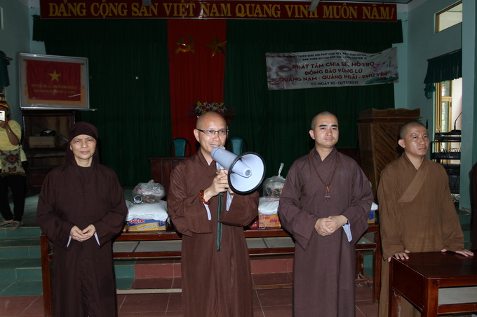 Tham dự buổi lễ trao quà, có ĐĐ. Thích Quảng Sơn – trụ trì chùa Cảnh Thái, Tuy Hòa; ĐĐ. Thích Chúc Thiện – trụ trì chùa Ninh Tịnh, Tuy Hòa; về phía chính quyền, có ông Phạm Xuân Cang – Chủ tịch UBMTTQ xã An Định huyện Tuy An cùng quý vị cán bộ đại diện UBND, UBMTTQ xã cùng tham dự và hướng dẫn việc trao tặng quà đến bà con trong khu vực. Đại diện cho đoàn từ thiện, ĐĐ. Thích Thiện Hưng đã gửi lời tri ân sâu sắc đến chư tôn đức cũng như quý vị lãnh đạo chính quyền tại địa phương đã tạo nhịp cầu kết nối đến người dân Tuy Hòa, để cho đoàn có cơ hội được chia sẻ, giúp đỡ đồng bào đang gặp phải thiên tai, lũ lụt trầm trọng gây thiệt hại nặng nề về người và của. Bằng cả nỗi niềm đồng cảm sâu sắc, ĐĐ.Thích Thiện Hưng đã vô cùng xúc động khi thấy được hoàn cảnh khốn đốn của bà con nghèo trong cơn bão lũ. Với những lời chân tình sâu lắng, Đại Đức mong rằng một chút quà nhỏ bé của đoàn có thể xoa dịu đi phần nào nỗi đau mà bà con phải hứng chịu, Đại Đức cũng nhắn nhủ bà con hãy nên bình tâm đối diện với sự thật vô thường đang diễn ra trong cuộc sống hằng ngày, nhờ thấy và hiểu rõ về lẽ thật vô thường ấy mà bà con có thể vơi bớt đi những buồn phiền, lo lắng và sẵn sàng khắc phục, cải thiện đời sống của mình bằng các thiện nghiệp như: làm lành, lánh dữ, quy y Tam Bảo, giữ gìn năm giới của nhà Phật, niệm Phật, ăn chay… Cuối lời, Đại Đức gửi lời chúc sức khỏe, an lành đến toàn thể mọi người, cầu nguyện chư Phật gia hộ cho mưa thuận gió hòa để tất cả mọi người có được cuộc sống bình yên.