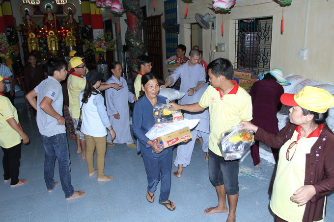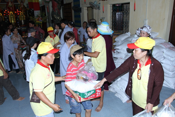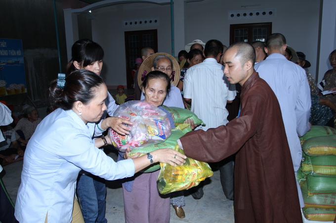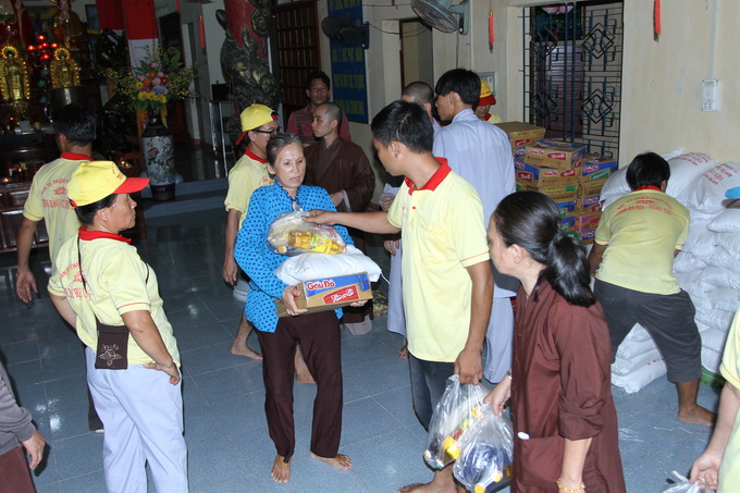 Thấu hiểu được nỗi tổn thất lớn lao này, đoàn đã trao tặng 650 phần quà, mỗi phần trị giá 300 ngàn đồng cho bốn điểm bị thiệt hại nặng nề nhất tại tỉnh Phú Yên, gồm có: xã An Định, huyện Tuy An – 200 phần quà; chùa Cảnh Thái, thị trấn Hòa Vinh, huyện Đông Hòa – 200 phần quà; chùa Ninh Tịnh, phường 9, tp. Tuy Hòa – 150 phần quà và xã An Trấn 100 phần quà. Đặc biệt, tại thị trấn Hòa Vinh, có trường hợp hộ gia đình bà Nguyễn Thị Dư, do bão lớn gây sập đổ toàn bộ ngôi nhà đã làm người mẹ của bà tử thương tại chỗ, hiện giờ trong gia đình còn một người em út bị liệt toàn thân do tai nạn sập dàn giáo trong khi lao động. Đại diện cho đoàn, ĐĐ. Thích Thiện Hưng đã thăm hỏi, an ủi, động viên và gửi tặng gia đình 2 triệu đồng để có thể cùng với chính quyền địa phương giúp bà sửa sang lại nhà ở. Trường hợp thứ hai là hộ gia đình em Võ Hoàng Hải 24 tuổi, có một người em 20 tuổi , em vốn bị bệnh động kinh, co giật, thể lực rất yếu, cơn bão vừa qua đã làm sập mái nhà khiến em bị thương nạn. ĐĐ Thích Thiện Hưng cũng đã trao tặng em 1 triệu đồng để an ủi, động viên cũng như giúp em một chút ít để sử dụng cho việc mua thuốc trị bệnh.