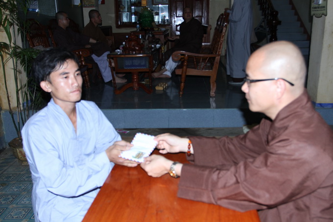 ĐĐ Thích Thiện Hưng cũng đã trao tặng 1 triệu đồng đến em Võ Hoàng Hải 24 tuổi, có người em bị tai nạn trong cơn bão hiện đang nằm và điều trị tại nhà do gia đình không đủ điều kiện đưa em đến bệnh viện.