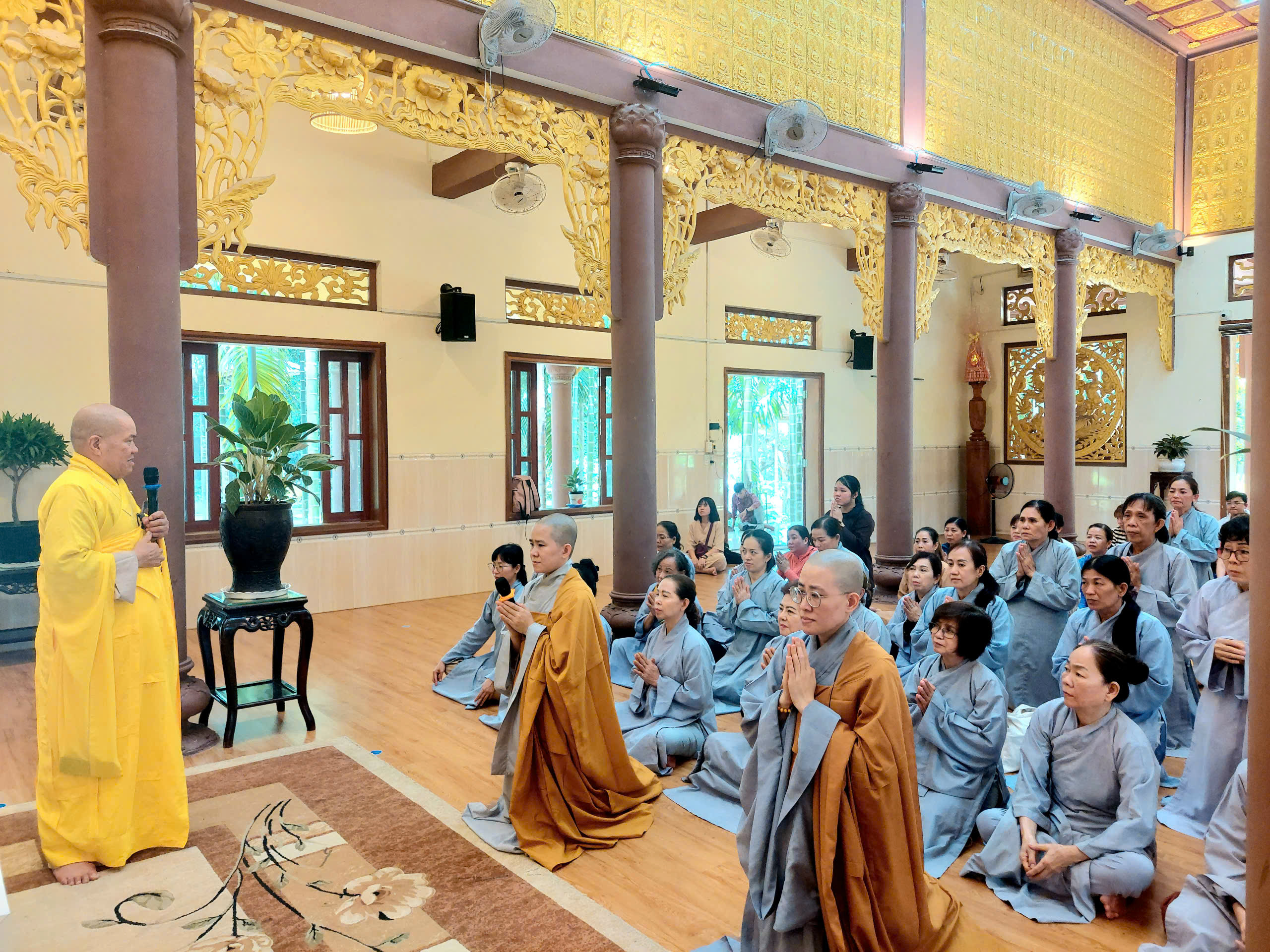 Trong niềm hoan hỷ ấy, Đại diện Ban chức sự hạ trường, Thượng tọa Thích Đức Minh – Phó Thiền chủ hạ trường đã hoan hỷ niệm ân công đức của chư Tôn Hòa thượng, chư Thượng tọa, cùng chư Tôn thiền đức Tăng ni trong Đoàn đã từ bi thương tưởng đến tất cả hành giả an cư tại trường chùa Vạn Thiện, mà không ngại đường sá xa xôi, để hướng dẫn quý Phật tử đem hết tất cả tấm lòng, sự thành kính gửi gấm vào phẩm vật cúng dường. Đây là niềm đồng lực rất lớn để hành giả an cư tại hạ trường tinh tấn hơn trong việc thúc liễm thân tâm, trao dồi giới định tuệ, tấn tu đạo nghiệp. Thượng tọa cũng gửi lời cảm ơn sâu sắc đến tất cả quý Phật tử đã bớt ăn, bớt mặc, tiết kiện chi tiêu để sám sanh lễ vật cúng dường Tam Bảo, cũng như hiện tiền chư Tôn thiền đức tạo hạ trường. Cuối lời, Thượng tọa kính nguyện cho chư Tôn Hòa Thượng, chư Thượng tọa, chư Tôn thiền đức Tăng ni pháp thể khinh an, thọ mạng miên trường, Phật sự viên thành. Kinh chúc quý Phật tử bồ đề tâm kiên cố, thân tâm thường an lạc, thành công trong cuộc sống.