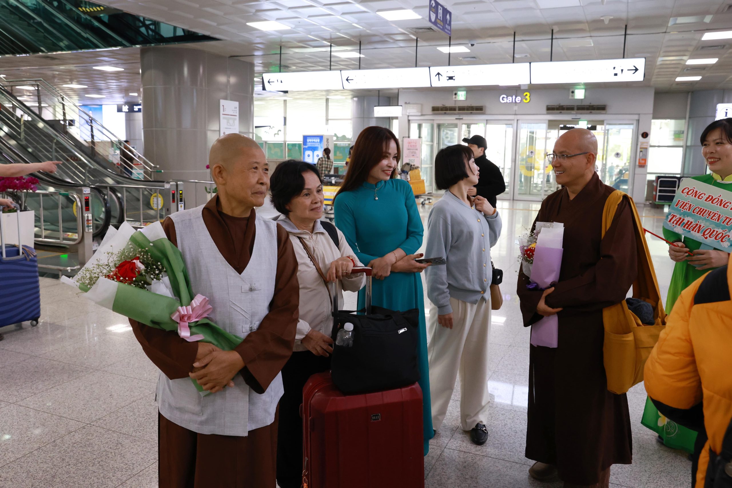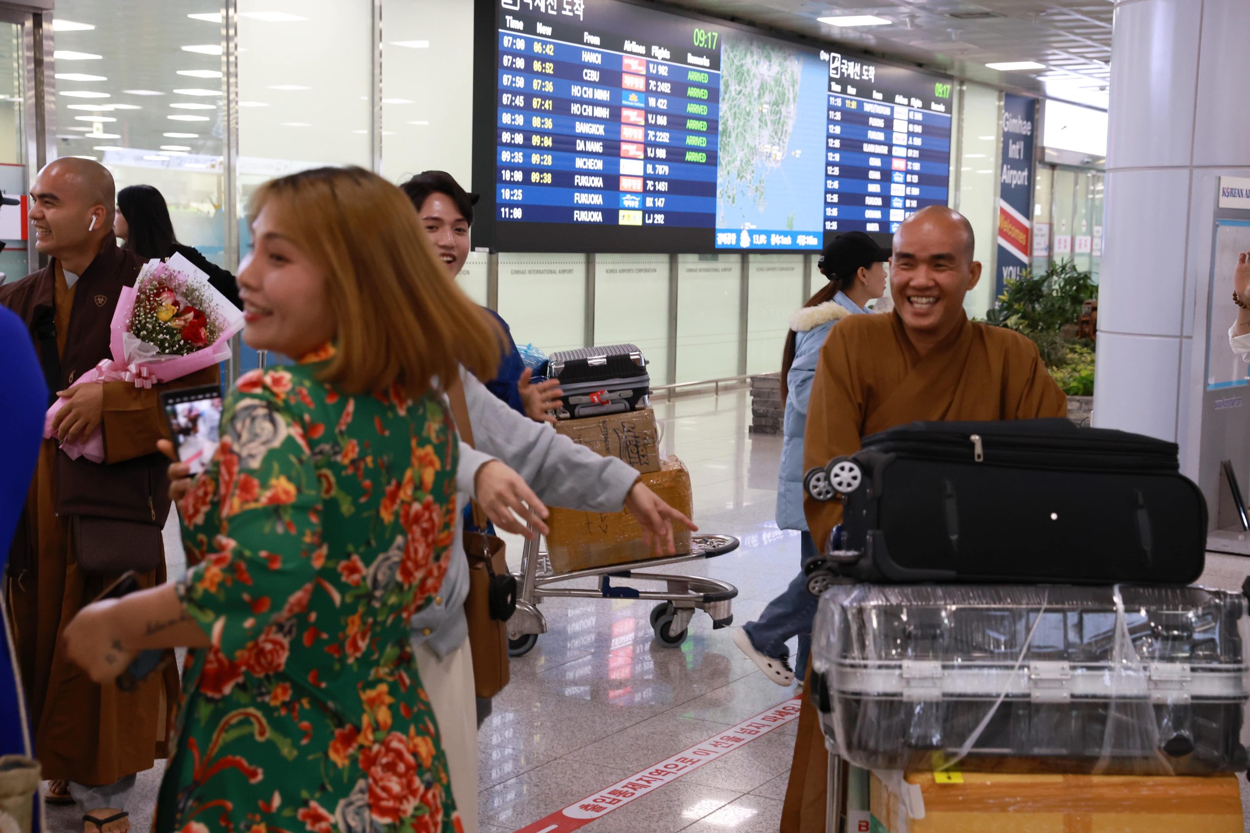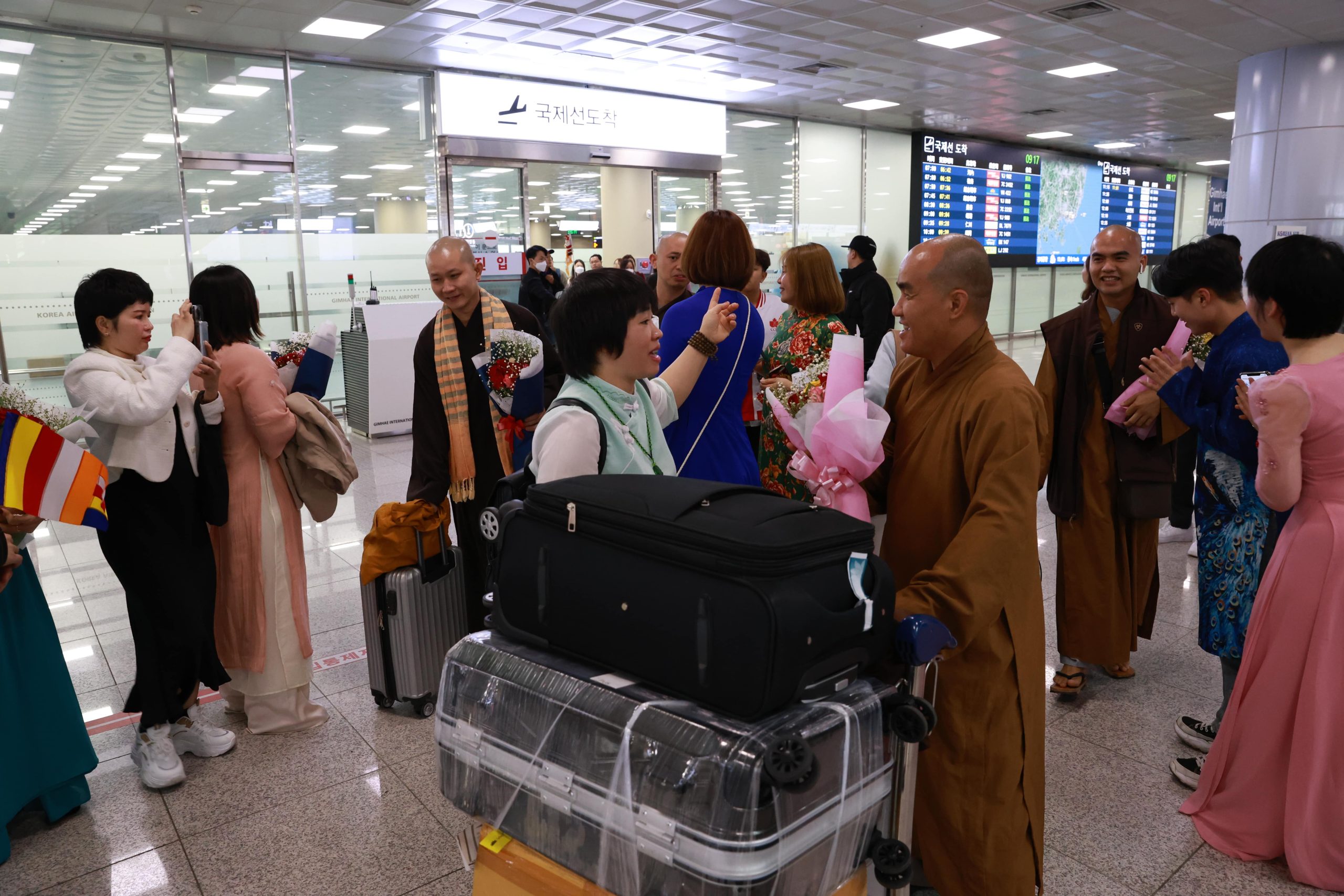 Anh chị em trong đạo tràng rất hạnh phúc và xúc động khi được gặp lại Sư phụ, gặp lại chư tôn đức Tăng, Ni trong đoàn, cùng Phật tử Việt Nam. Sau khi vấn an sức khoẻ, chụp ảnh lưu niệm tại sân bay, đoàn đã trở về chùa Hải Tinh để bắt tay vào công tác chuẩn bị cho khóa tu “Kiến tạo bình an” chính thức diễn ra vào ngày 13 và 14/4/2024 tại Chùa Hải Tinh, TP. Gimhae, Hàn Quốc.