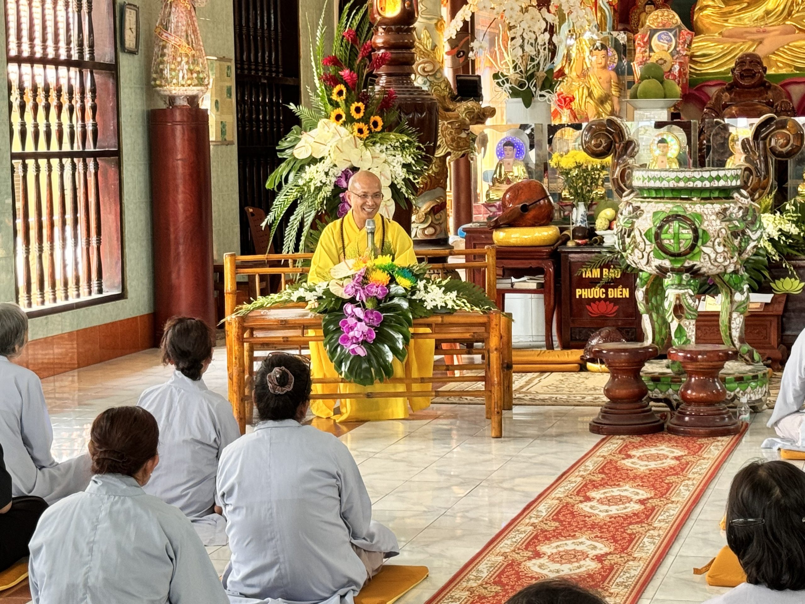 Lúc 15 giờ, ĐĐ. Thích Thiện Hưng – Trụ trì chùa Tam Bảo, đã có thời thuyết giảng về Pháp môn Tịnh độ. Nội dung buổi pháp thoại xoay quanh Tư tưởng Tịnh độ của Đại sư Thiện Đạo. Đại đức đã chia sẻ về những điểm đặc sắc của Pháp môn niệm Phật, đặt biệt là trì danh Niệm Phật mà Đại sư Thiện Đạo đã chỉ dạy. Đại đức giảng sư đã chỉ ra 6 yếu tố đặc sắc của pháp môn niệm Phật mà hành giả cần phải nắm rõ khi hành trì, bao gồm: