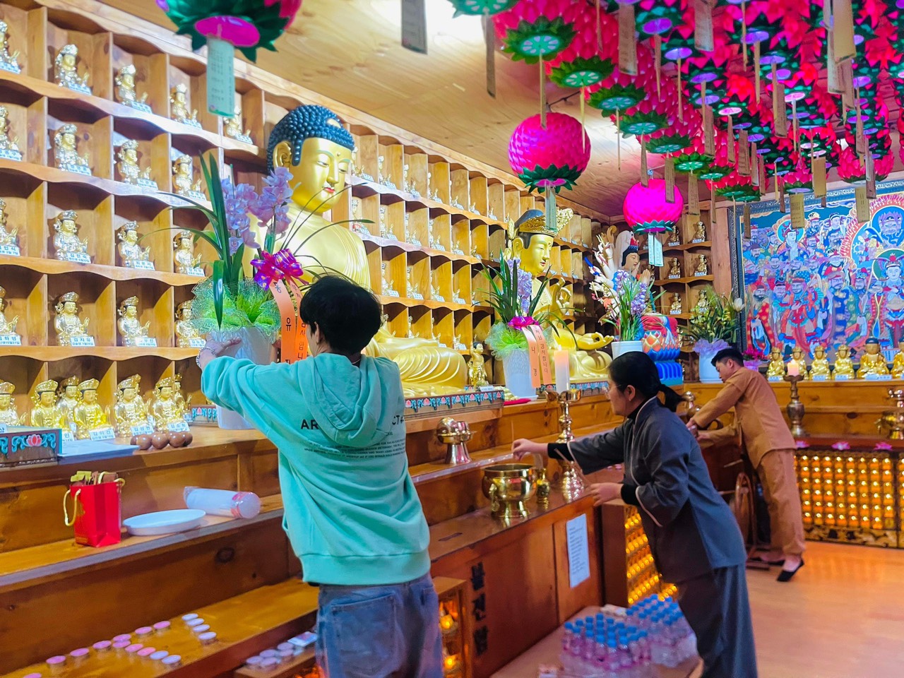 Vào lúc 10 giờ 30 Các Phật tử tại thành phố 포항 – PoHang và các nơi đã vân tập về chùa để tham dự lễ và làm công quả đầu năm tại chùa nơi bình yên và thanh tịnh, với mong muốn tìm được sự bình an, gạt bỏ đi những muộn phiền những lo âu của năm cũ và cầu mong những may mắn, hạnh phúc đến trong năm mới. Vào đầu giờ chiều lúc 13 giờ 00 lễ Cầu an được chính thức bắt đầu. Sau nghi thức dâng hương bạch Phật và thức thỉnh chuông Đại hồng, tiếp nối là lễ tụng kinh Cầu an đầu năm trong không khí trang nghiêm và an lạc. Khóa lễ kết thúc viên mãn hòa lẫn những nụ cười hoan hỉ của chư huynh đệ Kiều bào khi đón Tết xa quê. Sau đó đại chúng giành cho nhau những món quà đầu năm may mắn đầy yêu thương. Thay mặt Ban tổ chức Đạo Tràng Viện Chuyên Tu Tại Hàn Quốc khu vực Pohang (포항), chúng con xin gửi lời tri ân tới Hoà thượng trụ trì chùa Đức Hưng đã tạo nhân duyên cho quý Phật tử được tham gia khoá lễ Cầu an. Đồng kính gửi lời cảm ơn chân thành tới các Phật tử đã bớt thời gian quý báu của mình về tham dự buổi lễ.