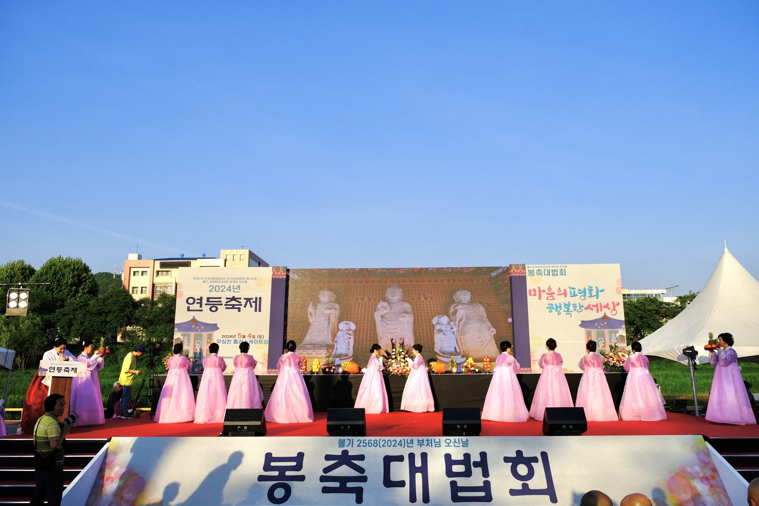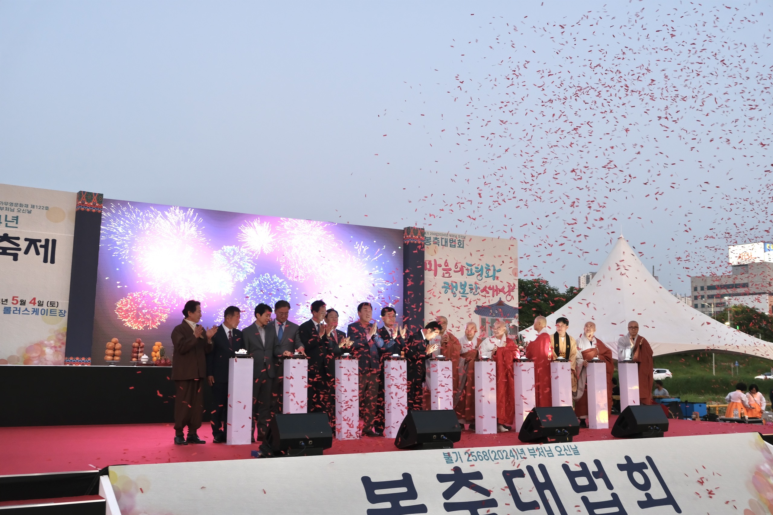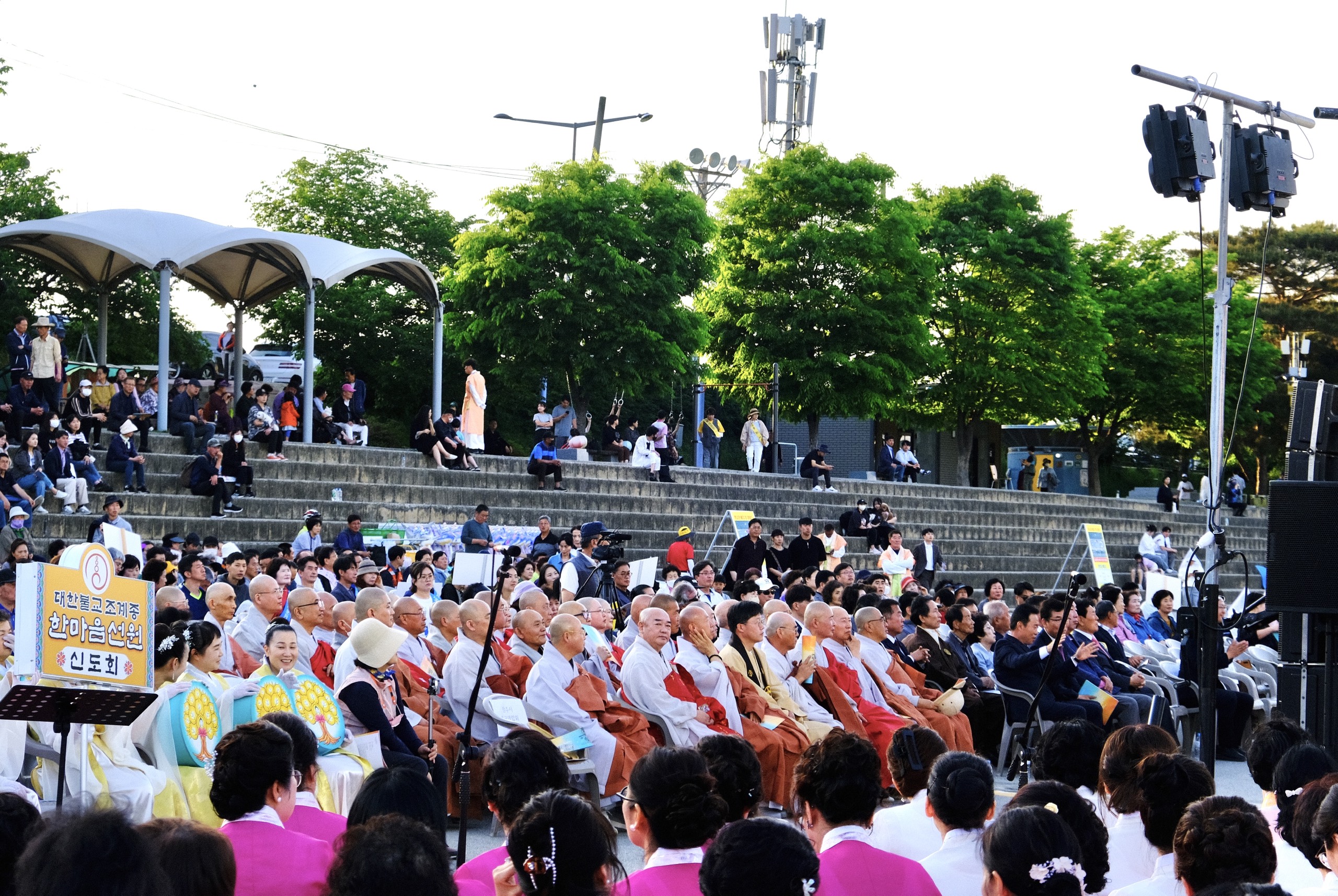 Vào lúc 18giờ, quý Tôn đức trụ trì các ngôi tòng lâm, tự viện trong tỉnh đã quang lâm chứng minh và quý Phật tử vân tập về sân vận động Musimcheon.