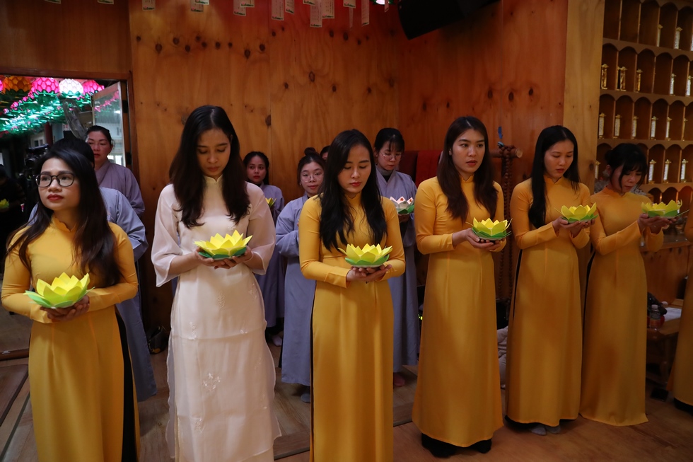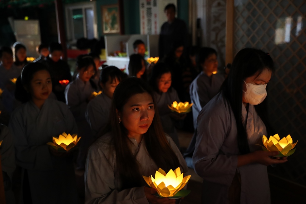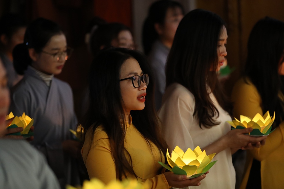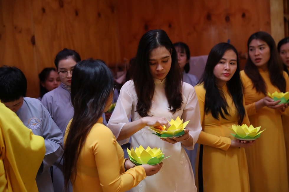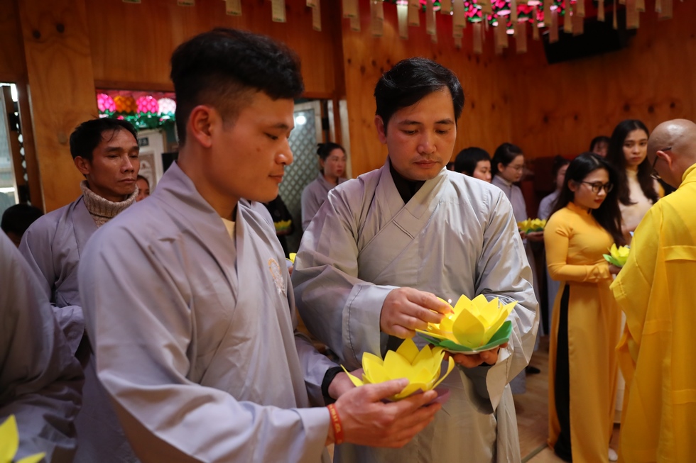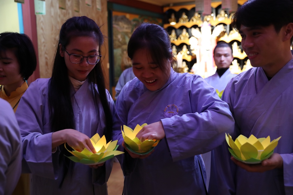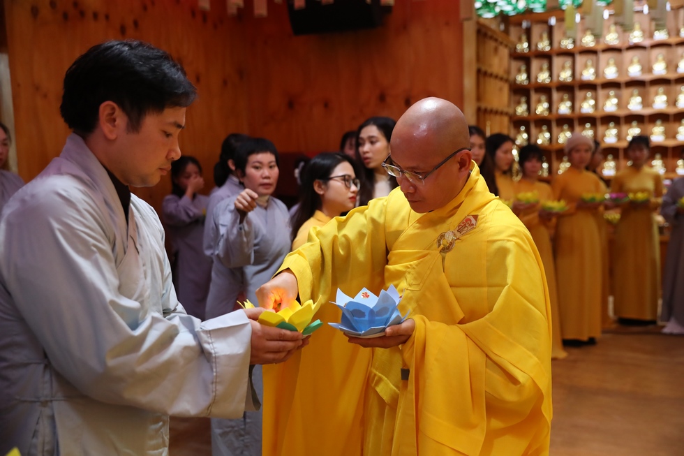 Tiếp nối chương trình là nghi lễ thắp nến truyền đăng, đón nhận ánh sáng trí tuệ từ bàn Phật, từng ngọn nến lần lượt được thắp sáng và truyền tay đến các quý Phật tử, cứ thế ánh sáng trí tuệ tiếp tục được truyền đi, vùng sáng đã dần lan tỏa khắp chùa, soi rọi những nét mặt thành tâm của những người con Phật. Ánh sáng của những ngọn nến lung linh ấy như gói trọn tấm lòng tri ân của chư hành giả niệm Phật, dâng lên đấng Thiện thệ A Di Đà-vị cha lành của muôn loài.