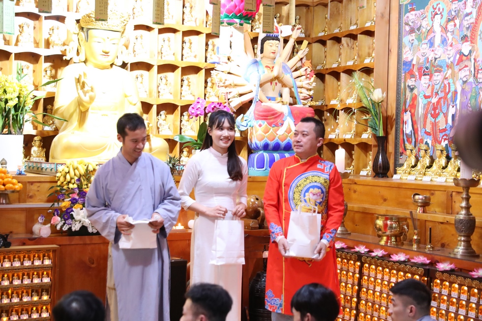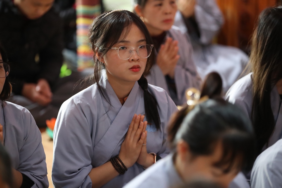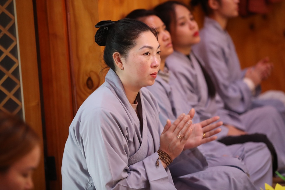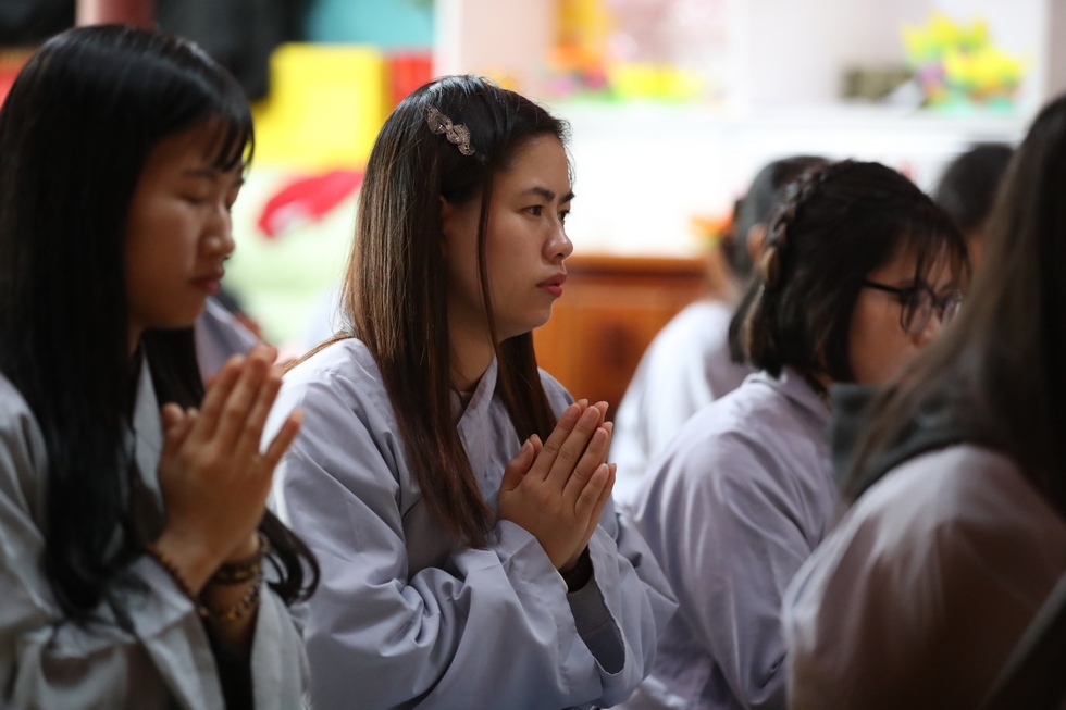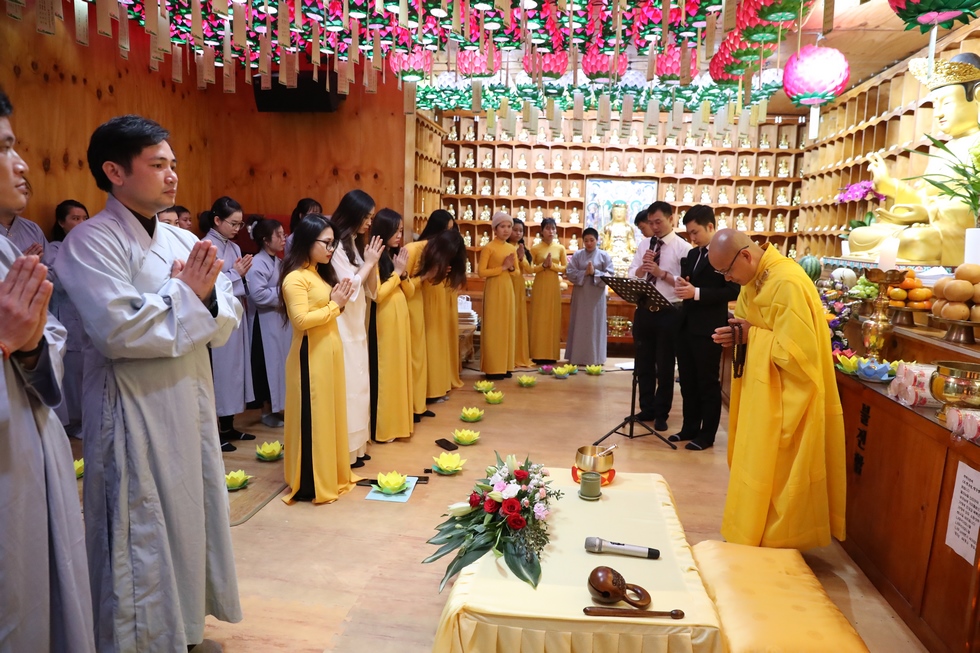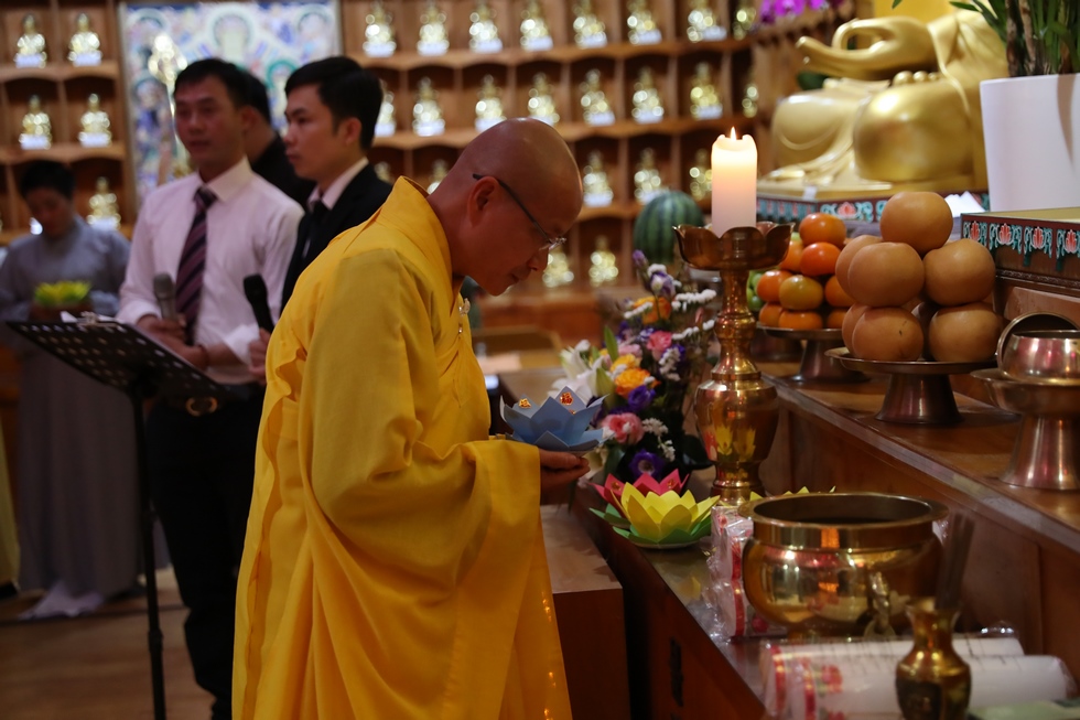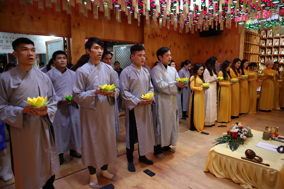 Tiếp nối chương trình là nghi lễ thắp nến truyền đăng, đón nhận ánh sáng trí tuệ từ bàn Phật, từng ngọn nến lần lượt được thắp sáng và truyền tay đến các quý Phật tử, cứ thế ánh sáng trí tuệ tiếp tục được truyền đi, vùng sáng đã dần lan tỏa khắp chùa, soi rọi những nét mặt thành tâm của những người con Phật. Ánh sáng của những ngọn nến lung linh ấy như gói trọn tấm lòng tri ân của chư hành giả niệm Phật, dâng lên đấng Thiện thệ A Di Đà-vị cha lành của muôn loài.