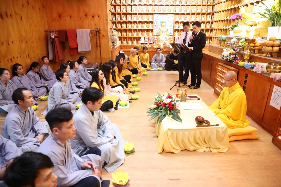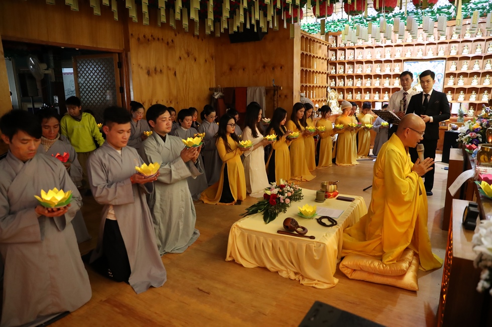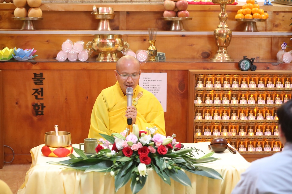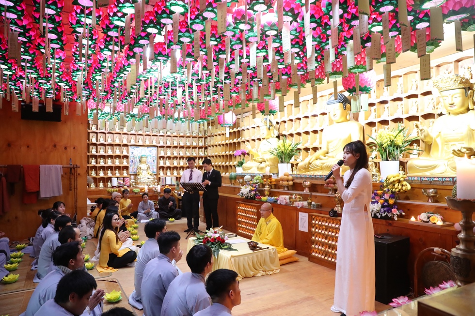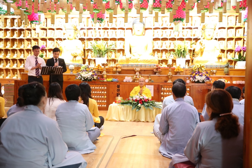 Tham dự có ĐĐ. Thích Thiện Hưng – Tổng điều phối đạo tràng – Trưởng Ban tổ chức – Trụ trì chùa Tam bảo – Việt Nam và đông đảo bà con Phật tử người Việt tại Hàn Quốc vân tập về chùa, làm lễ tưởng niệm tri ân, dâng đèn hoa đăng, tụng kinh, niện Phật, mừng ngày khánh đản Đức Phật A Di Đà. Sau lời tuyên bố lý do, giới thiệu thành phần tham dự. ĐĐ. Thích Thiện Hưng đã sơ lược về công hạnh và nguồn gốc ngày khánh vía của Đức Phật A Di Đà.