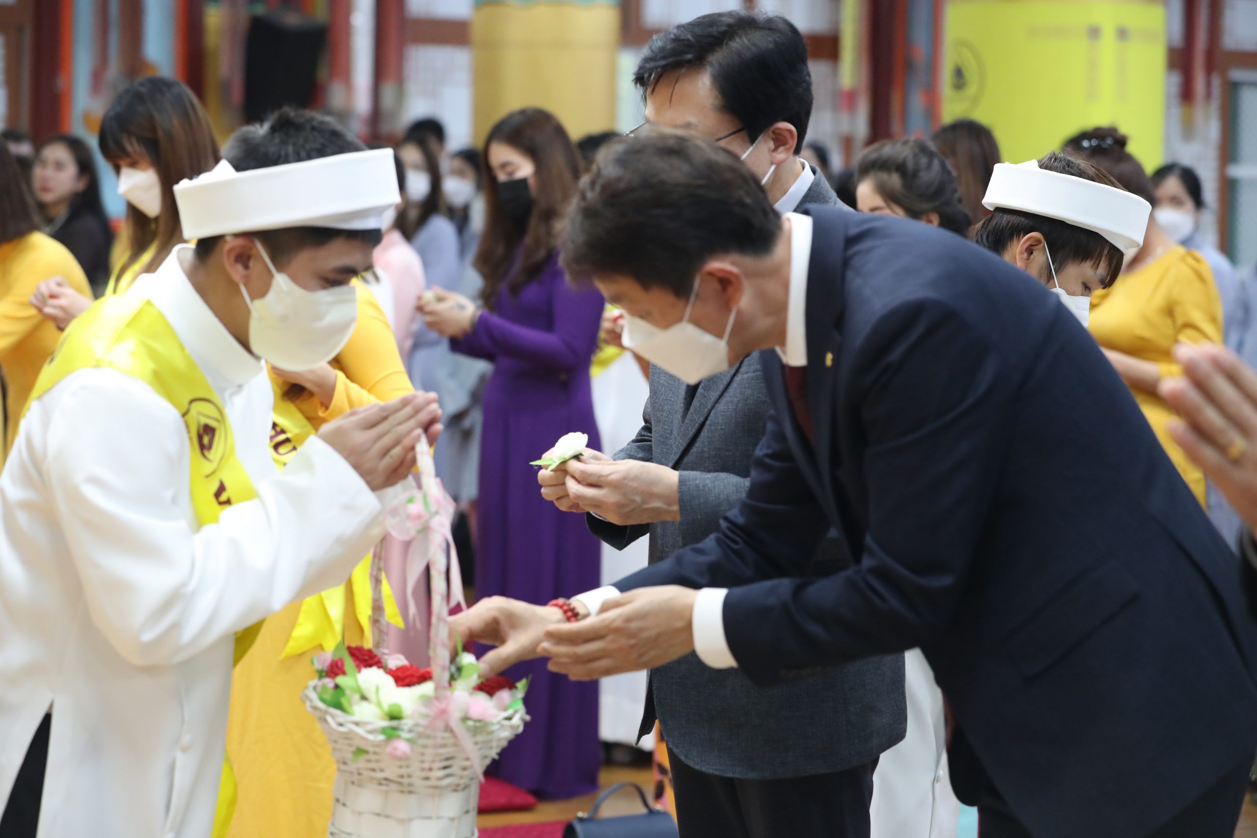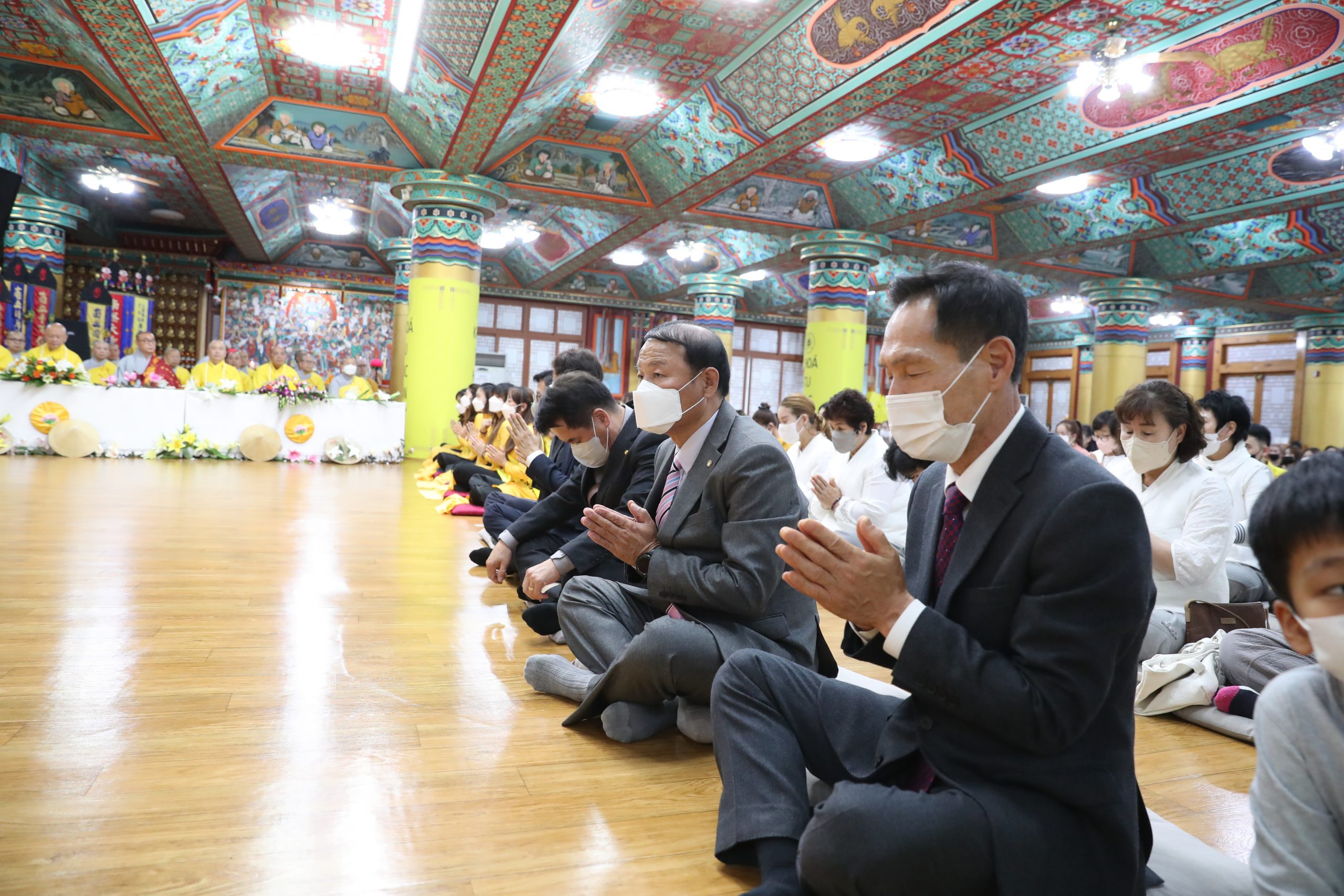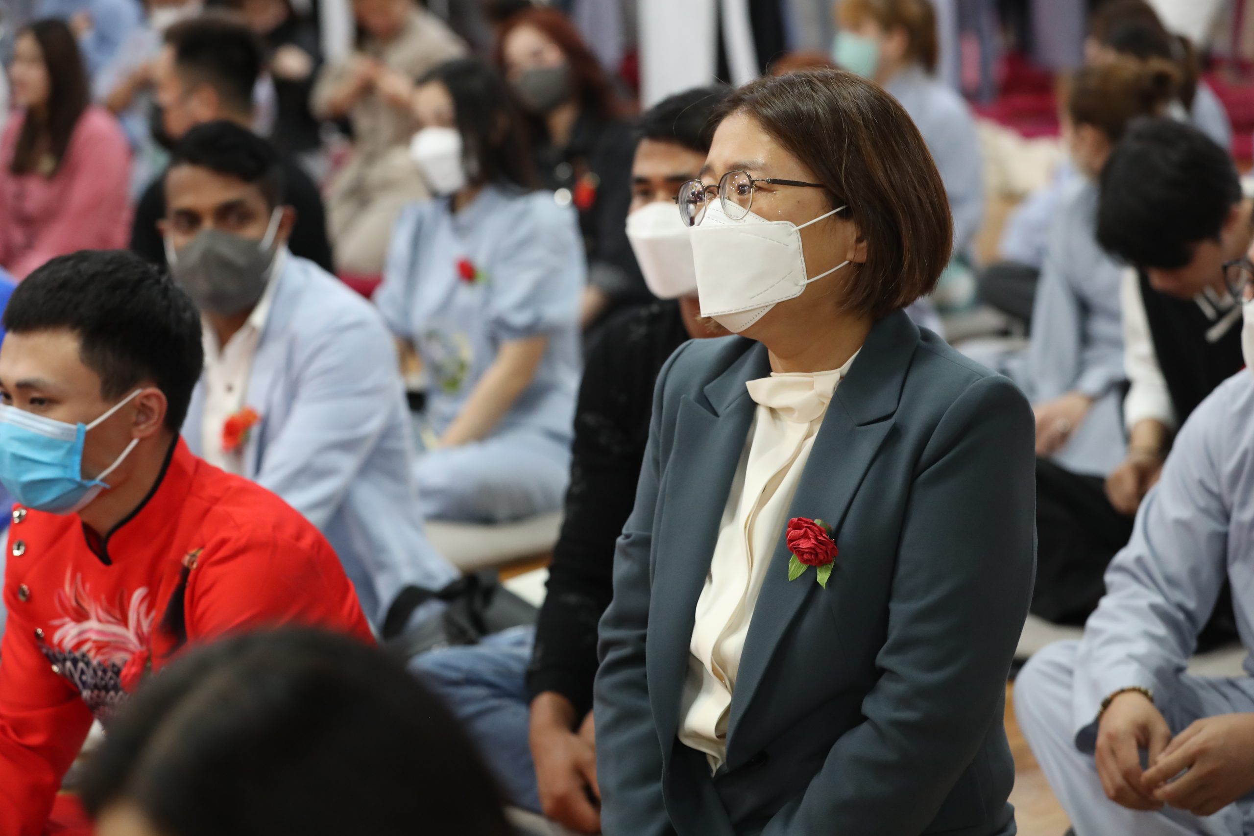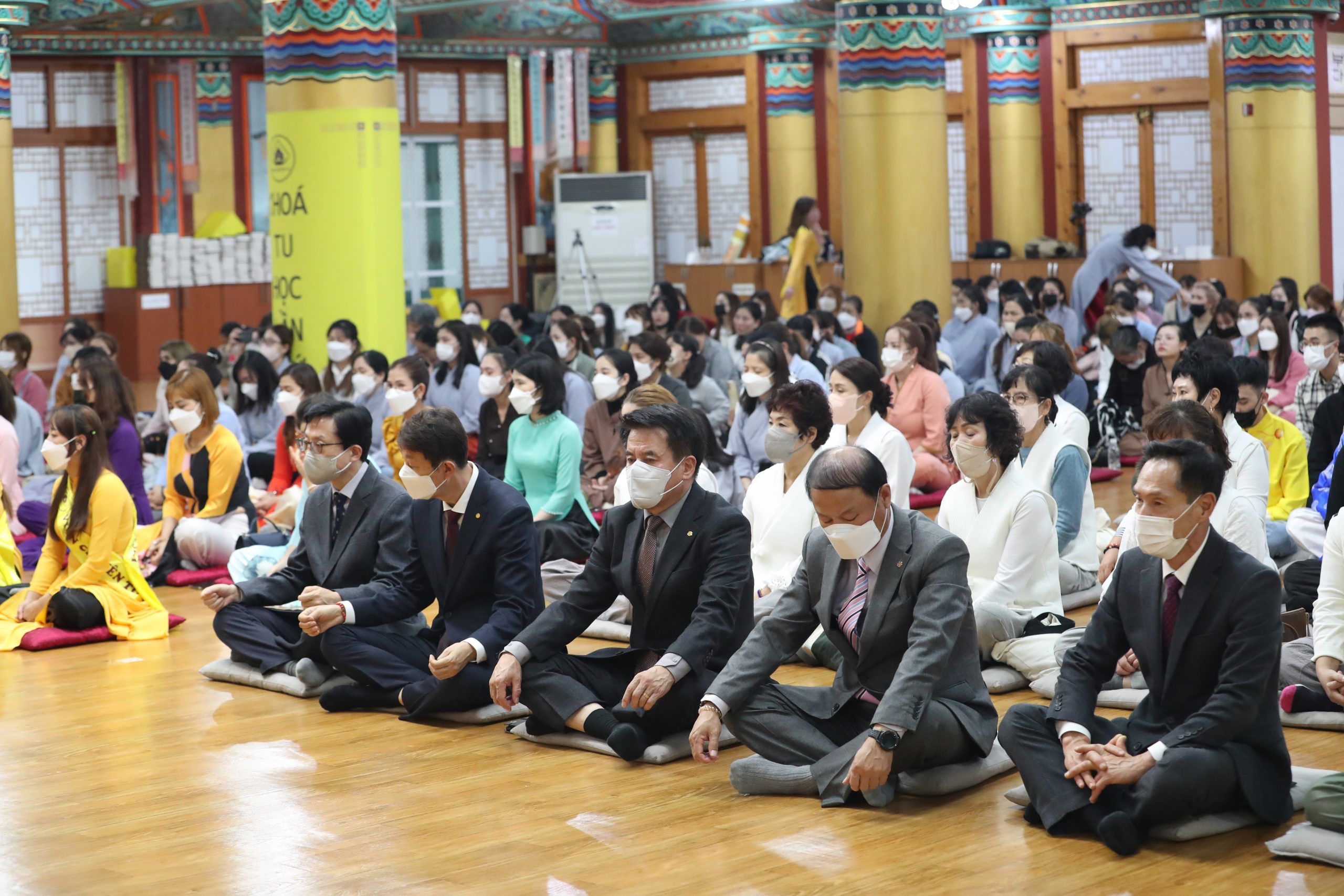 Chứng minh tham dự buổi lễ có HT. Yu-Cheong trụ trì chùa Hoàng Hải, Tp.Pohang, chư tôn đức Tông Phái Thiên Thai, Giáo Hội Phật Giáo Hàn Quốc. Về phía đoàn Việt Nam có TT. Thích Nhuận Quang – Phó Ban Trị sự GHPGVN Quận 12, Trưởng BTC; TT. Thích Thiện Thuận – UV thường trực Ban Hoằng Pháp Trung ương GHPGVN; Viện chủ Viện Chuyên tu, Phó ban Tổ chức Khóa tu, cùng Chư tôn thiền đức Tăng Ni Việt Nam từ khắp các Châu lục cùng tham dự lễ. Buổi lễ còn có sự tham dự của Ban điều hành Chùa Hoàng Hải