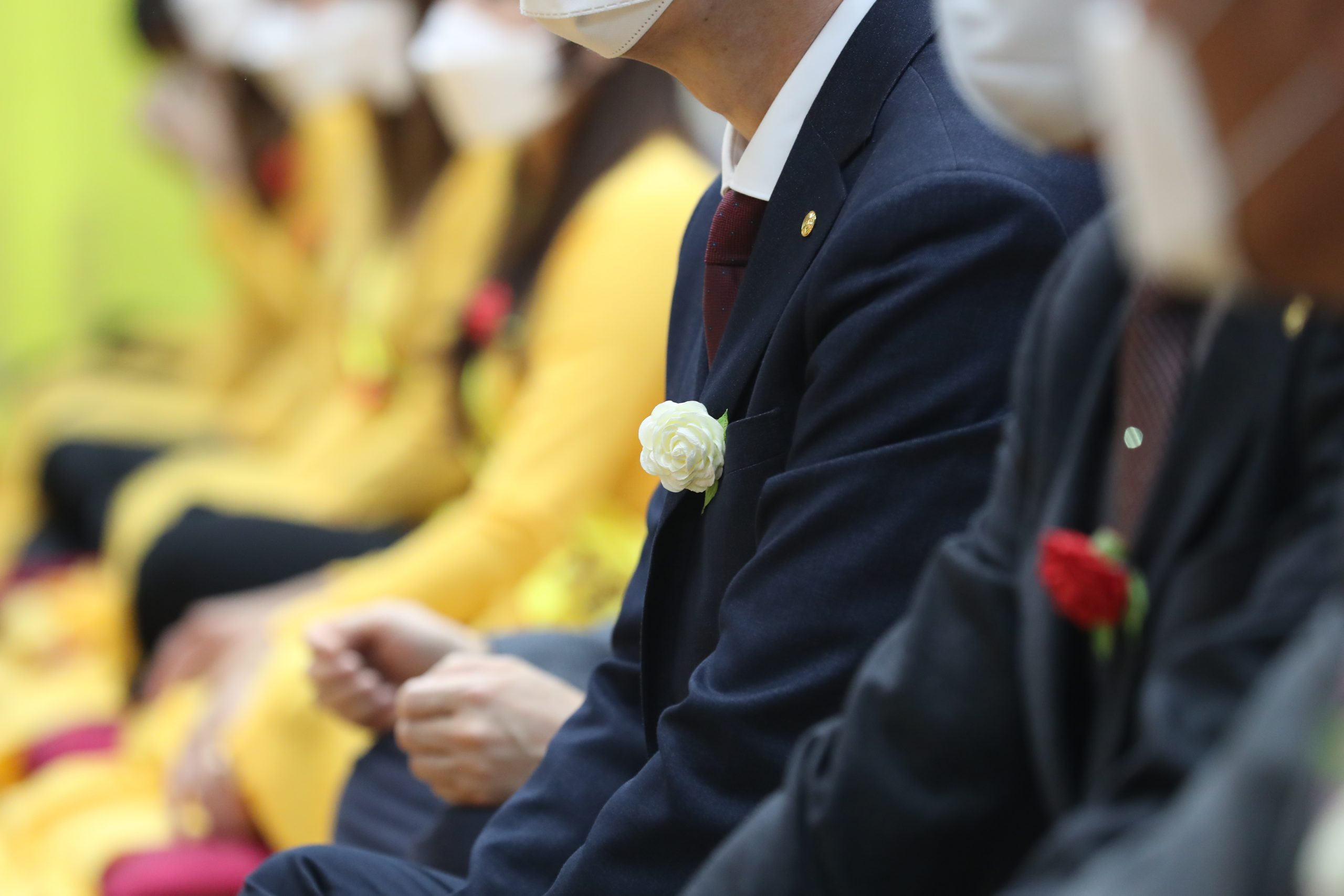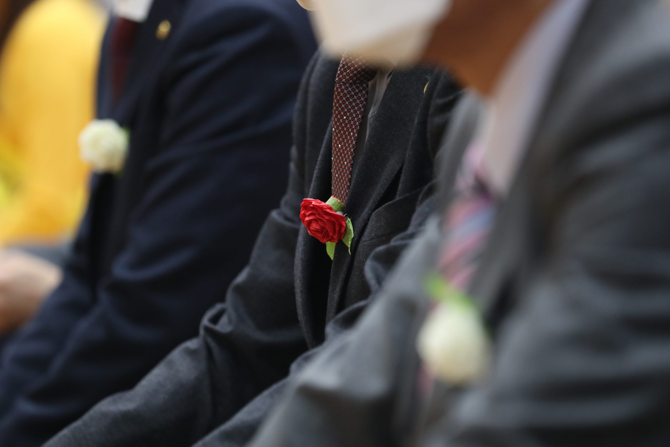 Quan chức Chính quyền Thành phố Pohang cũng thành tâm nhận lấy hoa hồng cài lên ngực áo.