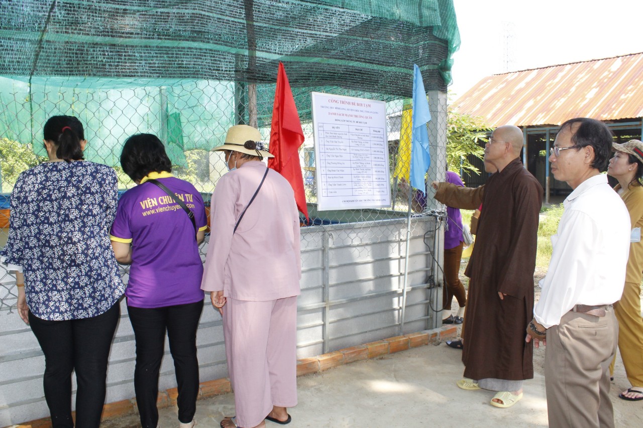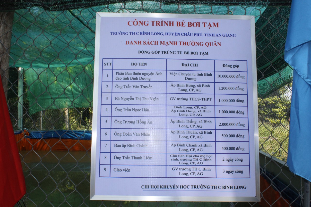 Cách vài Ki-lô-mét, BTN Ánh Đạo đến thăm và trợ duyên cho trường tiểu học, xã Bình Long một hồ tập bơi cho các em học sinh có môi trường tập bơi vì hoàn cảnh miền sông nước nếu không biết bơi sẽ bất lợi lớn đối với các em. Thầy hiệu trưởng và học sinh tiếp đón đoàn cùng tâm sự về việc học tập cũng như những khó khăn của các em nơi vùng xâu này. Thầy hiệu trưởng cho biết năm nào cũng có các em học sinh bị tai nạn về sông nước dẫn đến tử vong. Vì vậy, được sự trợ giúp của các mạnh thường quân xây được hồ bơi trong trường, tạo môi trường tốt để tập bơi cho các em, đây là điều kiện tốt để các em tránh những rủi ro trong sinh hoạt tại môi trường sông nước.