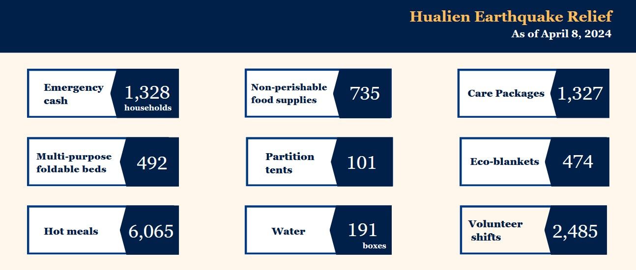 Trước những thảm họa của trận động đất mạnh 7,2 độ richter đã gây ra cho người dân tại khu vực Hoa Liên, Đài Loan, Hội Từ thiện Phật giáo Từ Tế đã không ngừng tổ chức các hoạt động cứu hộ, cứu nạn và tặng tiền mặt, nhu yếu phẩm,… đến người dân vùng bị nạn.