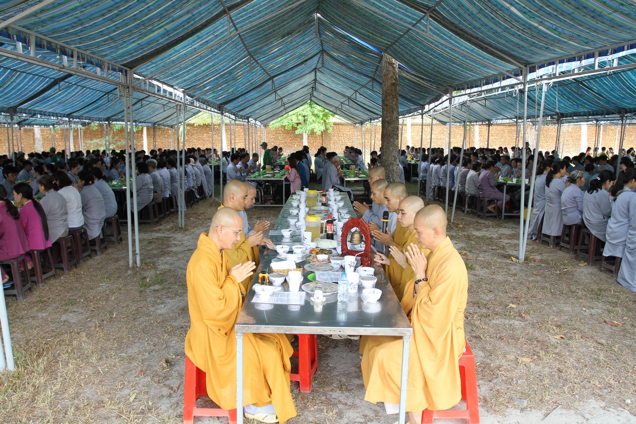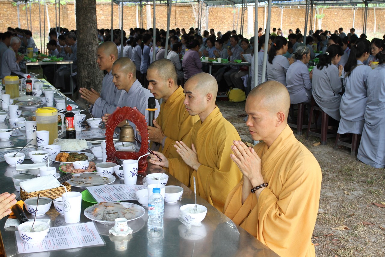 Sau thời Vấn đáp, đại chúng dùng trưa. Đầu giờ chiều hành giả tiếp tục thời khóa niệm Phật và lạy sám Hồng danh, sau cùng là thời phúng tụng phổ thí Thập loại chúng sanh.