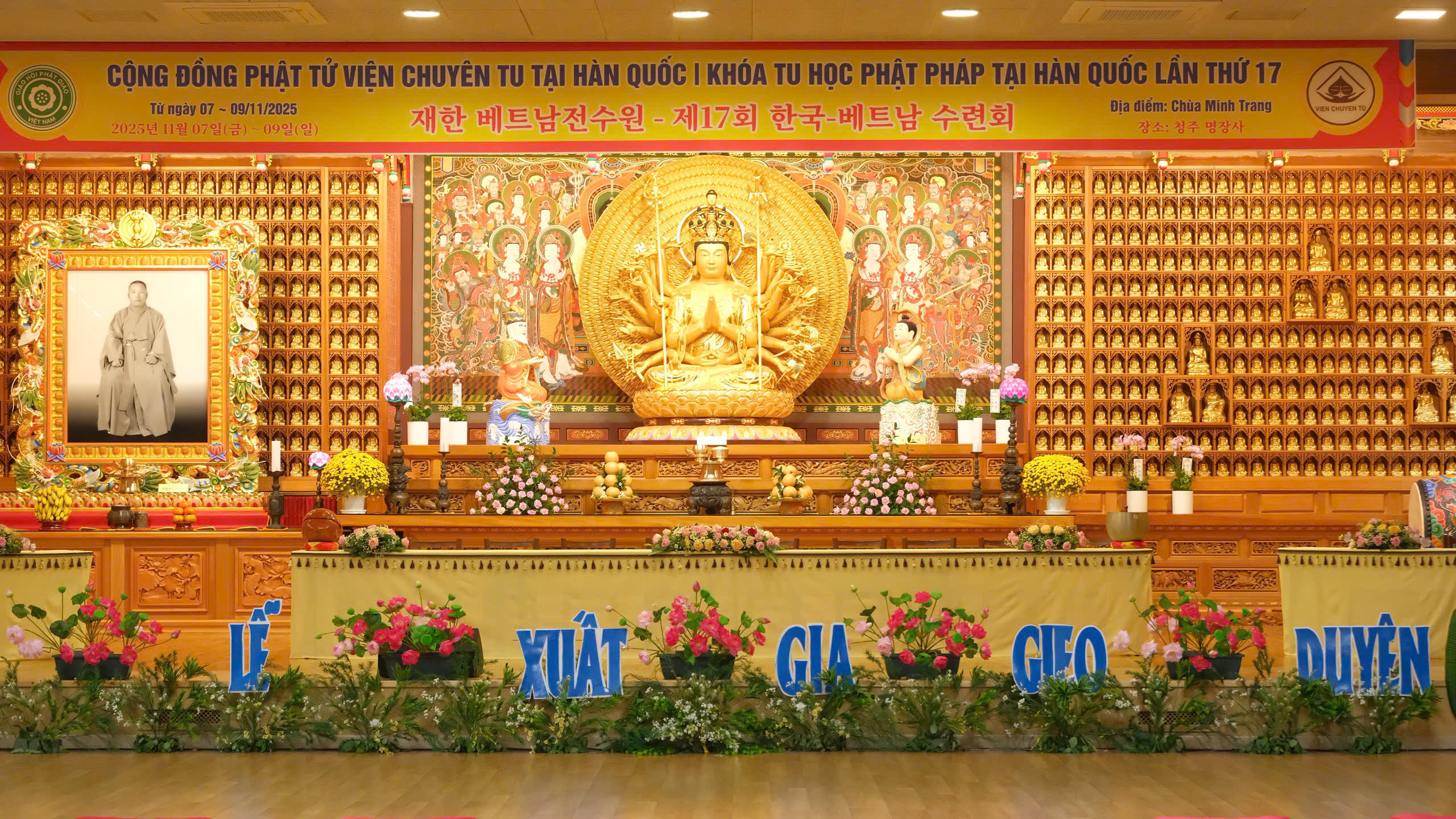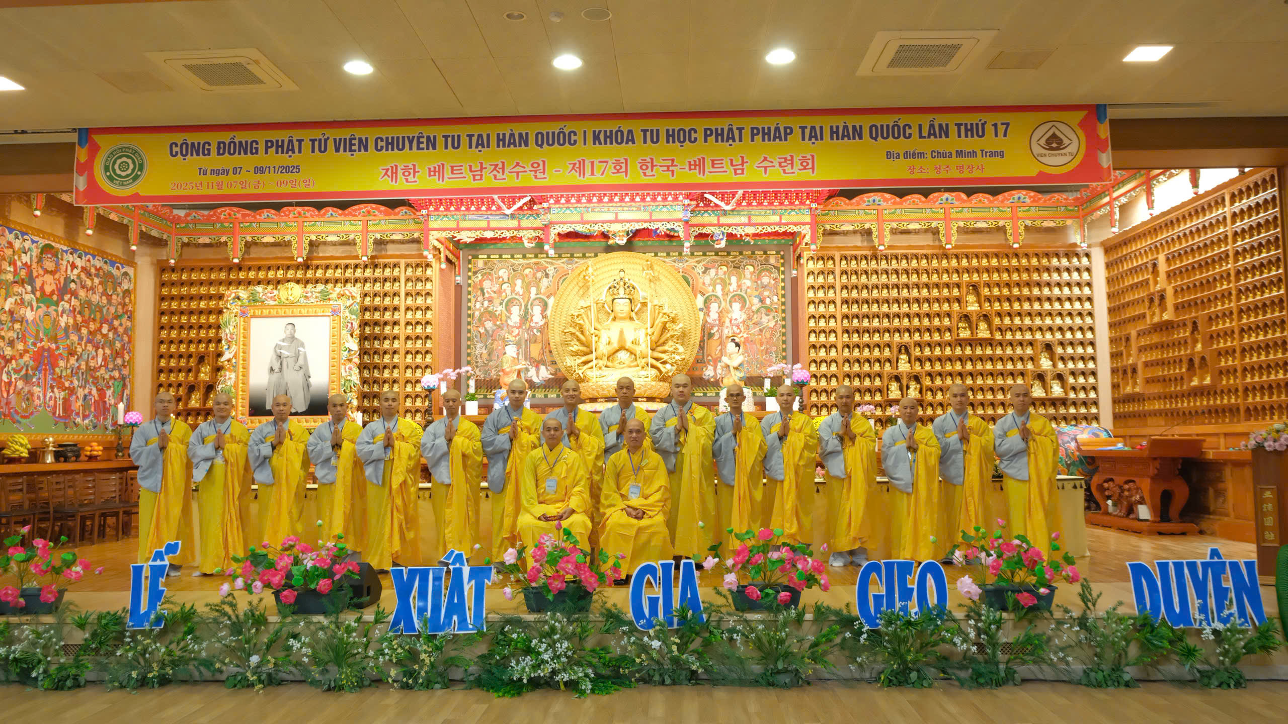 Tối ngày 07/11/2025, trong không khí trang nghiêm tại chùa Minh Trang (thành phố Cheongju, Hàn Quốc), Ban Tổ chức khóa tu học Phật pháp lần thứ 17 đã trang nghiêm cử hành Lễ Thế phát xuất gia gieo duyên và truyền Sa-di giới cho 31 giới tử, những người con Việt xa quê mang khát nguyện tìm về nẻo đạo.