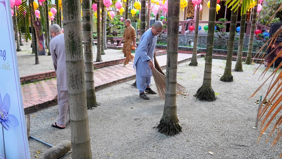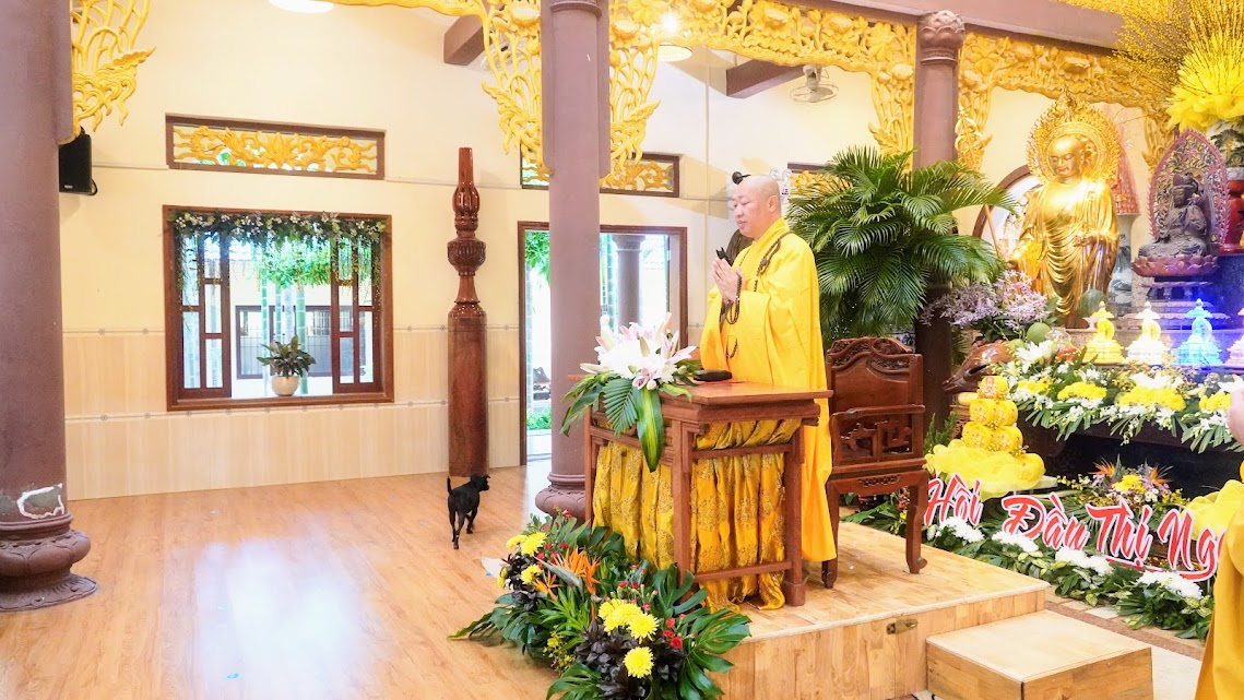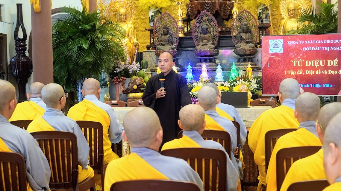 Sau khi thức chúng vào lúc 13h45, các hành giả tập trung tại Chánh điện để học Giáo lý Tứ đế và được lắng nghe giải đáp thắc mắc từ quý Thầy trong Ban giáo thọ. Gần hai tiếng đồng hồ học Pháp để ứng dụng vào đời sống tự thân, Đại chúng giải lao, quét dọn Phật điện và vệ sinh khuôn viên chùa. Tiếng kẻng vang lên lúc 16h30 là thời Dược thạch (Dùng chiều) và vệ sinh cá nhân.