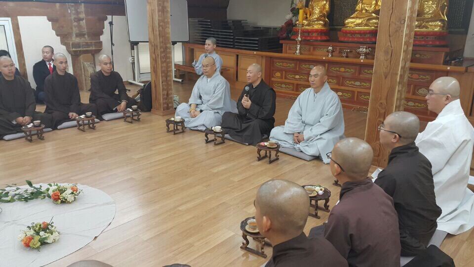 Sau khi tham quan và thưởng ngoạn những công trình giá trị kiến trúc của ngôi chùa khoảng 1700 năm tuổi này nghe giới thiệu về Đại hùng bảo điện, tháp Xá-lợi, điện Quan Âm, cây cổ thụ 400 tuổi tại chùa, đoàn được Thượng tọa Chư Huyễn (Choe Hoan) – Trưởng Ban Kế hoạch và Thượng tọa Chí Hoằng (Ji Hong) đón tiếp với buổi trà đàm, giao lưu thật ấn tượng.