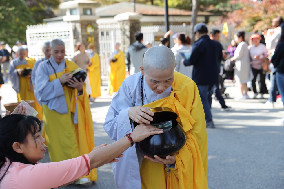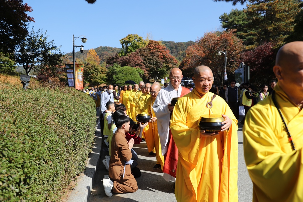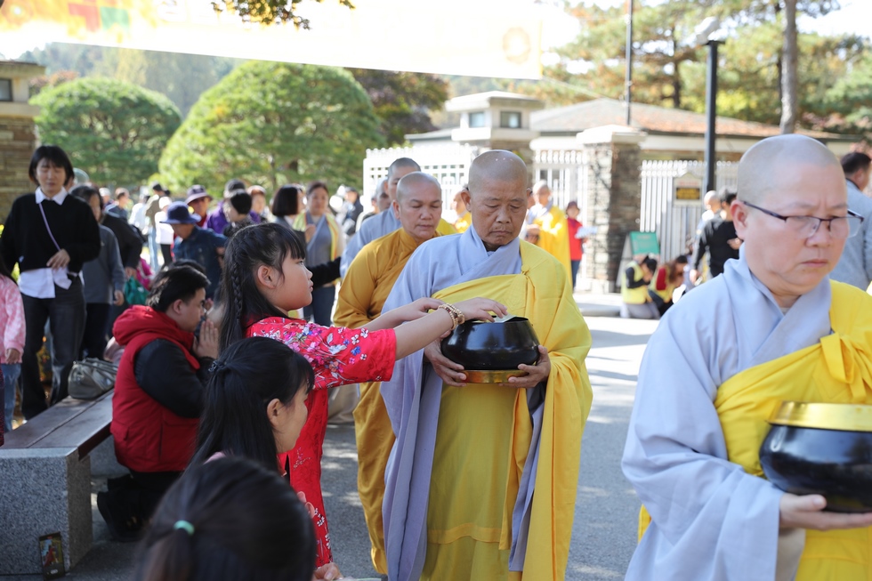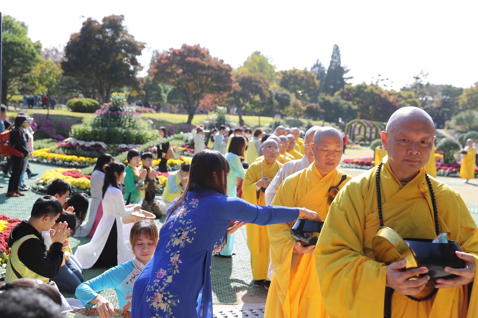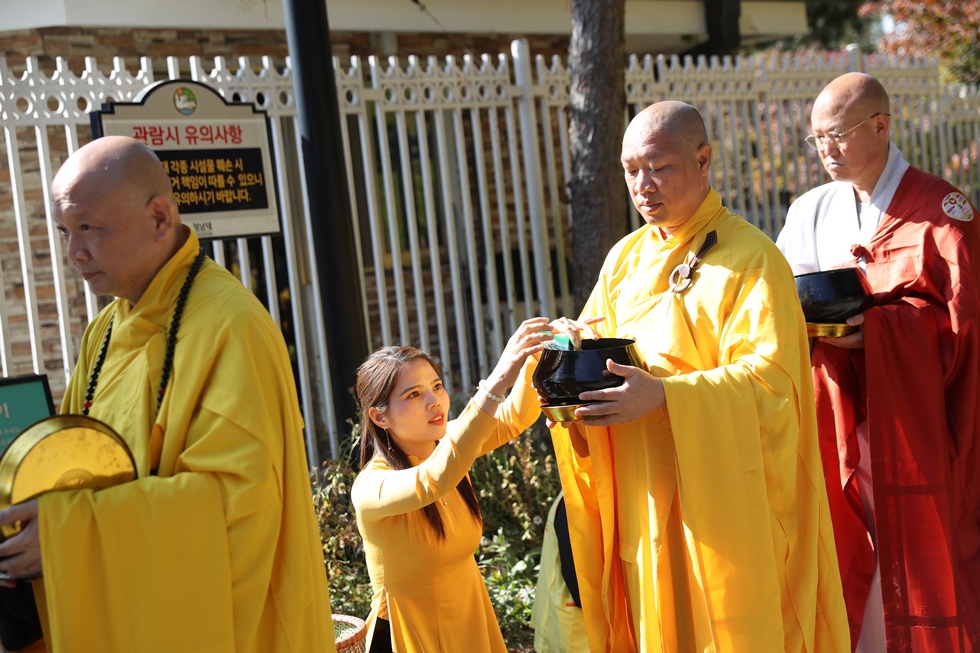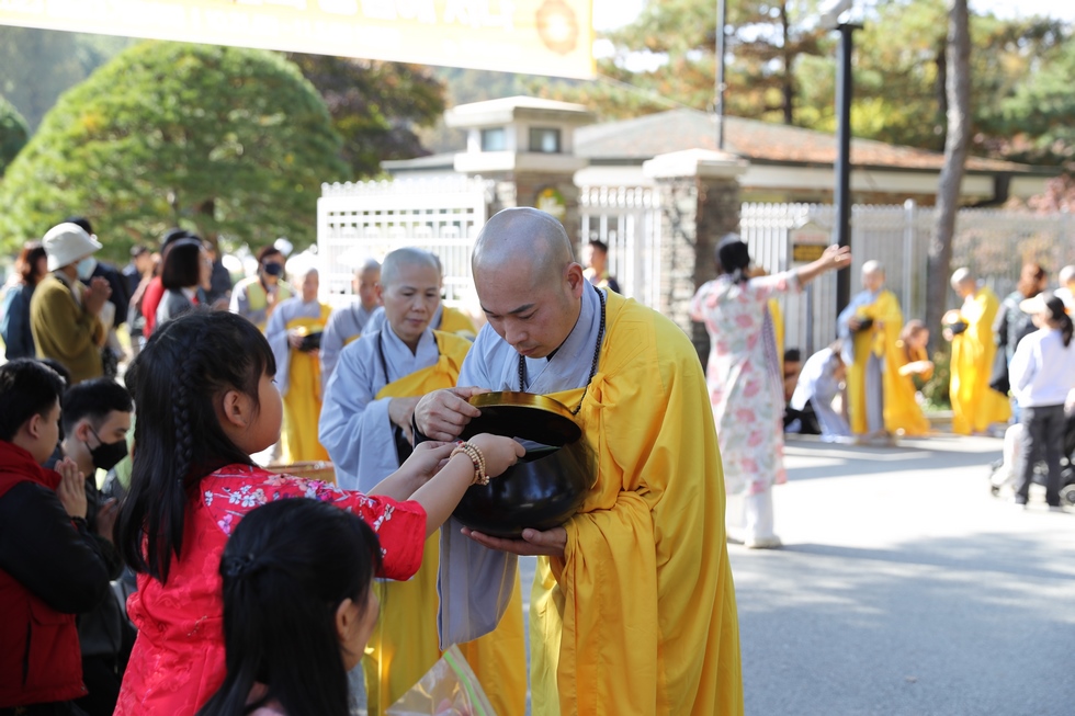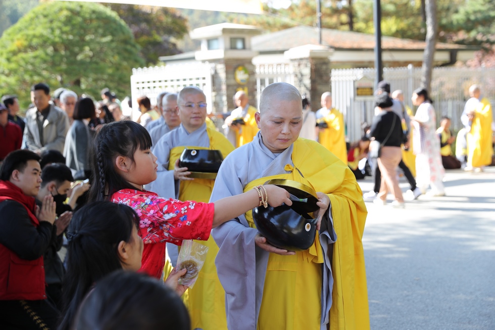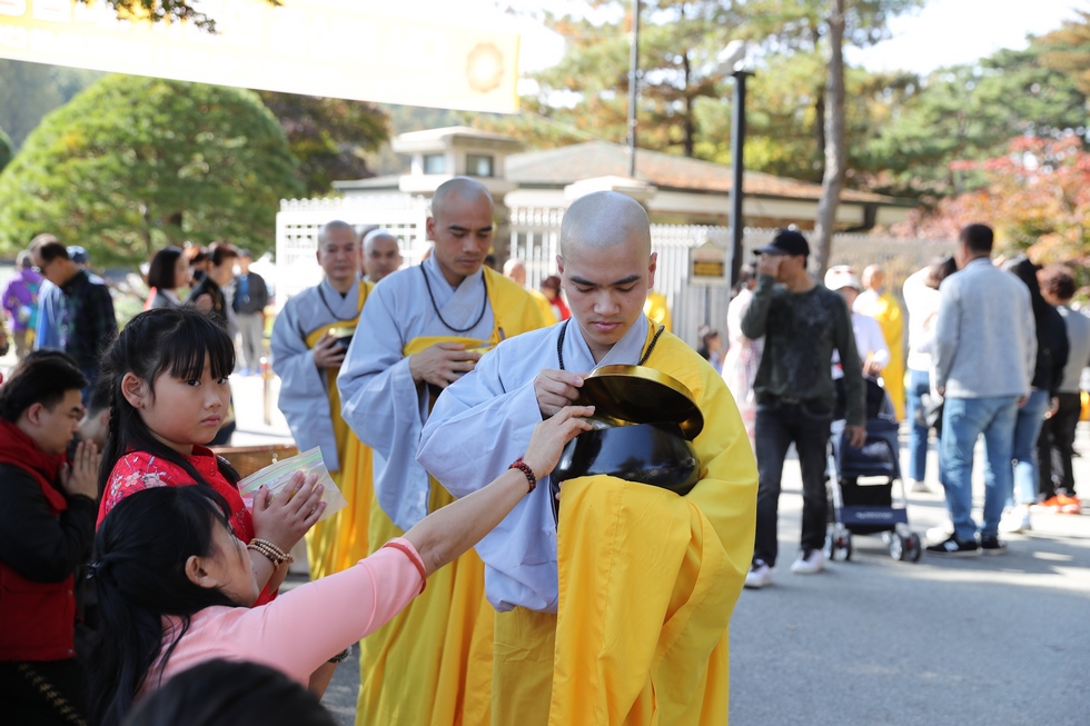 Hình ảnh Tăng đoàn thời Đức Phật ôm bình bát đi khất thực trang nghiêm và thanh tịnh cách đây hơn 26 thế kỷ, đã làm rung động biết bao con tim và tạo niềm tôn kính vô hạn từ bậc vua chúa cho đến hàng thứ dân trong xã hội Ấn Độ. Khung cảnh ấy được ghi chép lại trong những trang kinh hay sách sử, nay được tái hiện lại tại Thanh Nam Đài – nhà xanh ấm áp phía Nam của xứ sở Kim Chi này. Đẹp biết bao giữa tiết trời thu se lạnh, cảnh núi rừng thiên nhiên hùng vĩ và không khí trong lành ngập tràn sắc xanh của hàng trăm cây cổ thụ tươi tốt và thảm cỏ xanh trải dài rộng lớn, hoà cùng hơn 100 loài hoa rực rỡ hương sắc thắm, hồ nước Daecheong trong xanh như ngọc, với bình bát “Ứng lượng khí” trên tay, quý Ngài từng bước chân chánh niệm kinh hành trên con đường rợp bóng, vườn cúc nở rộ, ngập tràn hương thơm của cỏ hoa. Quỳ dọc hai bên đường, từng nhóm Phật tử với lòng tịnh tín bất động đối với Tam bảo, cầm trên tay những phẩm vật thành kính dâng lên cúng dường quý Ngài.