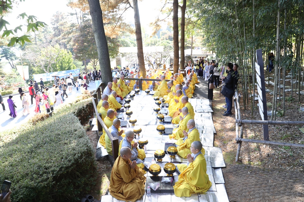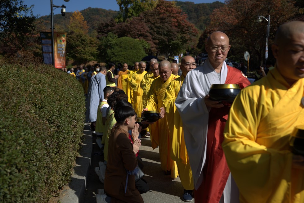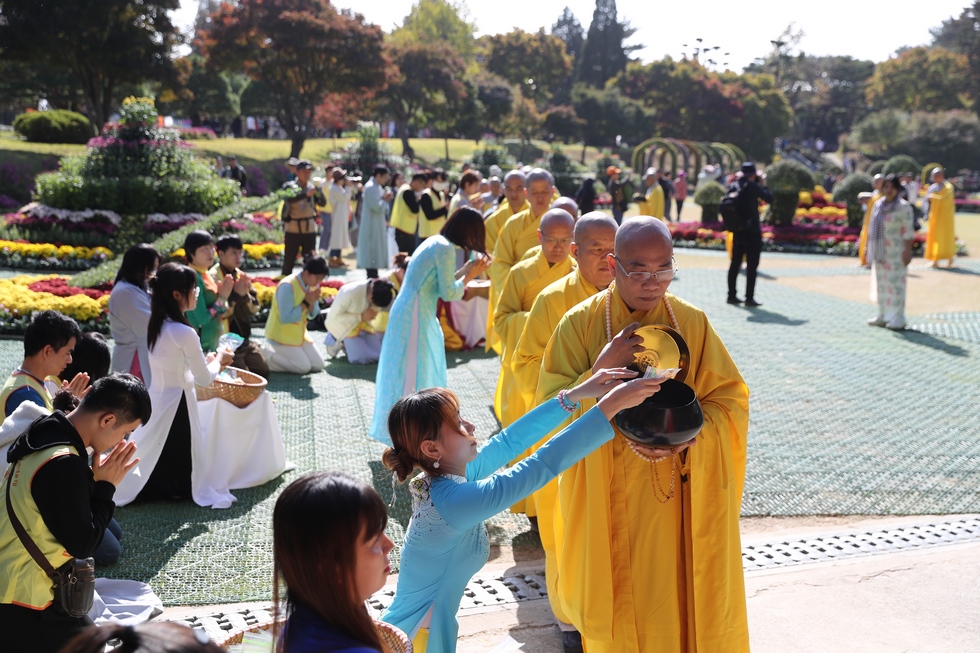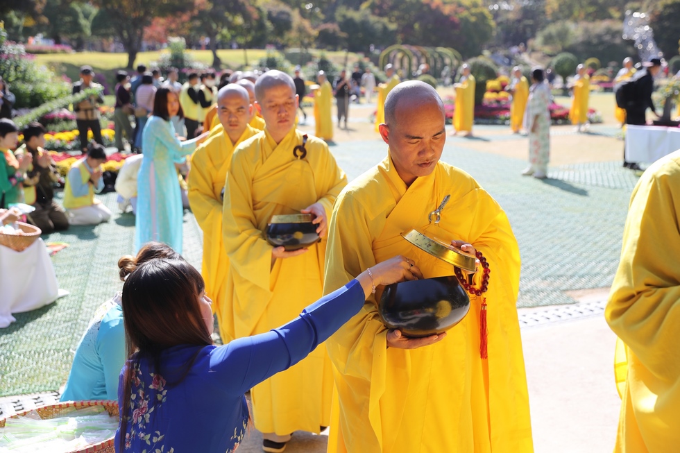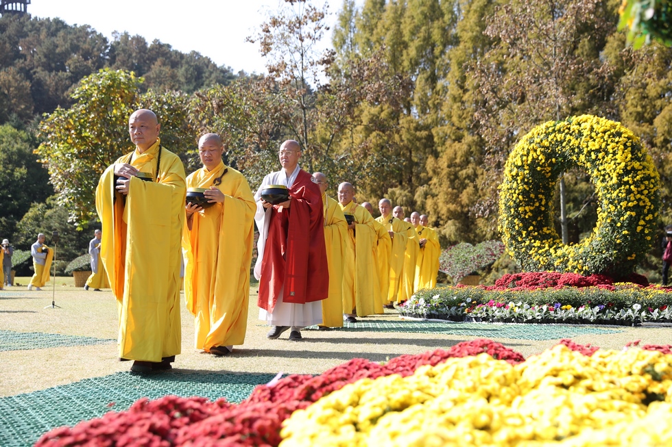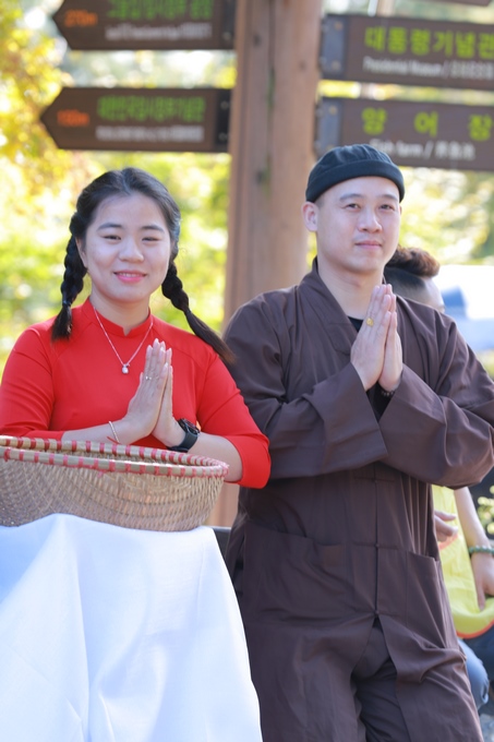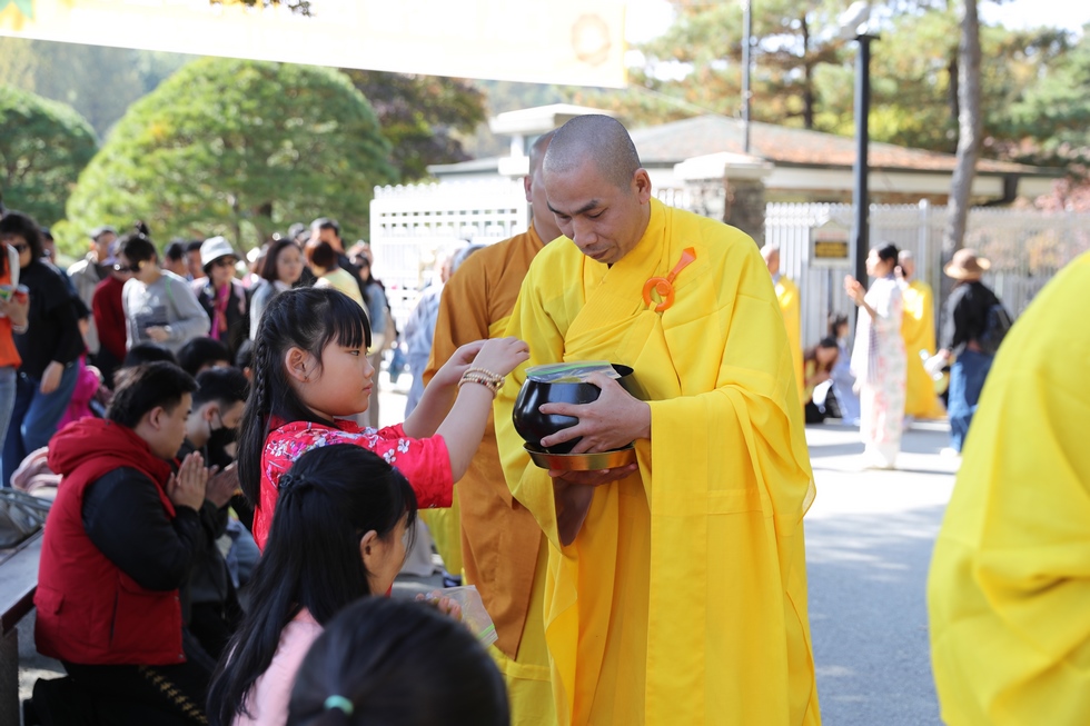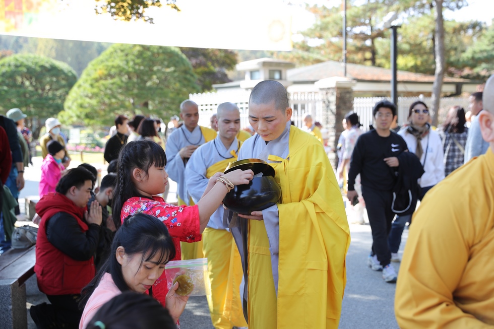 Hình ảnh Tăng đoàn thời Đức Phật ôm bình bát đi khất thực trang nghiêm và thanh tịnh cách đây hơn 26 thế kỷ, đã làm rung động biết bao con tim và tạo niềm tôn kính vô hạn từ bậc vua chúa cho đến hàng thứ dân trong xã hội Ấn Độ. Khung cảnh ấy được ghi chép lại trong những trang kinh hay sách sử, nay được tái hiện lại tại Thanh Nam Đài – nhà xanh ấm áp phía Nam của xứ sở Kim Chi này. Đẹp biết bao giữa tiết trời thu se lạnh, cảnh núi rừng thiên nhiên hùng vĩ và không khí trong lành ngập tràn sắc xanh của hàng trăm cây cổ thụ tươi tốt và thảm cỏ xanh trải dài rộng lớn, hoà cùng hơn 100 loài hoa rực rỡ hương sắc thắm, hồ nước Daecheong trong xanh như ngọc, với bình bát “Ứng lượng khí” trên tay, quý Ngài từng bước chân chánh niệm kinh hành trên con đường rợp bóng, vườn cúc nở rộ, ngập tràn hương thơm của cỏ hoa. Quỳ dọc hai bên đường, từng nhóm Phật tử với lòng tịnh tín bất động đối với Tam bảo, cầm trên tay những phẩm vật thành kính dâng lên cúng dường quý Ngài.