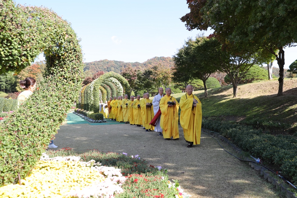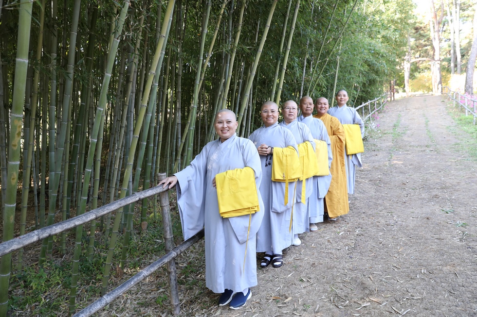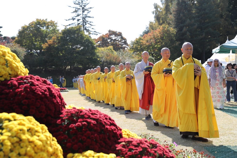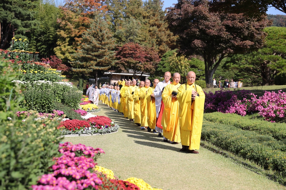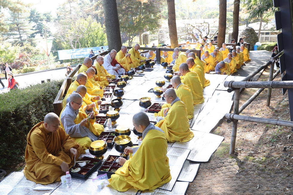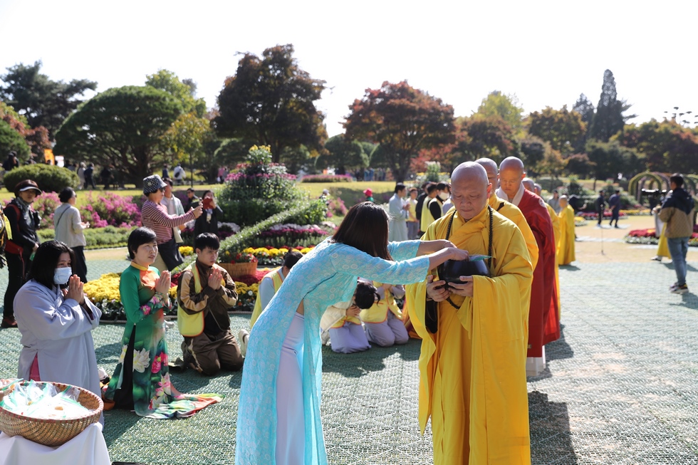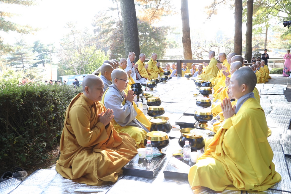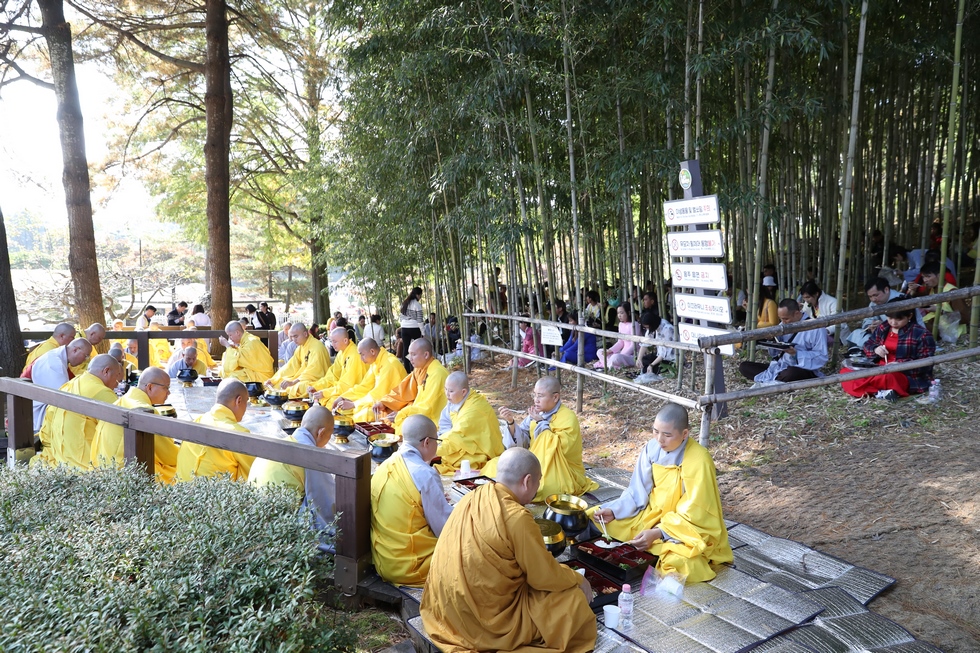 Hình ảnh Tăng đoàn thời Đức Phật ôm bình bát đi khất thực trang nghiêm và thanh tịnh cách đây hơn 26 thế kỷ, đã làm rung động biết bao con tim và tạo niềm tôn kính vô hạn từ bậc vua chúa cho đến hàng thứ dân trong xã hội Ấn Độ. Khung cảnh ấy được ghi chép lại trong những trang kinh hay sách sử, nay được tái hiện lại tại Thanh Nam Đài – nhà xanh ấm áp phía Nam của xứ sở Kim Chi này. Đẹp biết bao giữa tiết trời thu se lạnh, cảnh núi rừng thiên nhiên hùng vĩ và không khí trong lành ngập tràn sắc xanh của hàng trăm cây cổ thụ tươi tốt và thảm cỏ xanh trải dài rộng lớn, hoà cùng hơn 100 loài hoa rực rỡ hương sắc thắm, hồ nước Daecheong trong xanh như ngọc, với bình bát “Ứng lượng khí” trên tay, quý Ngài từng bước chân chánh niệm kinh hành trên con đường rợp bóng, vườn cúc nở rộ, ngập tràn hương thơm của cỏ hoa. Quỳ dọc hai bên đường, từng nhóm Phật tử với lòng tịnh tín bất động đối với Tam bảo, cầm trên tay những phẩm vật thành kính dâng lên cúng dường quý Ngài.