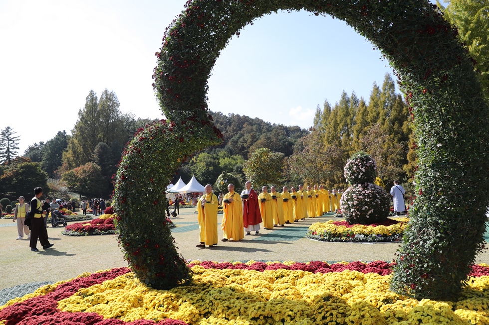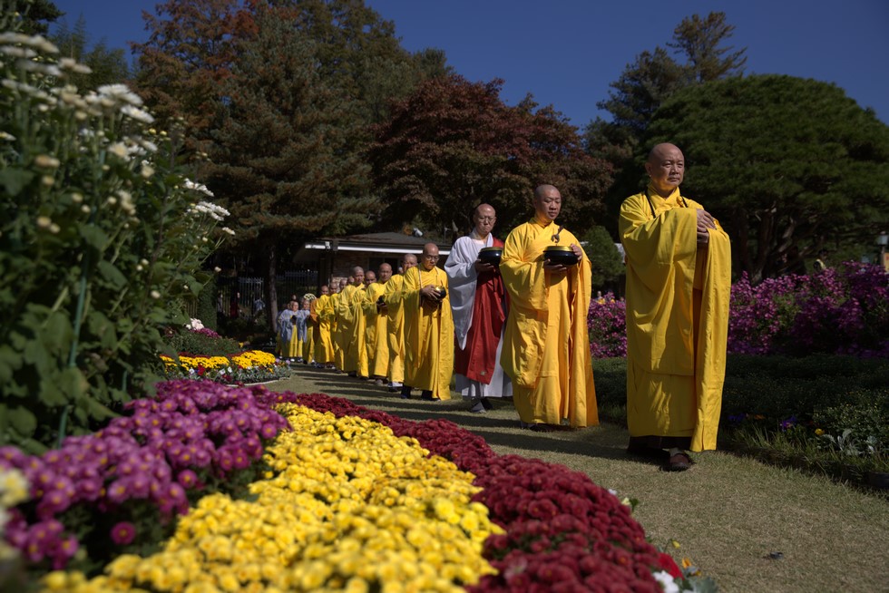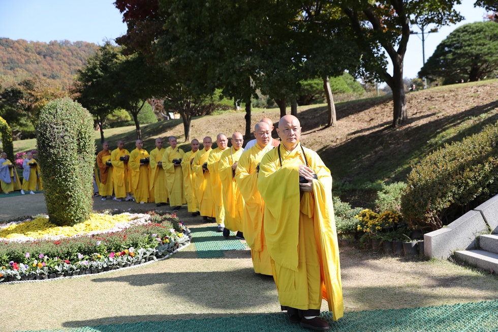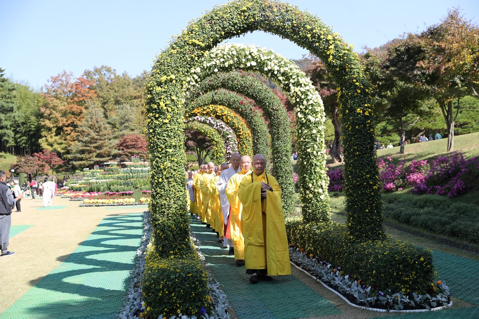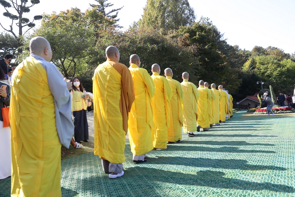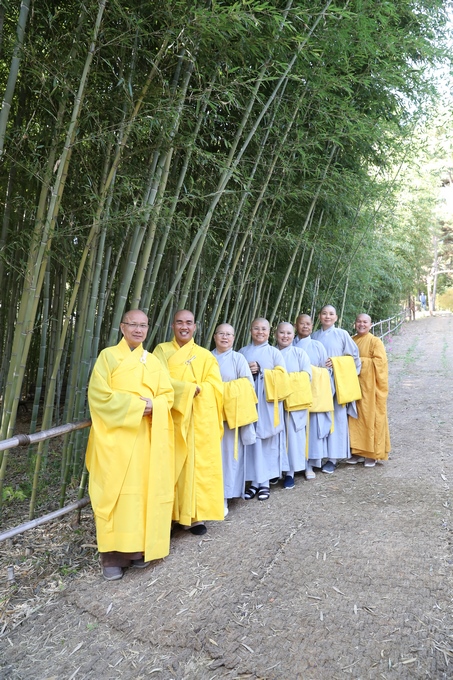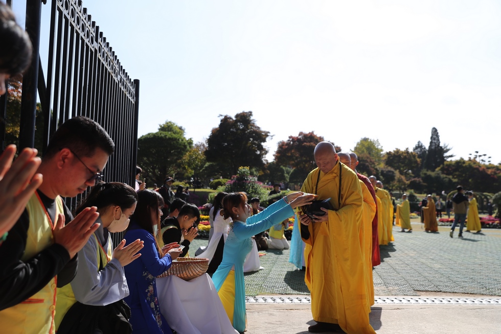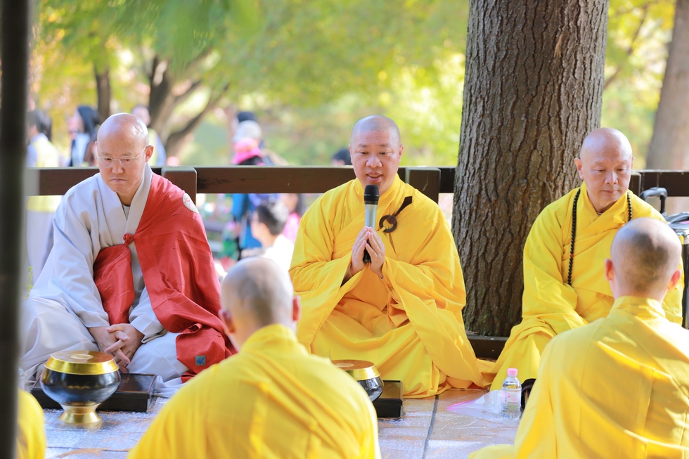 Hình ảnh Tăng đoàn thời Đức Phật ôm bình bát đi khất thực trang nghiêm và thanh tịnh cách đây hơn 26 thế kỷ, đã làm rung động biết bao con tim và tạo niềm tôn kính vô hạn từ bậc vua chúa cho đến hàng thứ dân trong xã hội Ấn Độ. Khung cảnh ấy được ghi chép lại trong những trang kinh hay sách sử, nay được tái hiện lại tại Thanh Nam Đài – nhà xanh ấm áp phía Nam của xứ sở Kim Chi này. Đẹp biết bao giữa tiết trời thu se lạnh, cảnh núi rừng thiên nhiên hùng vĩ và không khí trong lành ngập tràn sắc xanh của hàng trăm cây cổ thụ tươi tốt và thảm cỏ xanh trải dài rộng lớn, hoà cùng hơn 100 loài hoa rực rỡ hương sắc thắm, hồ nước Daecheong trong xanh như ngọc, với bình bát “Ứng lượng khí” trên tay, quý Ngài từng bước chân chánh niệm kinh hành trên con đường rợp bóng, vườn cúc nở rộ, ngập tràn hương thơm của cỏ hoa. Quỳ dọc hai bên đường, từng nhóm Phật tử với lòng tịnh tín bất động đối với Tam bảo, cầm trên tay những phẩm vật thành kính dâng lên cúng dường quý Ngài.