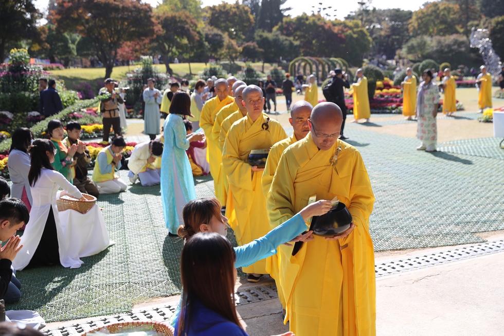 Đúng 11 giờ 30 chư Tôn Thượng toạ, Đại đức Tăng, Ni cùng 30 giới tử Sa Di, Sa Di Ni và 200 hành giả xuất phát đến quảng trường Hồ Thủy (Cheongnamde – Thanh Nam Đài, Hàn Quốc). Quý tôn đức Tăng Ni cùng các Giới tử Sa Di, Sa Di ni phát tâm xuất gia gieo duyên, uy nghiêm trong màu huỳnh y giải thoát, theo dấu chân Phật thực hiện nghi thức Cổ Phật khất thực tại vườn cúc Quảng trường Hồ Thủy.