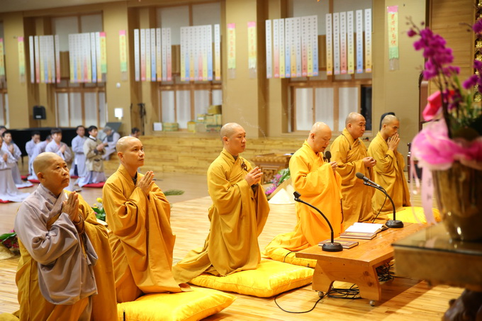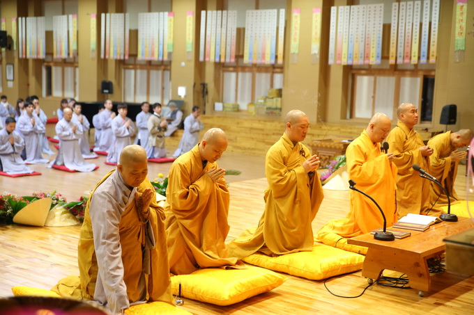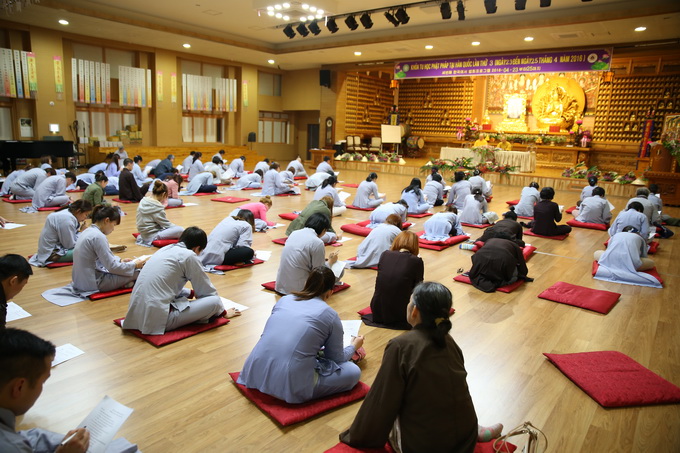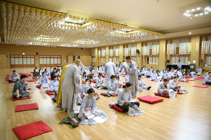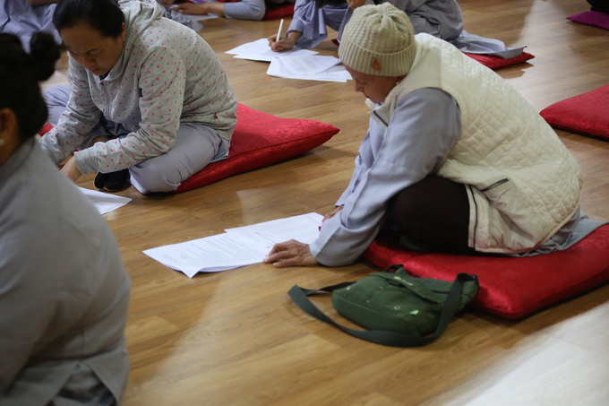 Trong khoảng thời gian cuối ngày các hành giả được chư Tôn đức giáo thọ hướng dẫn thi giáo lý. Nội dung các câu hỏi xoay quanh giáo lý cơ bản giúp các hành giả ôn lại kiến thức đã học và ôn những giáo lý chưa biết thông qua đề tài trắc nghiệm. Phần thi này có 50 câu, các thí sinh thực hiện hoàn tất trong thời gian 30 phút. Tuy không có bàn ghế ngồi nhưng với nhiệt huyết cầu học các hành giả chuyên nhất vào từng câu hỏi và trả lời đáp án. Trong khóa tu này đa phần các anh chị em Phật tử trẻ tuổi người Việt Nam sang Hàn quốc hợp tác lao động hoặc theo diện hôn nhân, việc làm rất vất vả nhưng các Phật tử vẫn cố gắn hết khả năng, dành nhiều thời gian để tu tập và học hỏi giáo lý.