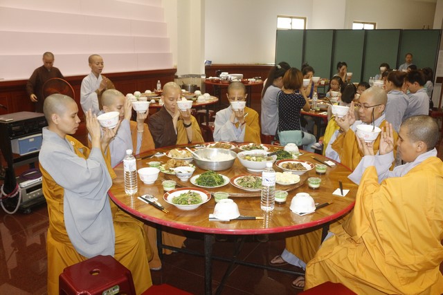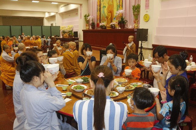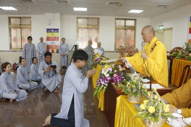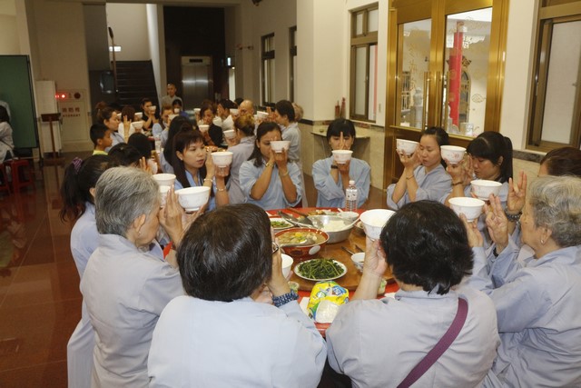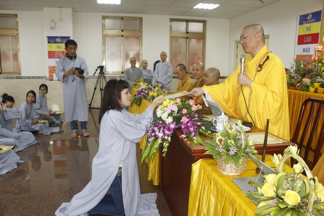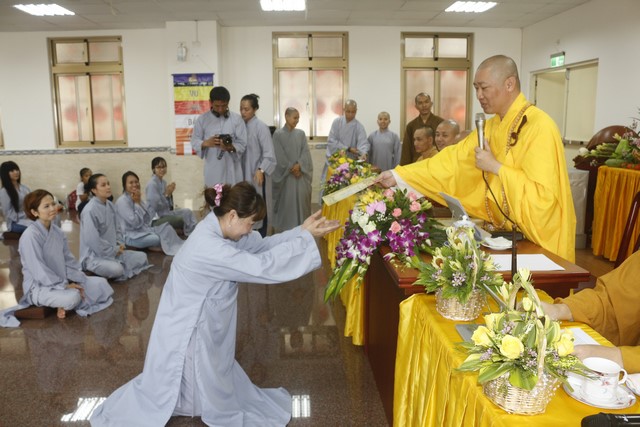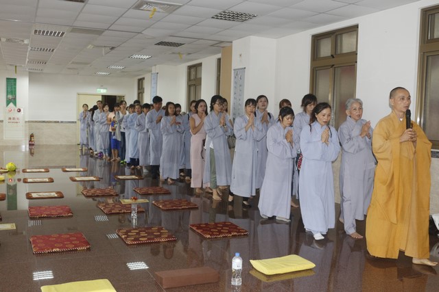 Đúng 8 giờ sáng ngày 09 tháng 09, khóa tu Bát quan trai chính thức được cử hành, có khoảng gần hai trăm Phật tử hiện đang sinh sống tại Đài Loan về tham dự. Mở đầu là lễ Quy y Tam Bảo, trong khóa tu này, Thượng tọa đã truyền tam quy – ngũ giới diễn ra trang nghiêm và tràn đầy xúc cảm cho hơn sáu mươi vị, trong đó có cả những vị là người Đài Loan. Có những giọt nước mắt lặng lẽ tuôn rơi của những người con tha hương vừa như bày tỏ nỗi niềm chua xót cho thân phận lạc lõng, bơ vơ nơi đất khách, vừa như trào dâng niềm hạnh phúc vô biên vì đã có một nơi chốn an toàn để quay về nương tựa, đó là ba ngôi báu Phật – Pháp – Tăng.